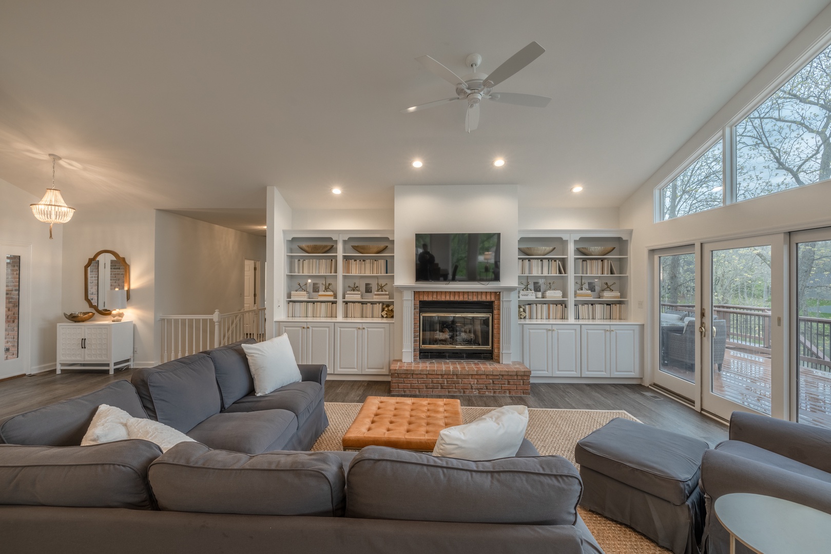 Custom, built-in shelving surround the fireplace and provide a modern, yet cozy touch in the center of the home