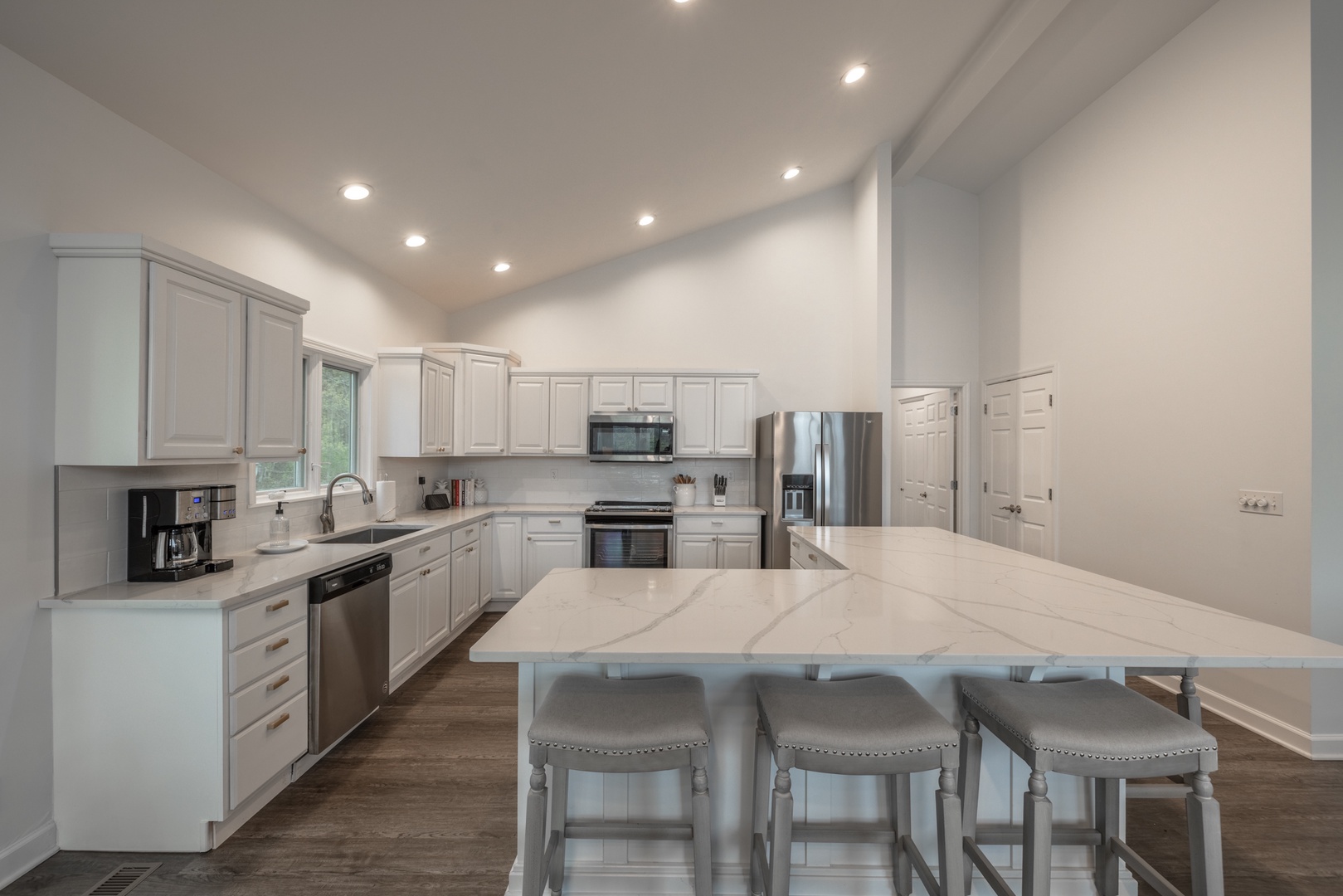 • A fully equipped kitchen with all cooking utensils included, stainless steel appliances, and a beautiful L-shaped island with barstool seating.