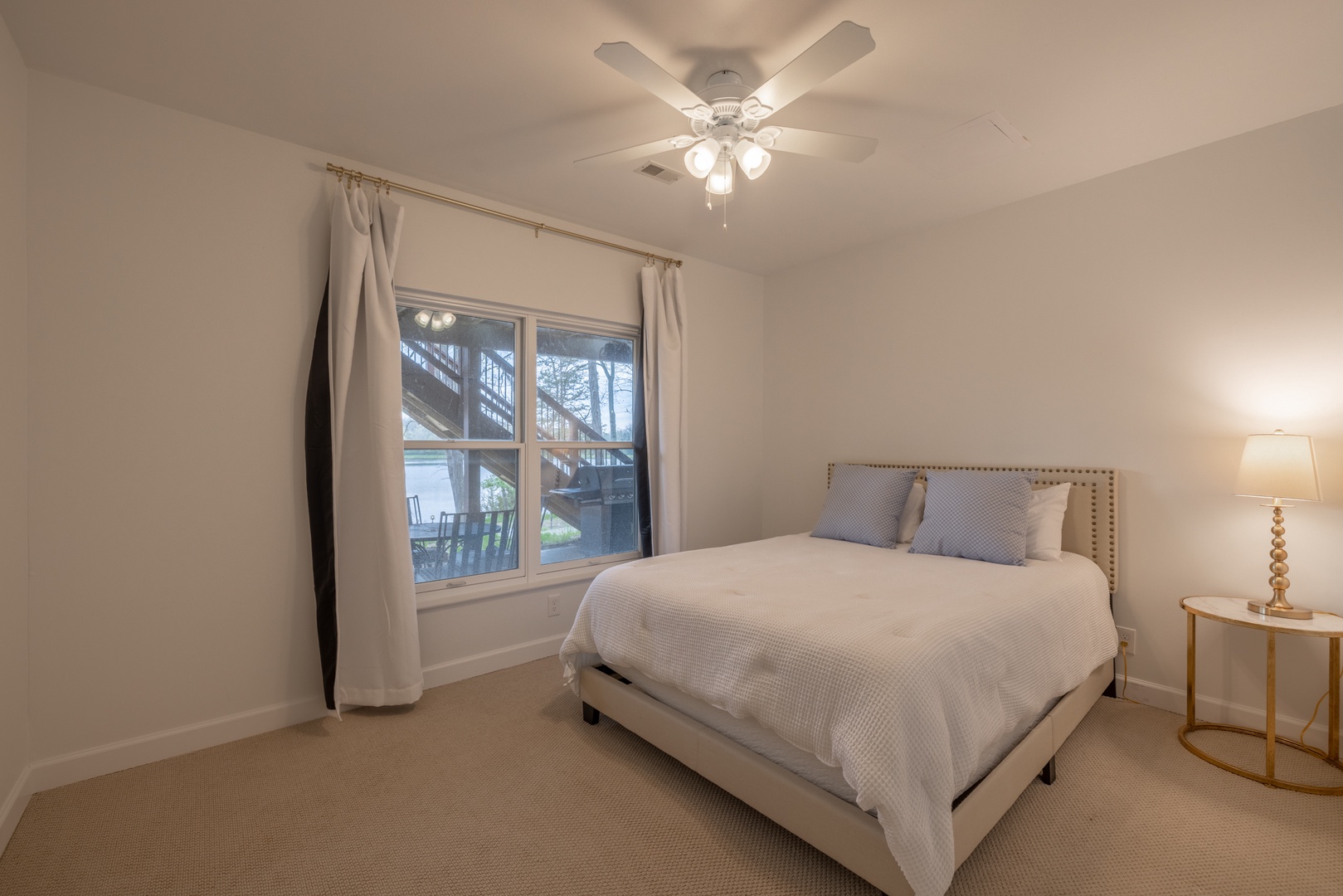 Just downstairs, the third guest bedroom contains one queen bed and gorgeous views of the outdoors
