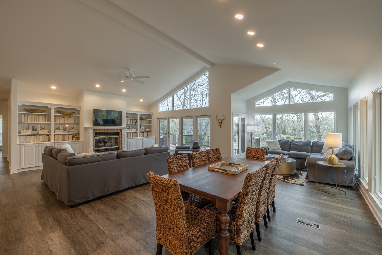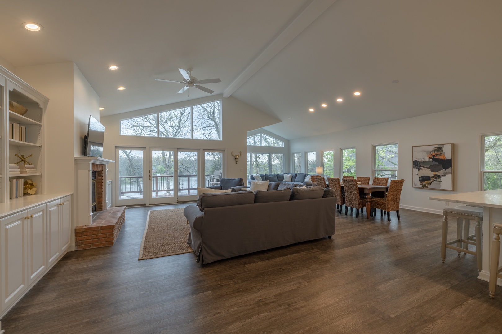 Vaulted ceilings and oversized windows allow natural lighting to grace the entirety of the open, airy living space