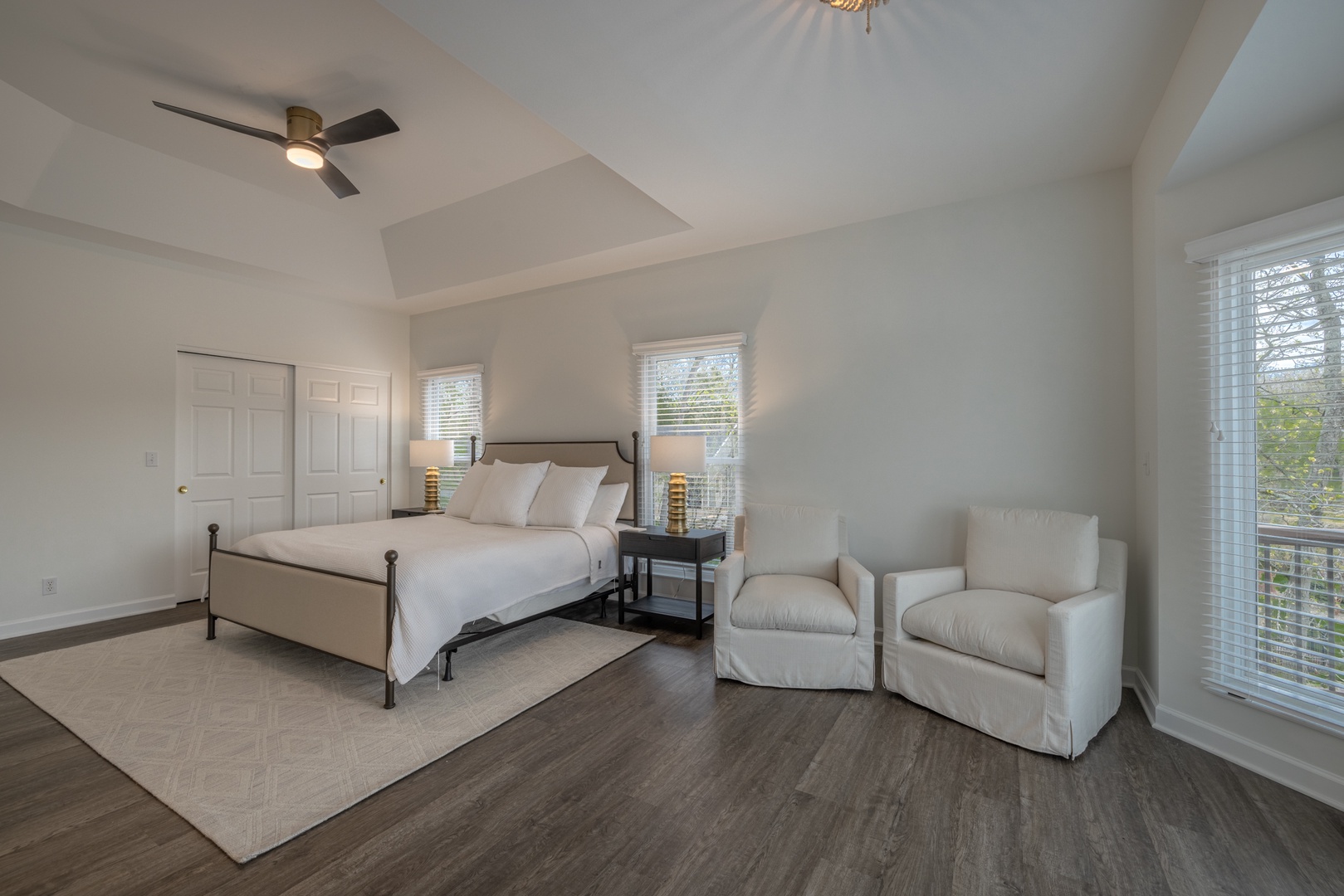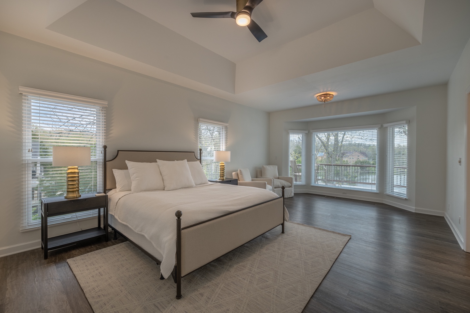 The beautiful primary suite outfitted with one king bed and amazing views of Lake Charrette