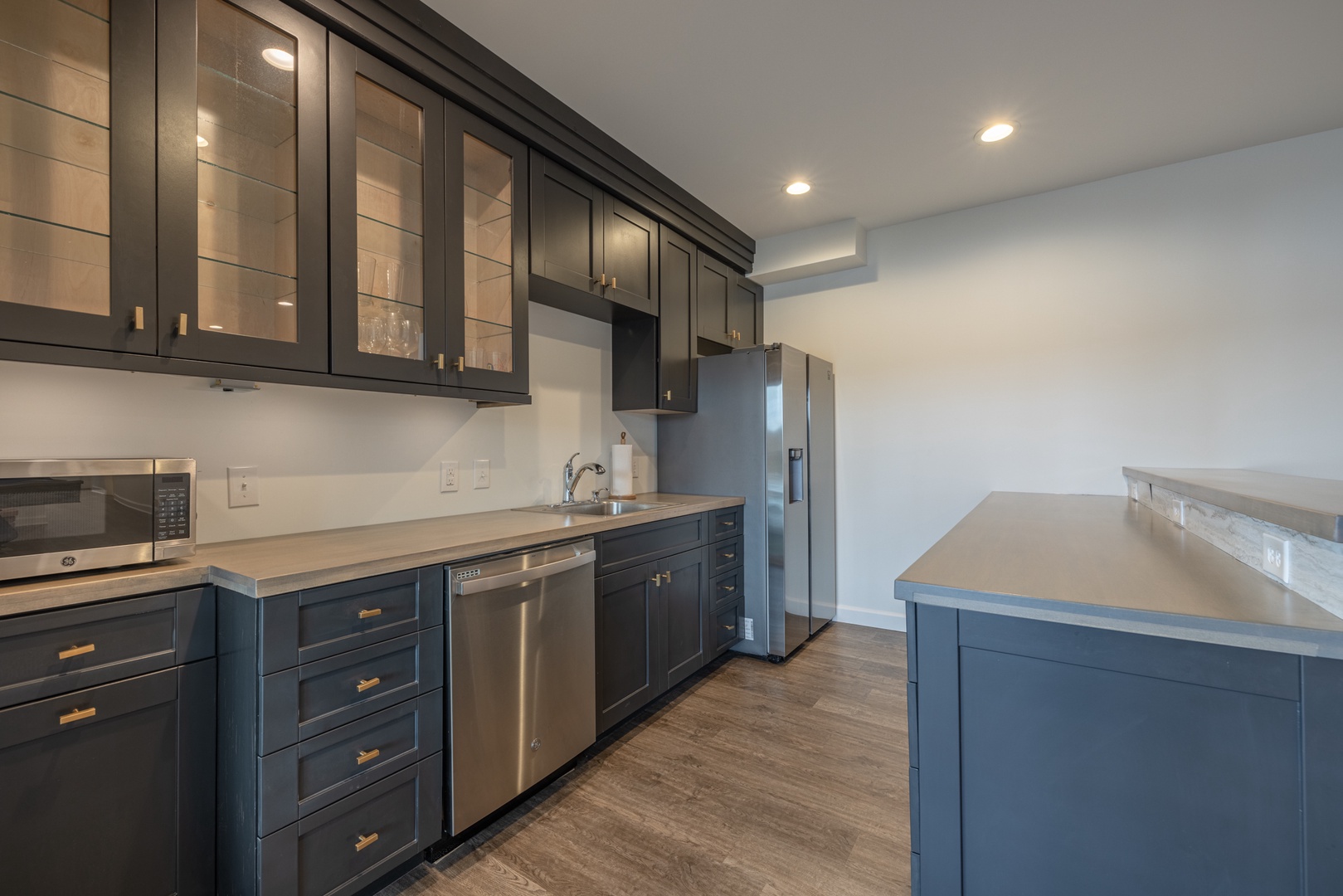 A full kitchen/bar area complete with stainless steel appliances and custom countertops in the lower makes it the ultimate hangout spot