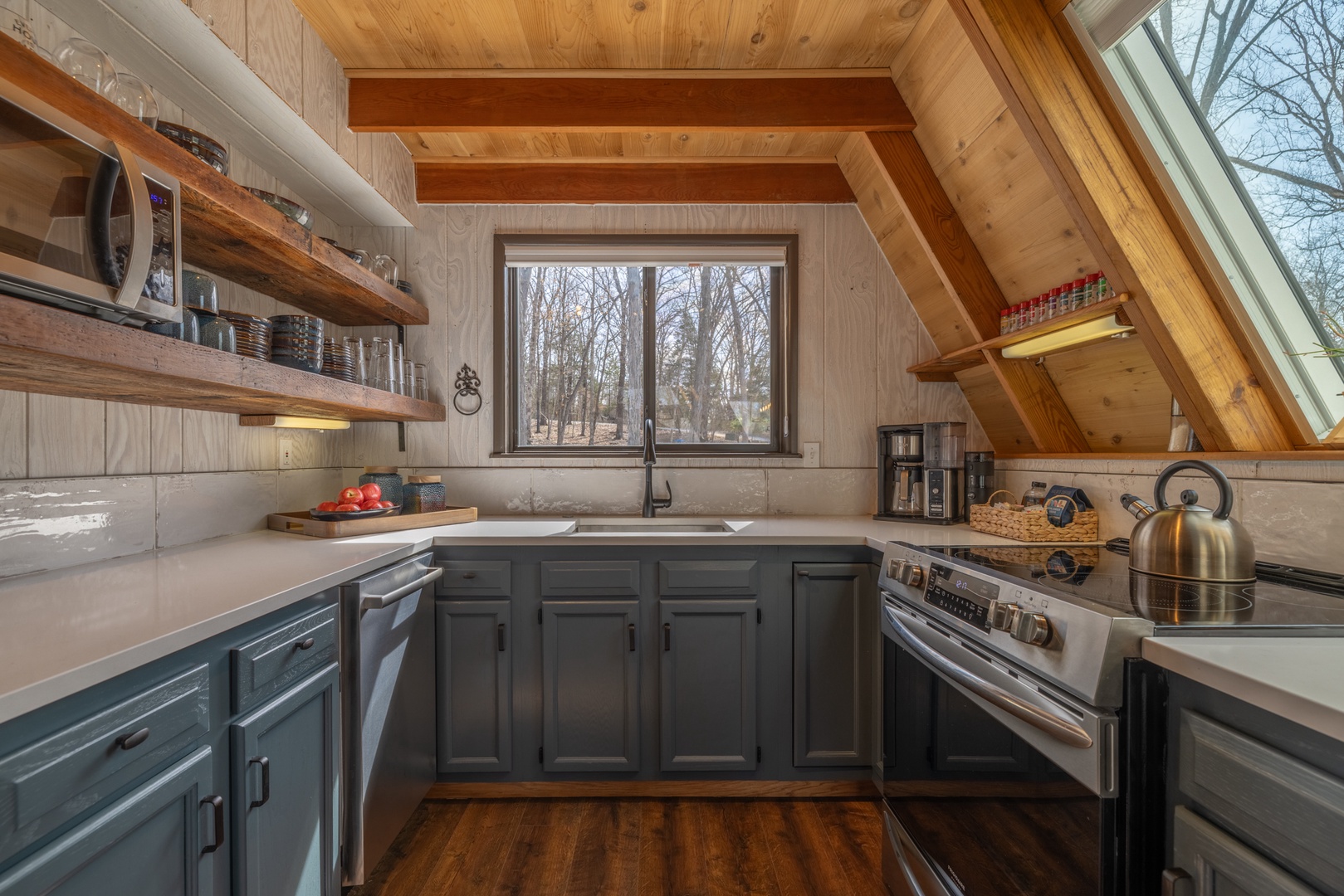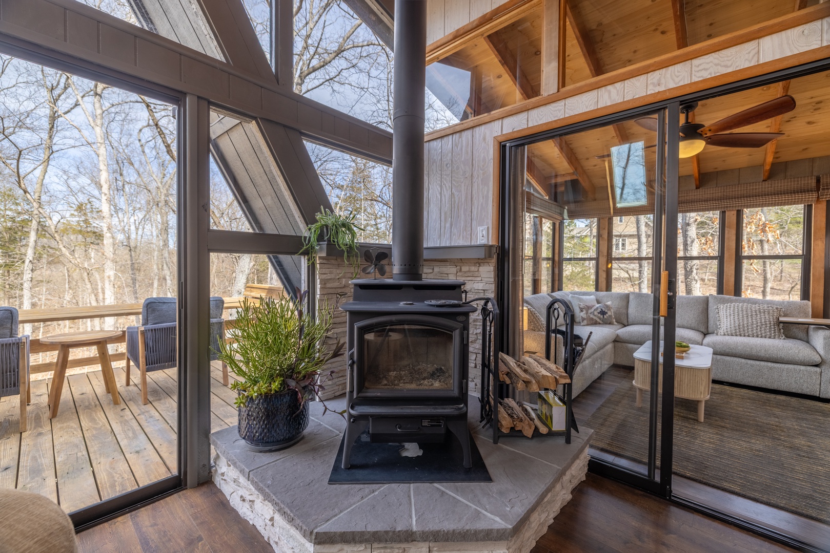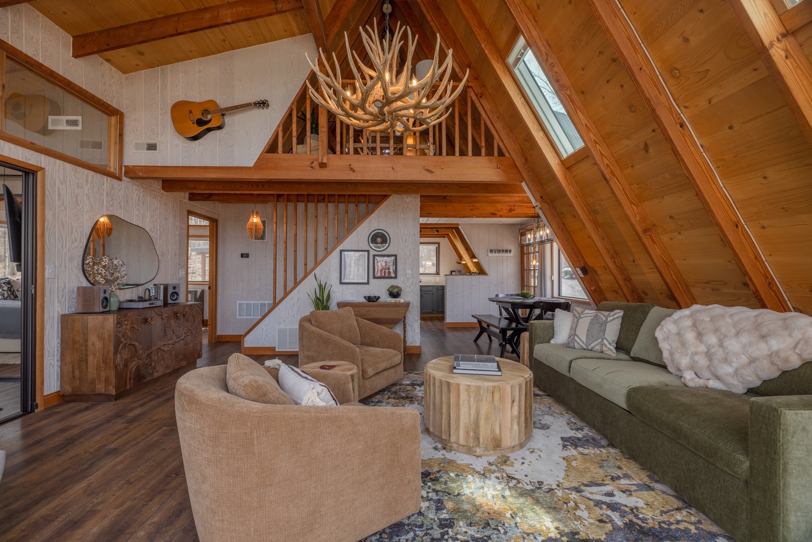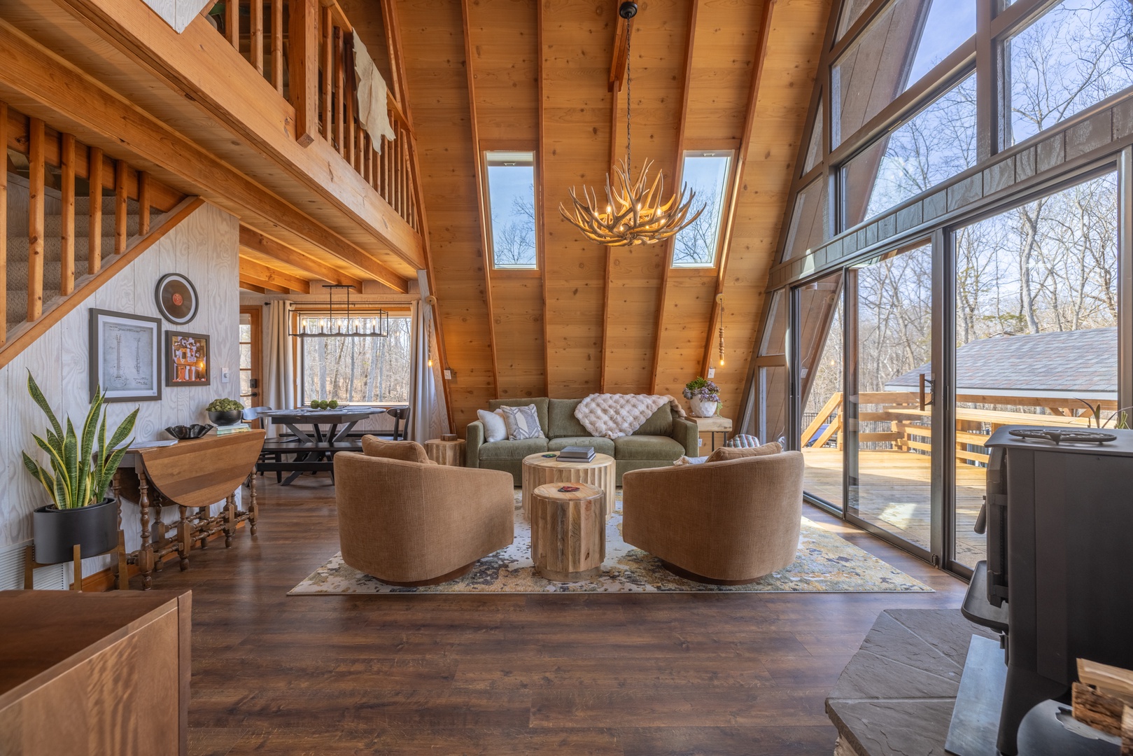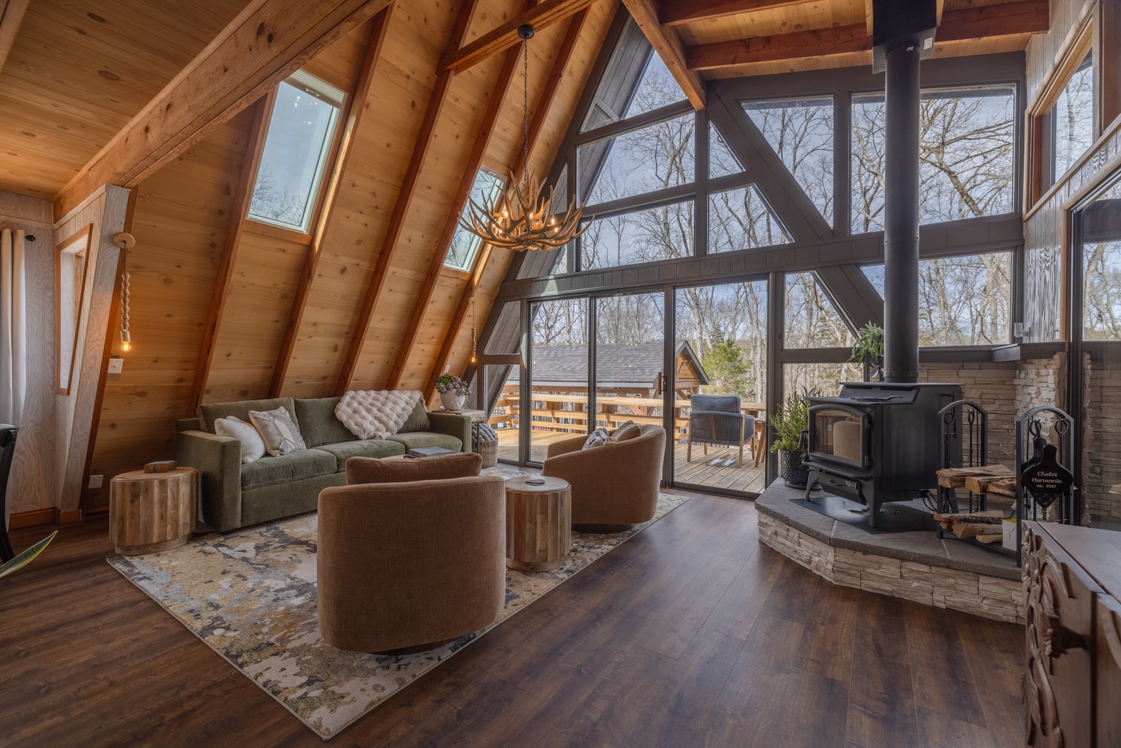 Inside, the chalet blends modern elegance with cozy charm. The spacious living room is the heart of the home, featuring a wood-burning fireplace perfect for curling up on cool evenings. Whether you're sipping coffee as the sun rises or unwinding after a day of exploring, every corner feels warm, inviting, and thoughtfully designed.