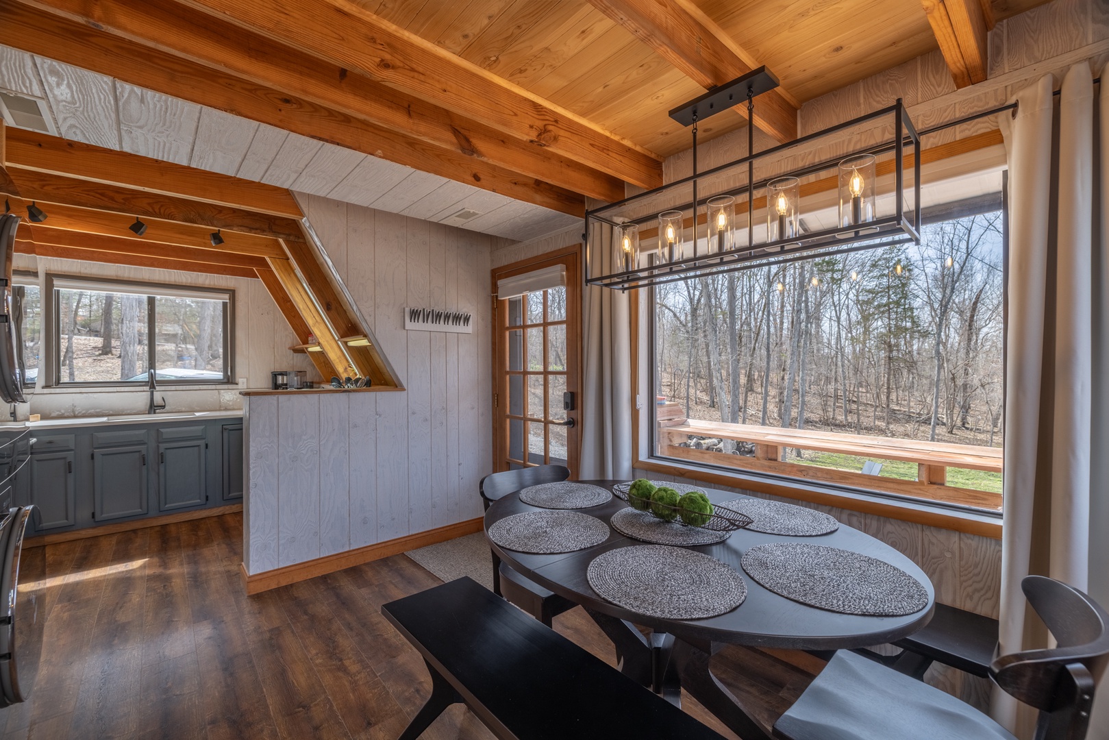 The fully equipped kitchen and separate dining area make shared meals a highlight of your stay—whether it’s a casual breakfast or a celebratory dinner. Just beyond, the sunroom offers a peaceful escape, with cozy seating and panoramic views that make it the perfect spot to read, relax, or reconnect.