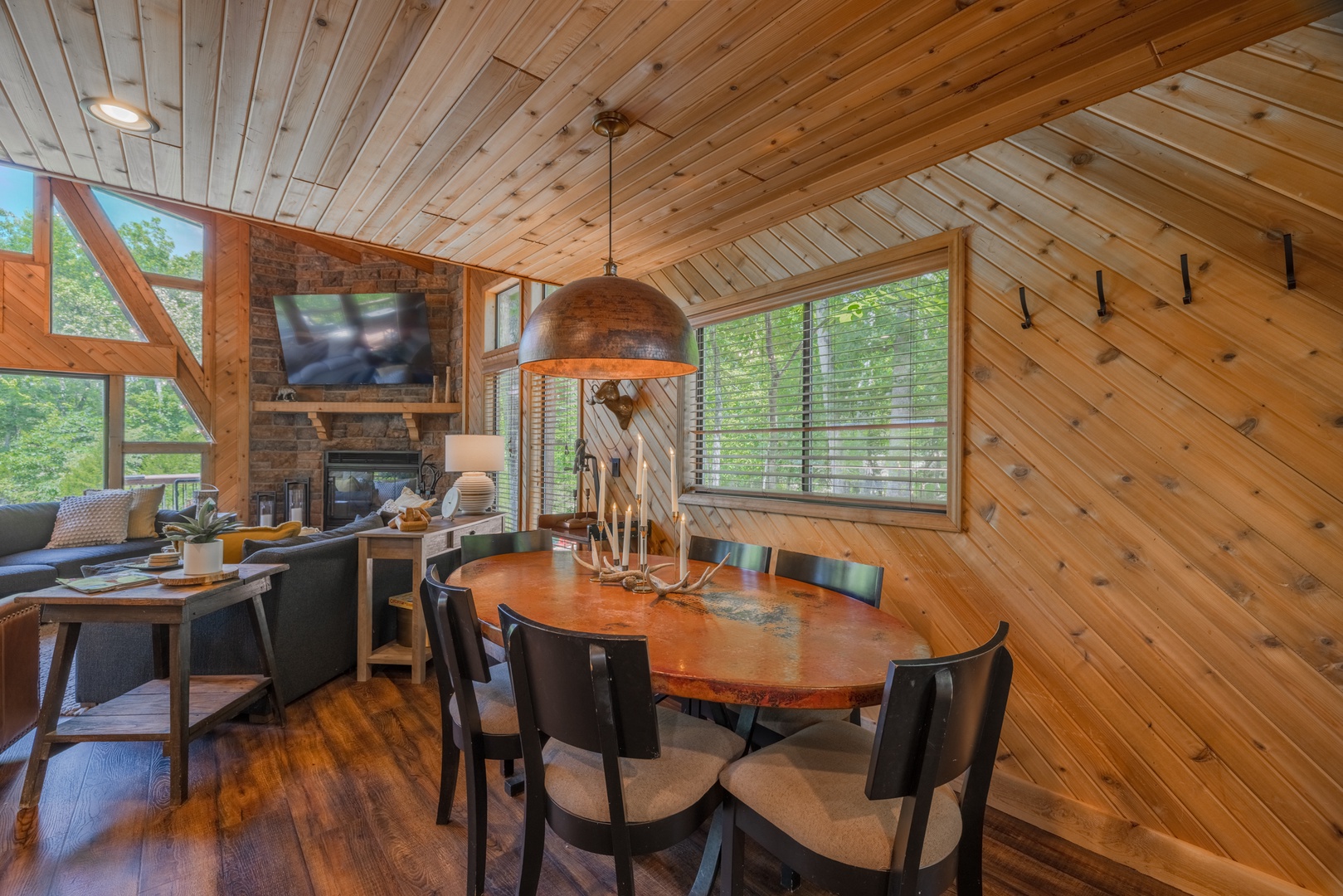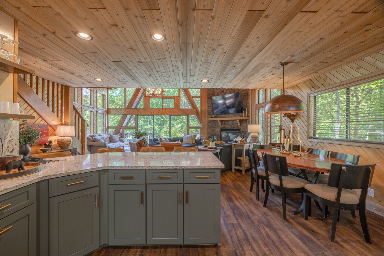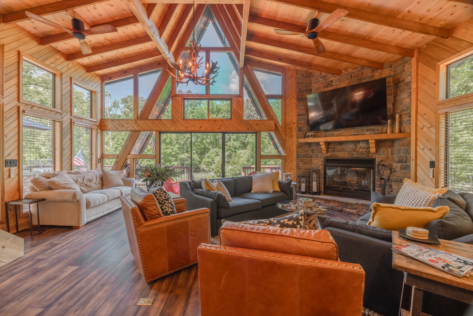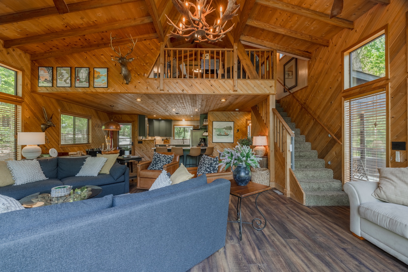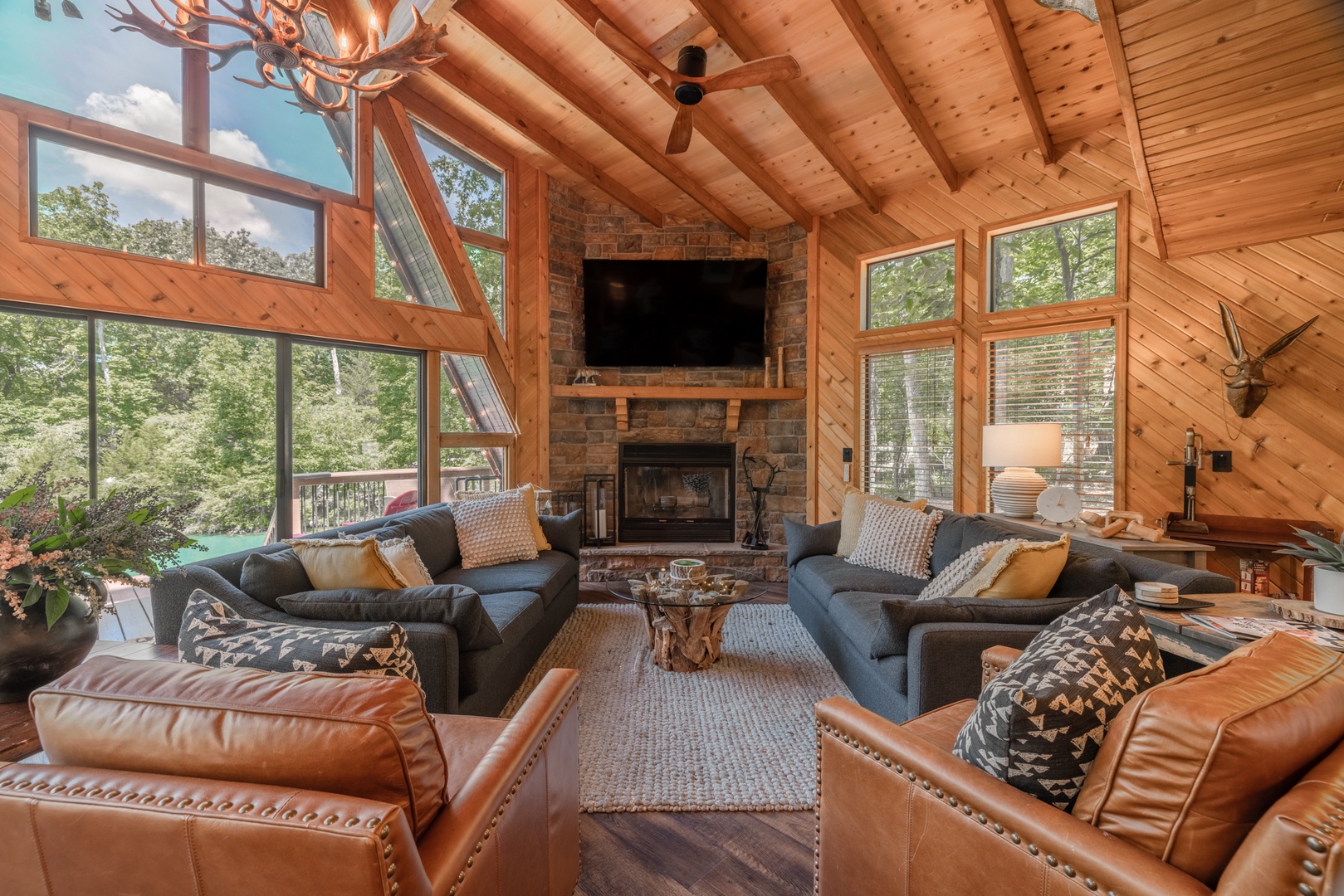 Escape to the heart of Innsbrook Resort and enjoy the perfect blend of comfort, nature, and relaxation at this spacious and beautifully appointed 3-bedroom, 2-bathroom chalet. Designed to accommodate up to 12 guests, this lakefront retreat is ideal for family gatherings, group getaways, or a peaceful weekend surrounded by nature. The open floorplan features a cozy living area with a stone wall wood-burning fireplace, plush seating, a smart TV, and sliding glass doors that lead to an expansive back deck overlooking a private pond.