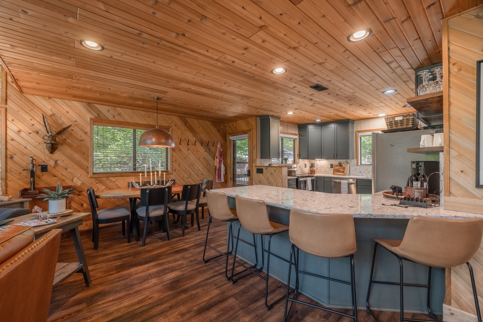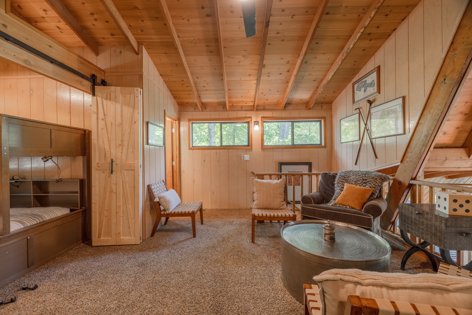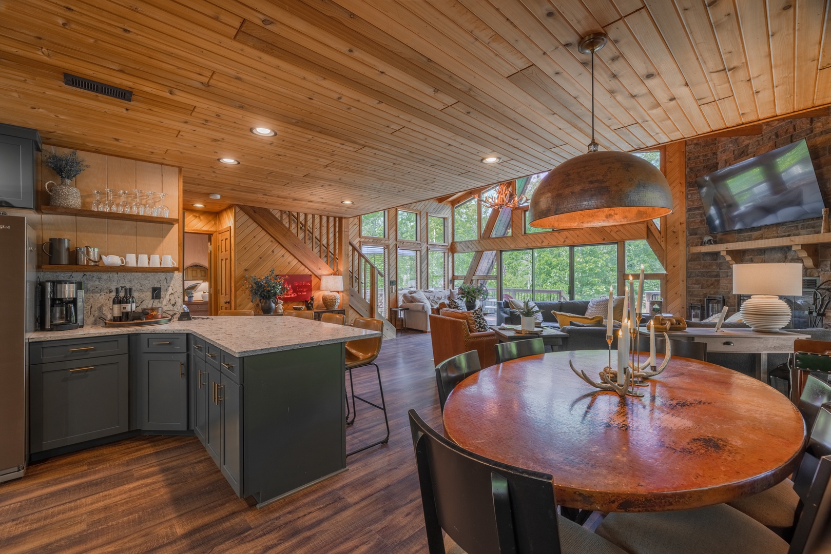 The fully equipped kitchen includes all the cooking essentials plus an elongated breakfast bar with barstool seating, making it easy to enjoy meals together. A separate dining area provides ample space for group dinners, while the upstairs loft offers a quiet sitting nook, access to two additional bedrooms, and a full bathroom. The sleeping arrangements include a main-level primary bedroom with a queen bed, a second upstairs queen bedroom, and a third upstairs bunk room with two sets of bunk beds (2 queens and 2 twins)—perfect for kids or additional guests.