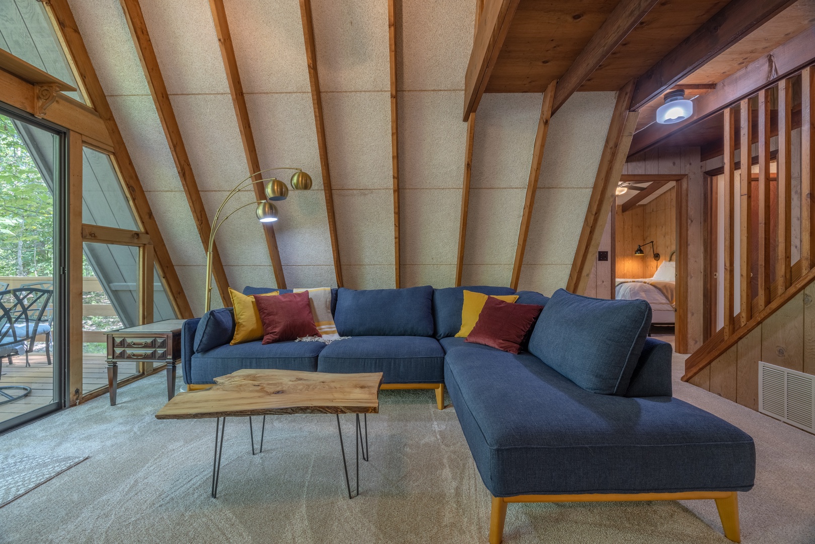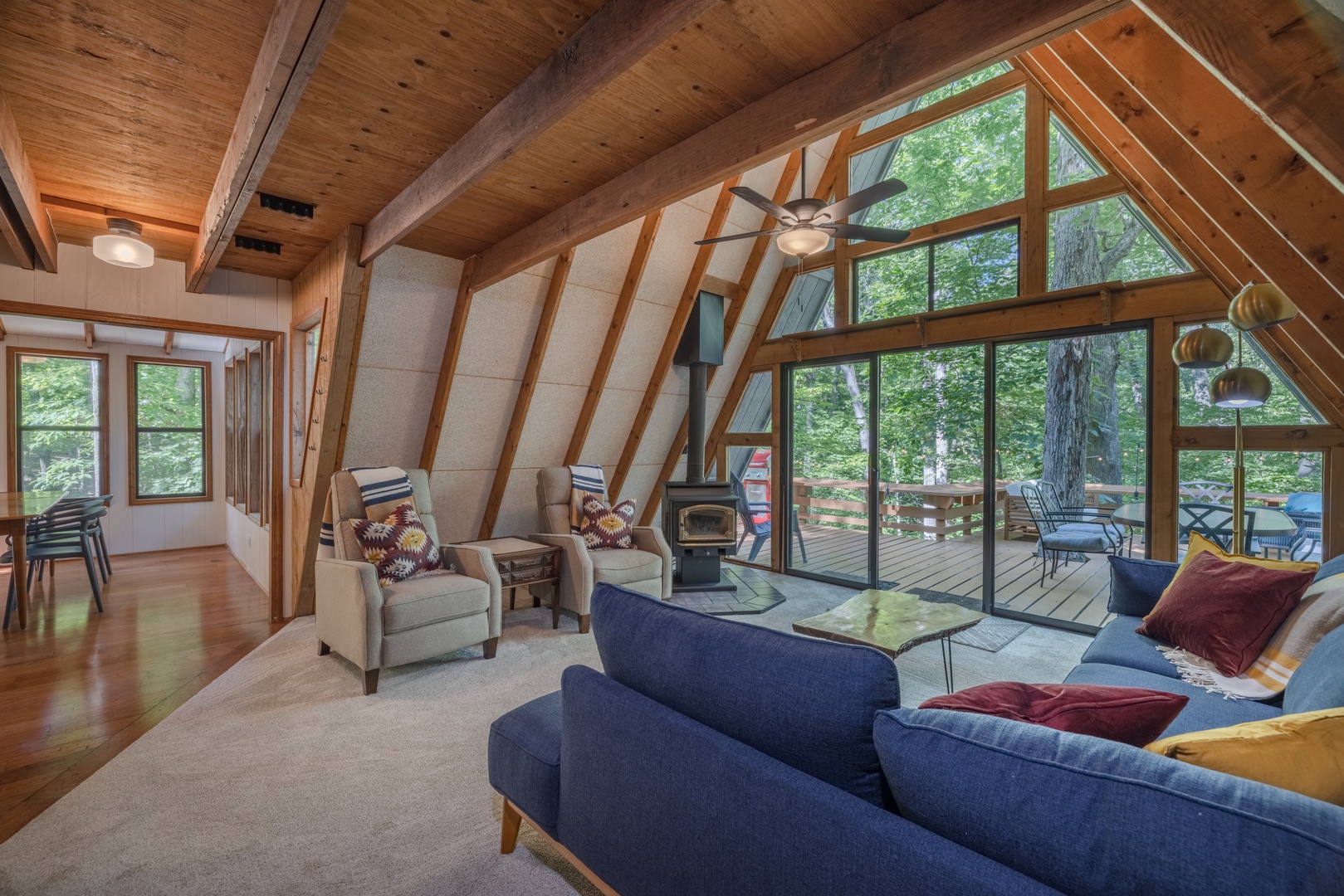 • Roomy living area with a wood-stove, oversized furniture, and sliding glass doors to the back deck