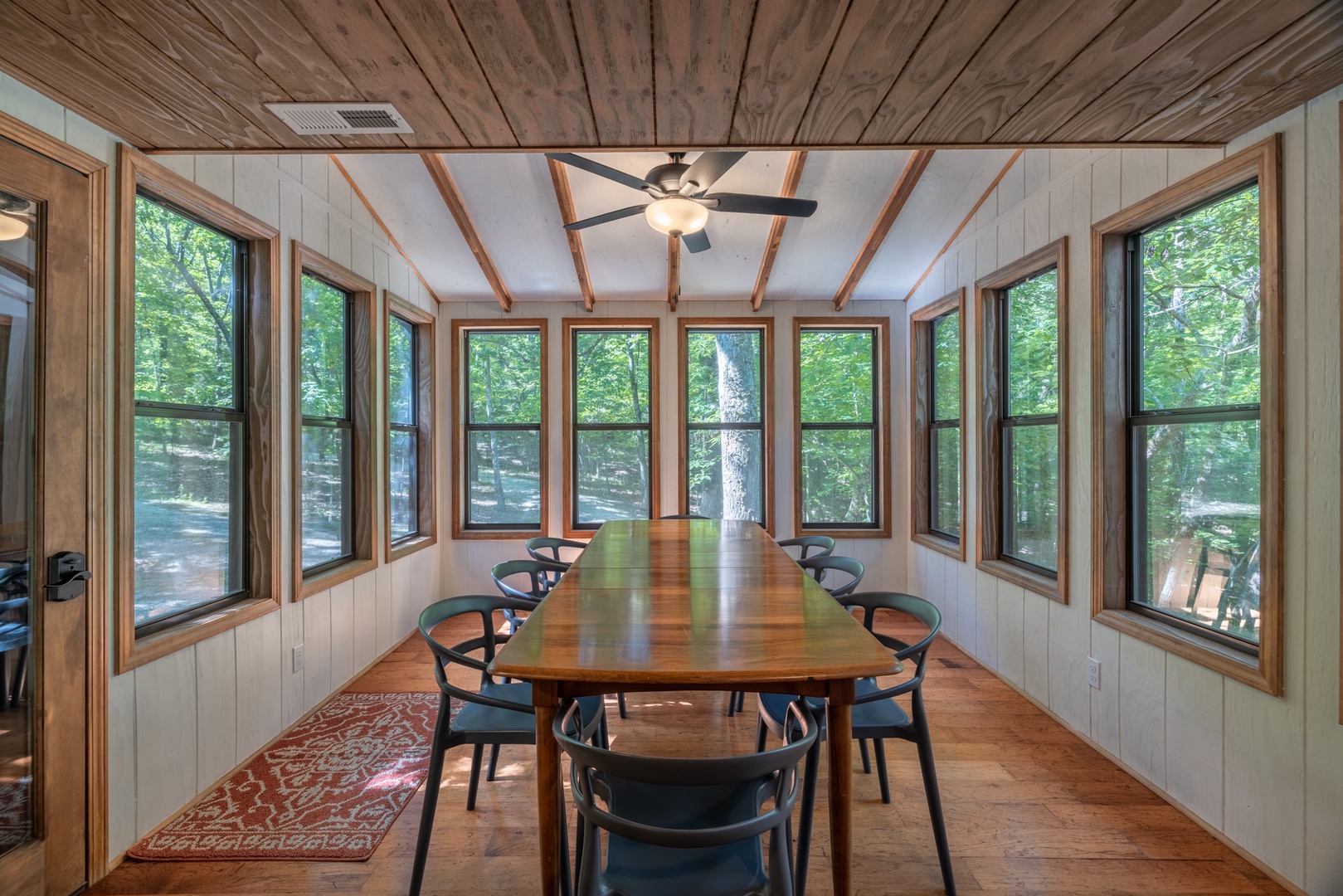 Once inside, guests are greeted with vaulted ceilings lined with cedar beams, a wall of elongated windows allowing natural light to seep through the interior, and walkout access to the expansive deck overlooking the woodland oasis below. Outfitted with a large fully equipped kitchen, open living area, dining room with panoramic views, and indoor and outdoor entertainment areas, your well-deserved private getaway is destined to create lasting memories!