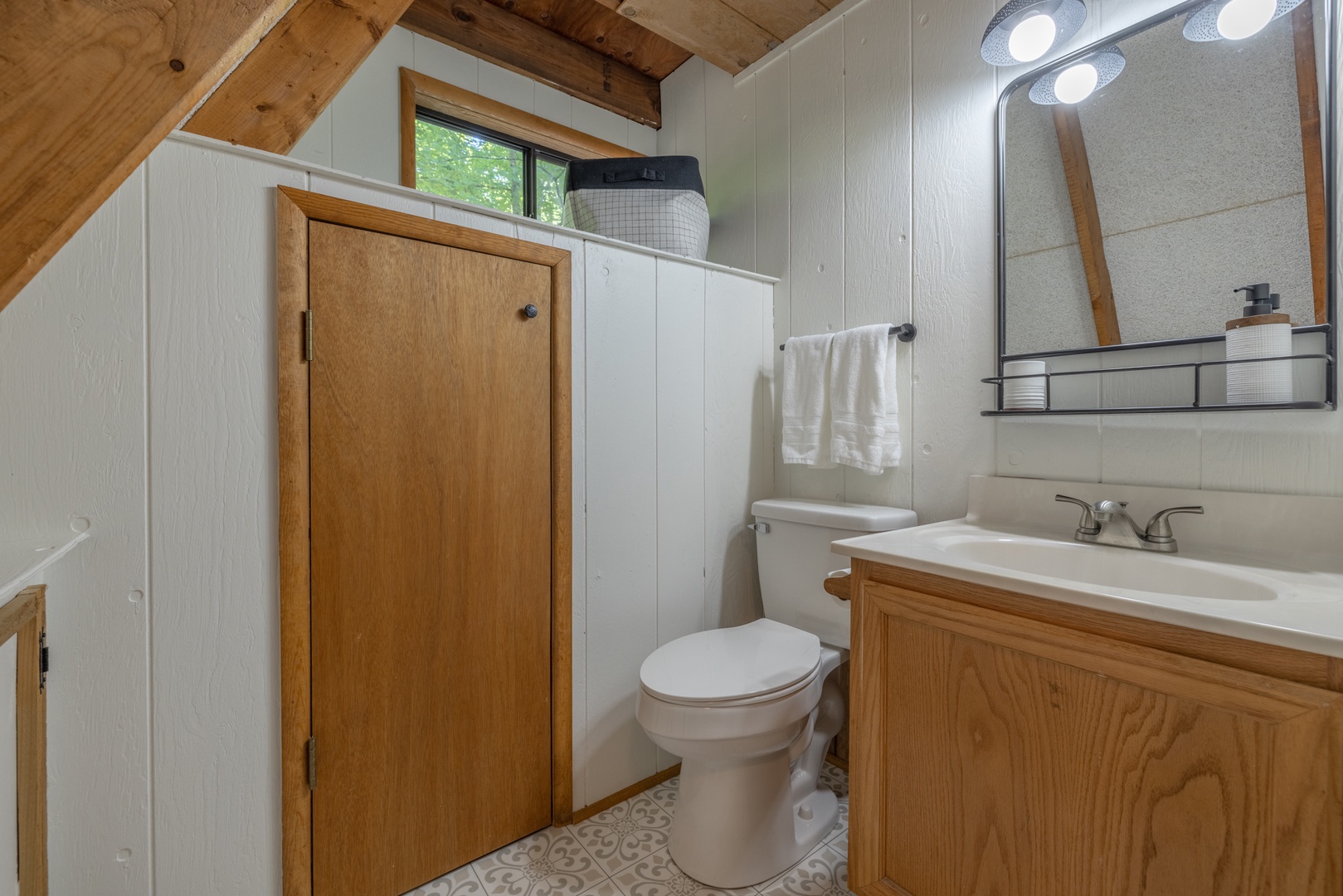 • Private primary bedroom on the main level with one king bed is ensuite.