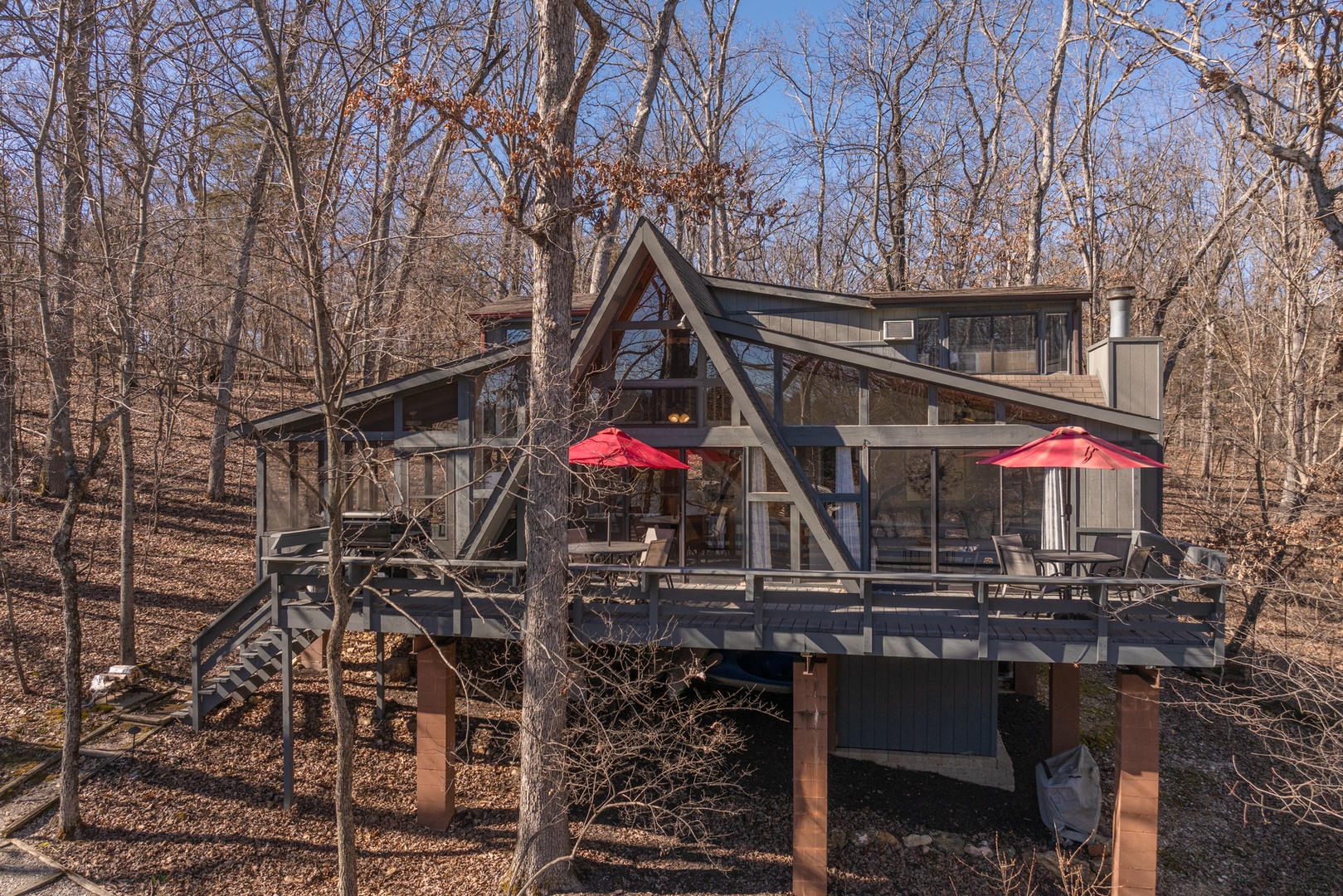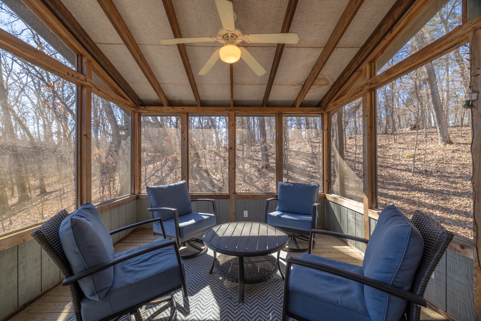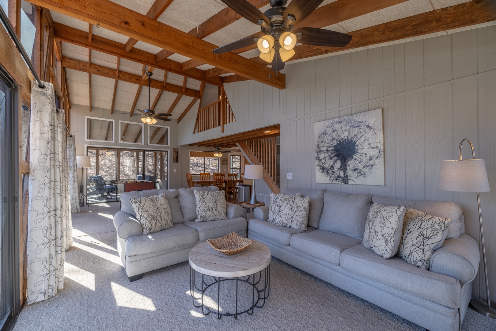 • Main living area – expansive living space with comfortable furniture, wood burning fireplace, TV, and surrounded by expansive windows offering incredible views of the outdoors