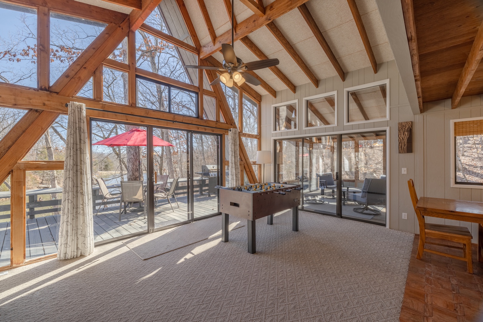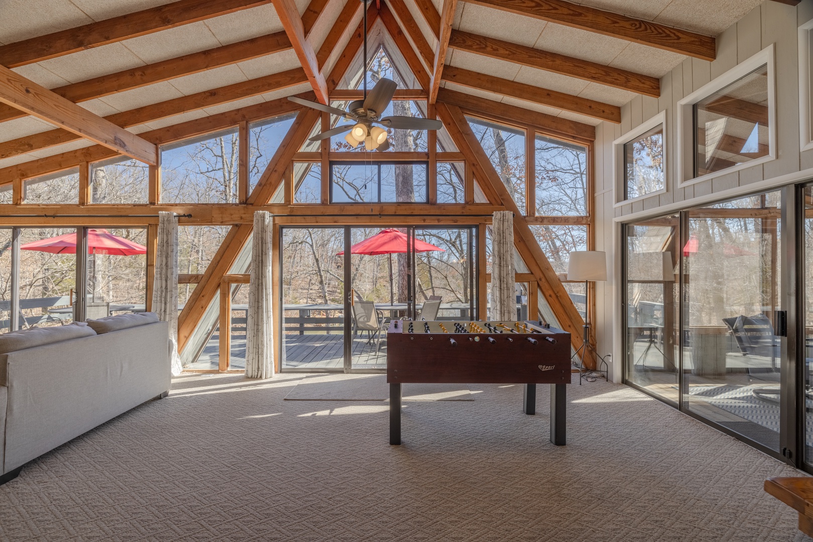 Entertainment & Outdoor Bliss: The loft area provides a flexible space for additional relaxation or play, while the foosball table adds a fun touch for friendly competition. When you're ready to take in the outdoors, gather around the outdoor fire pit area for unforgettable evenings under the stars.