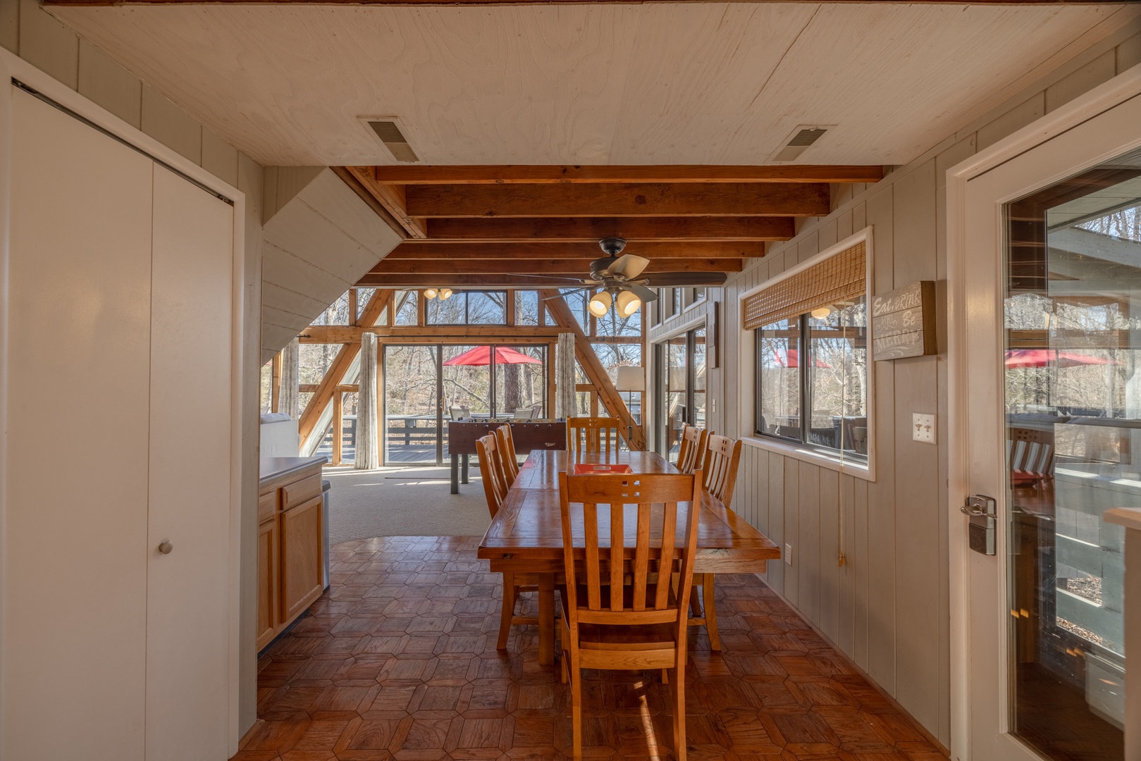 Exquisite Living Spaces: The open floor plan seamlessly blends the living, dining, and kitchen areas, providing an expansive environment for entertaining and unwinding. The main living area is a masterpiece, featuring comfortable furniture, a wood-burning fireplace that sets the mood for cozy nights, and a TV for your entertainment. Large expansive windows surround the space, allowing you to enjoy panoramic views of the lush outdoors from every angle.