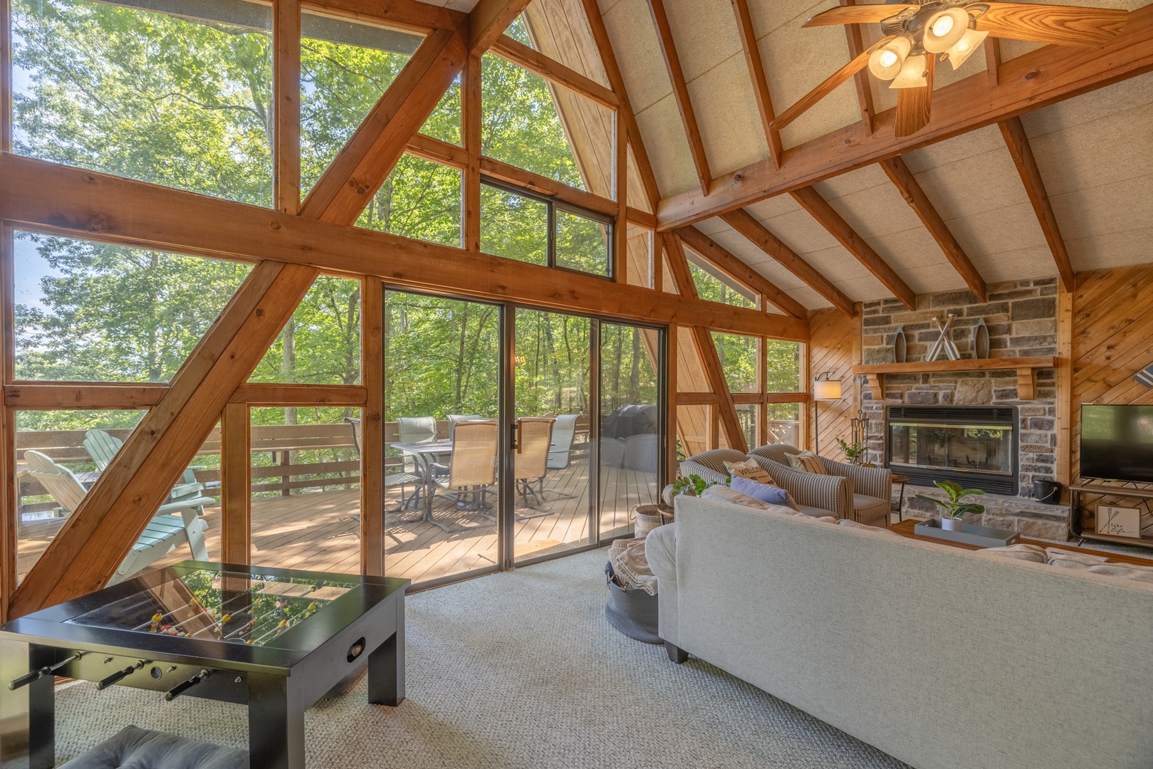 • Roomy living area with a stone wall wood-burning fireplace, cozy furniture, smart TV, and sliding glass doors to the back deck