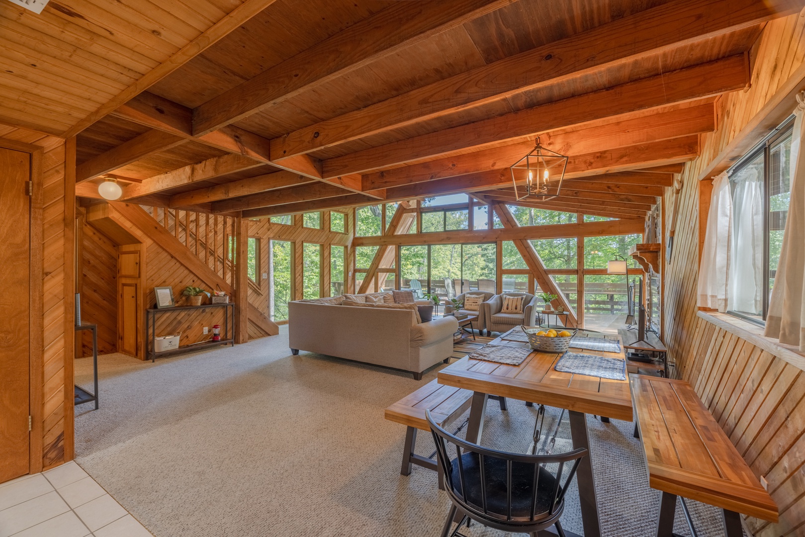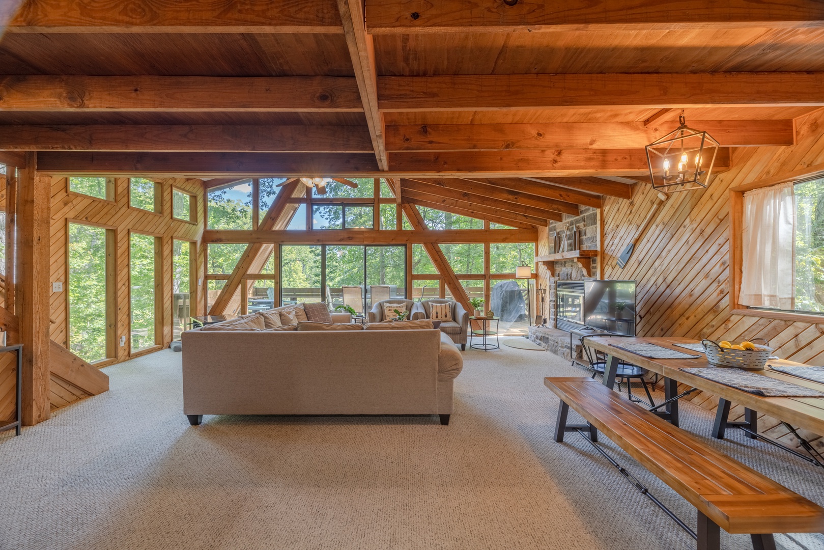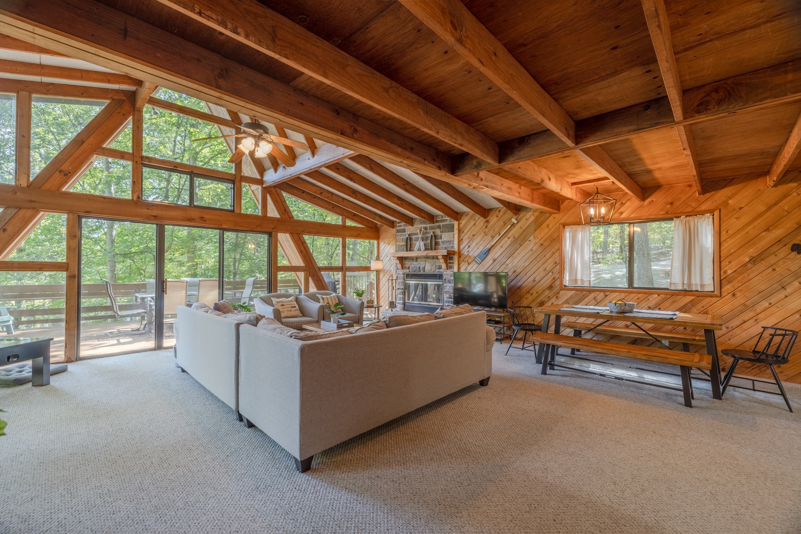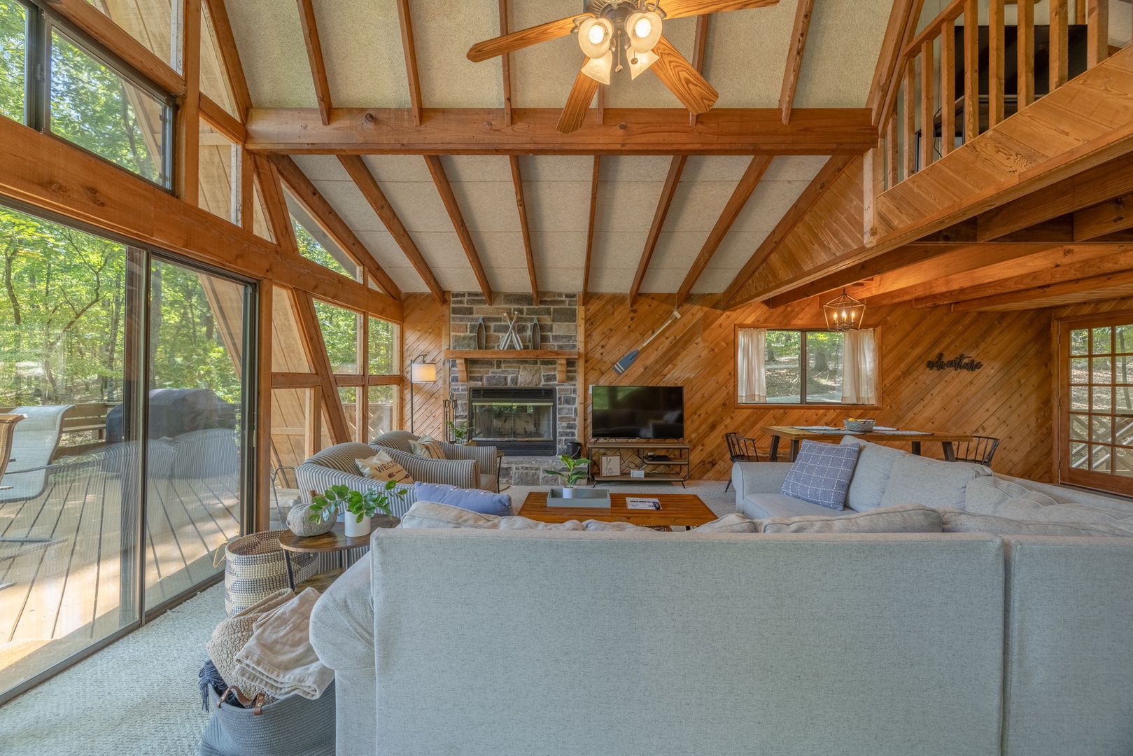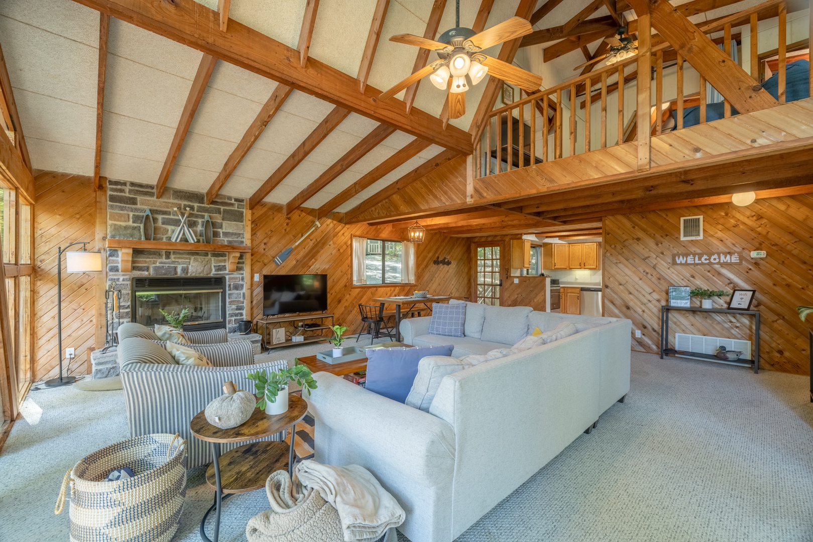 Step inside and you’ll find an open floor plan with a roomy living area featuring a stunning stone wall wood-burning fireplace, cozy furnishings, a smart TV, and sliding glass doors that open to the expansive back deck. The fully equipped kitchen has everything you need for home-cooked meals, while the separate dining area provides plenty of space for gathering and sharing stories from the day. Upstairs, the loft area offers additional living space with a smart TV, and three twin beds—perfect for kids or extra guests.