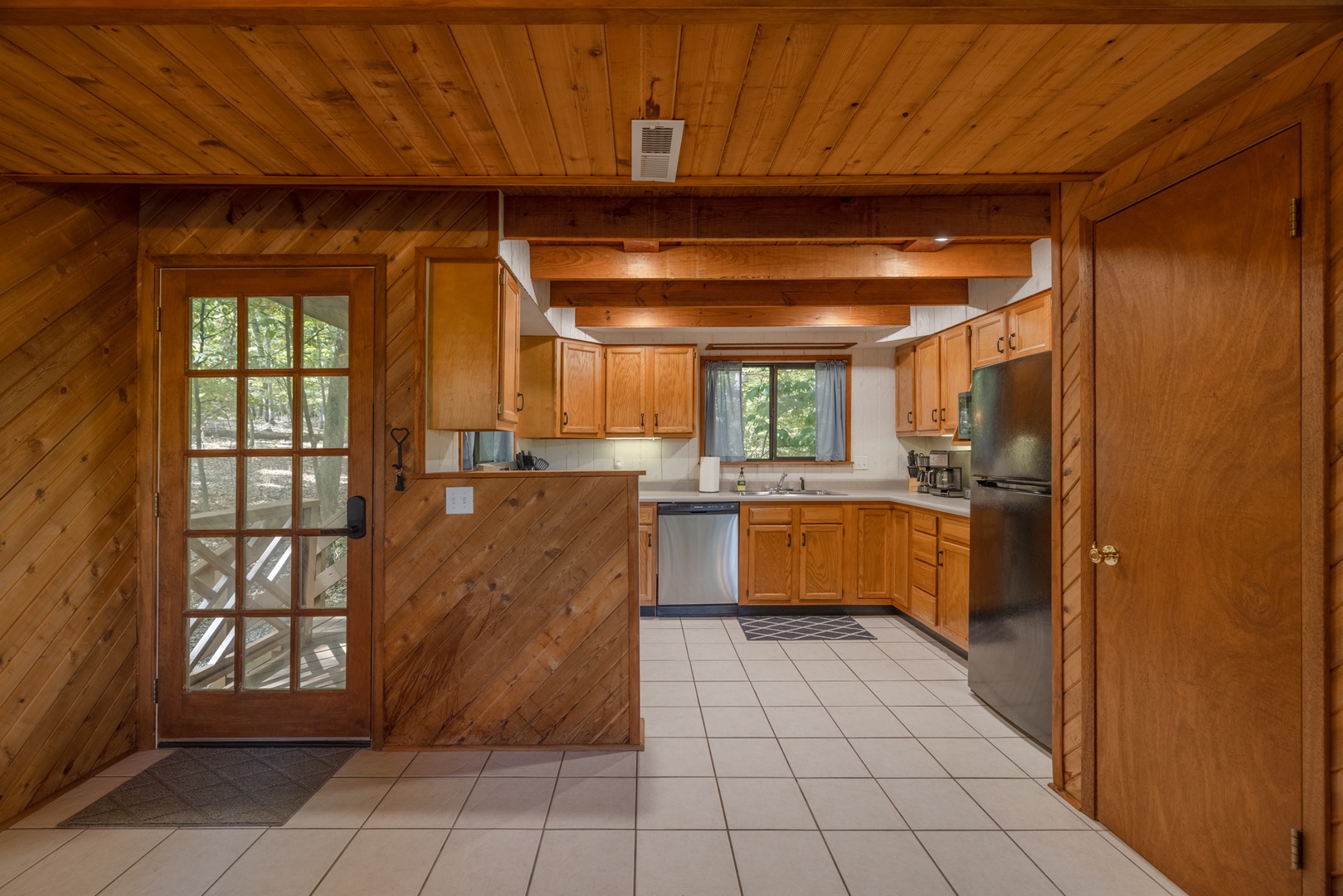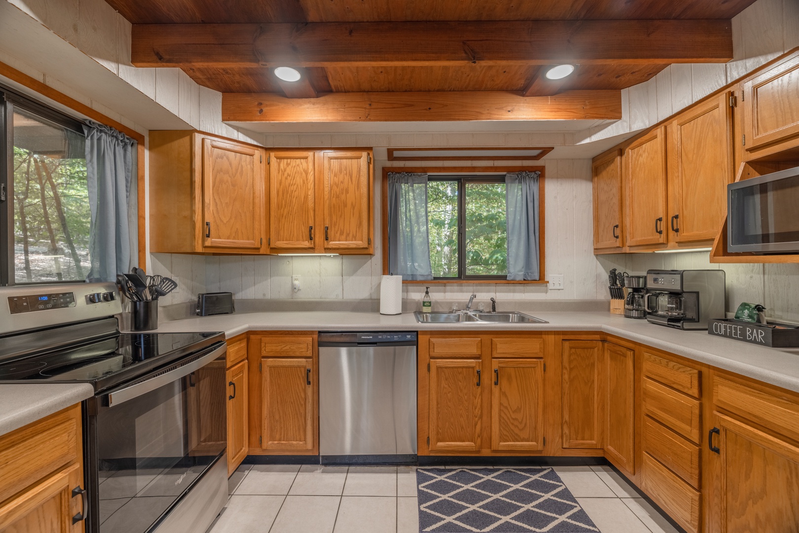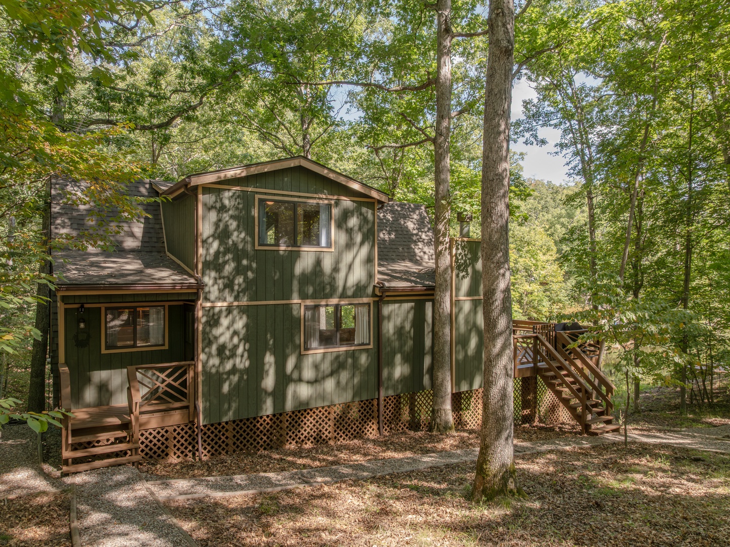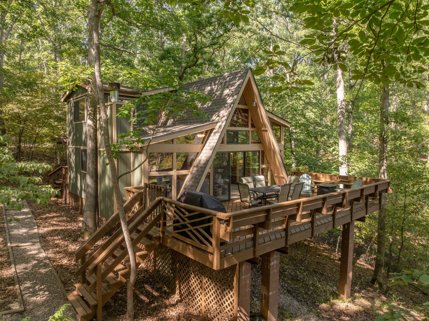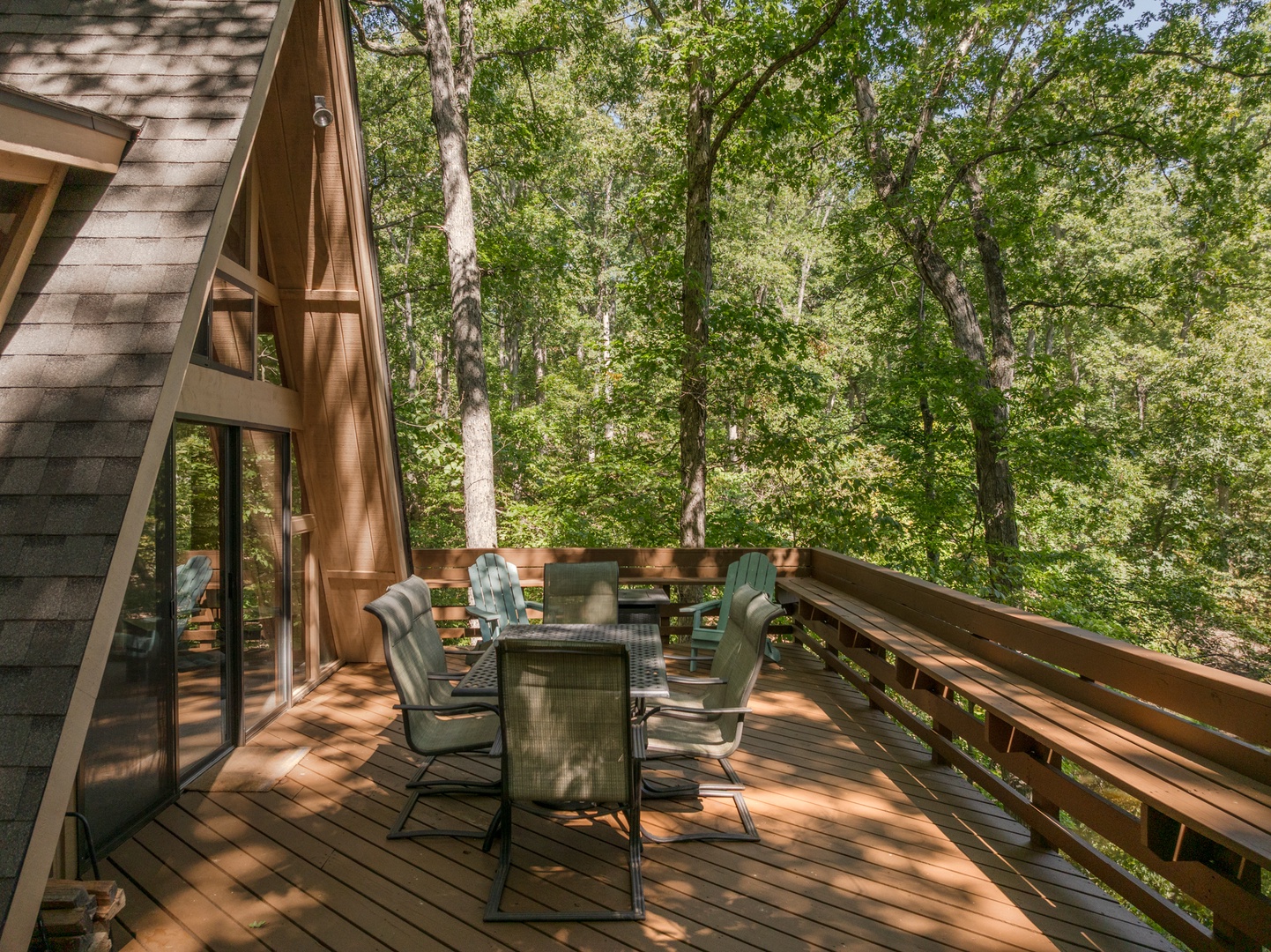 Step inside and you’ll find an open floor plan with a roomy living area featuring a stunning stone wall wood-burning fireplace, cozy furnishings, a smart TV, and sliding glass doors that open to the expansive back deck. The fully equipped kitchen has everything you need for home-cooked meals, while the separate dining area provides plenty of space for gathering and sharing stories from the day. Upstairs, the loft area offers additional living space with a smart TV, and three twin beds—perfect for kids or extra guests.