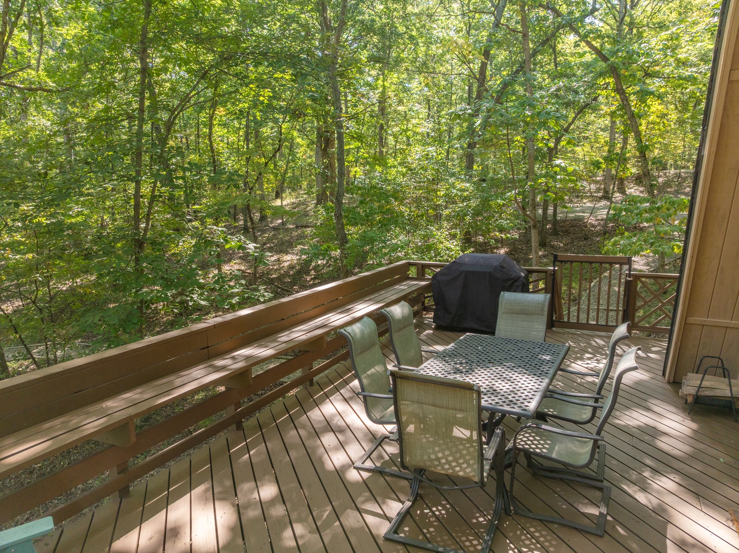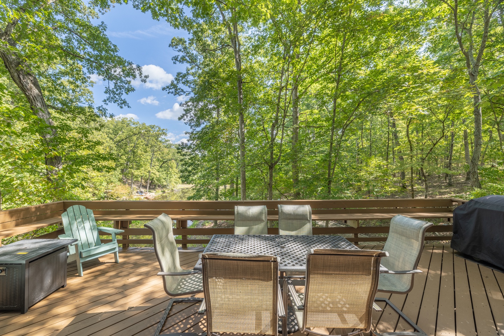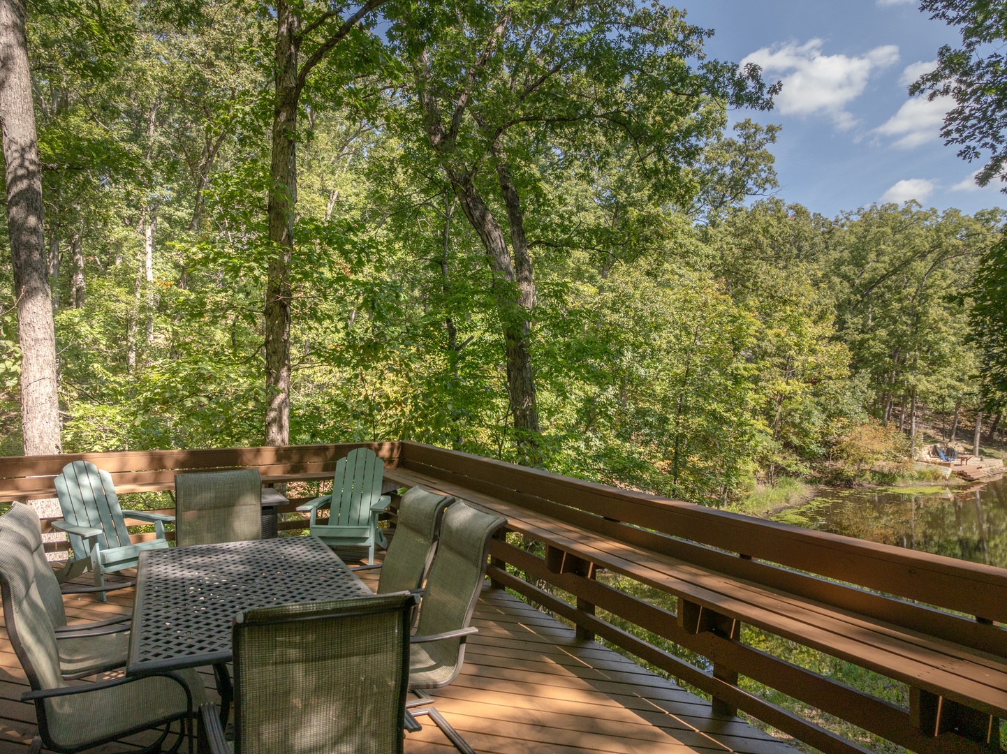 • Expansive back deck with multiple seating areas, comfortable outdoor furniture, and gas grill