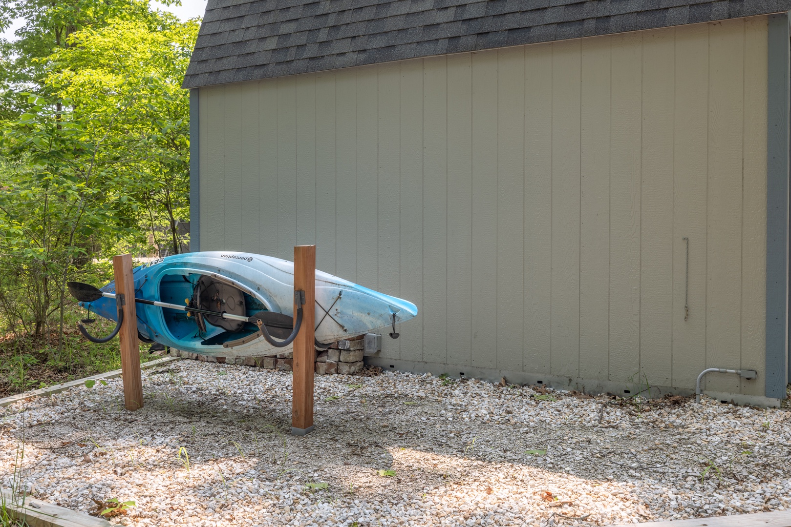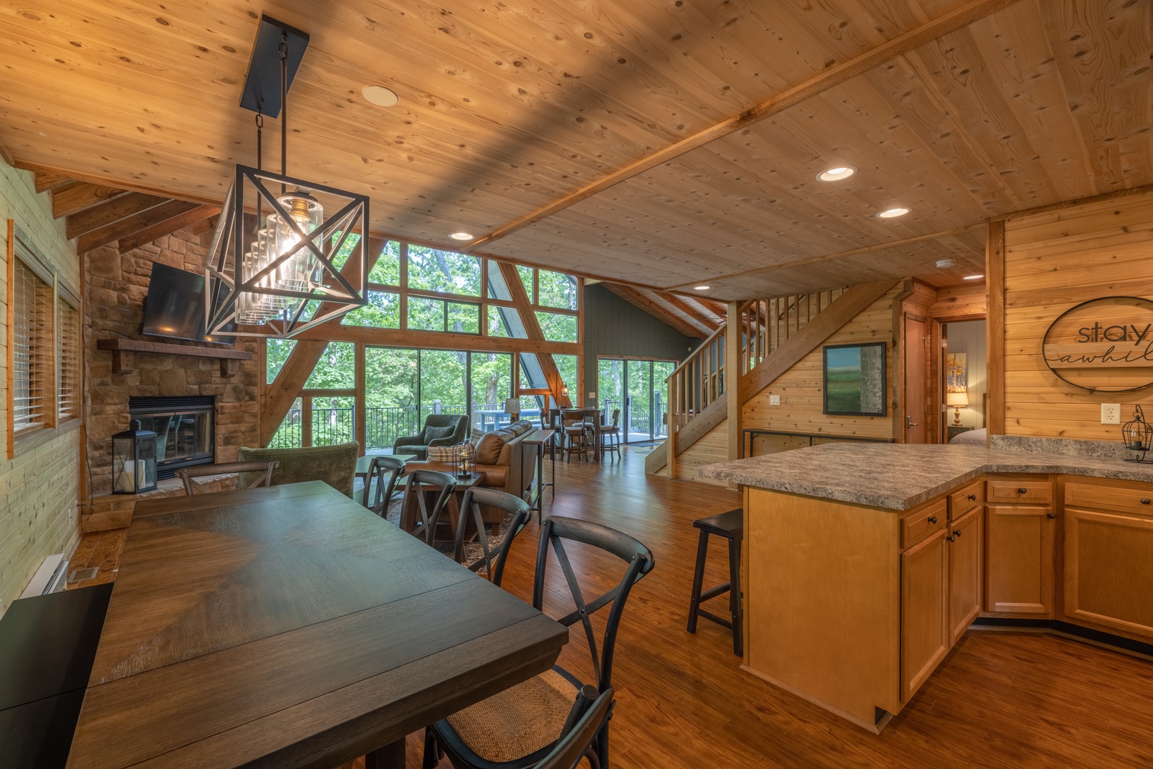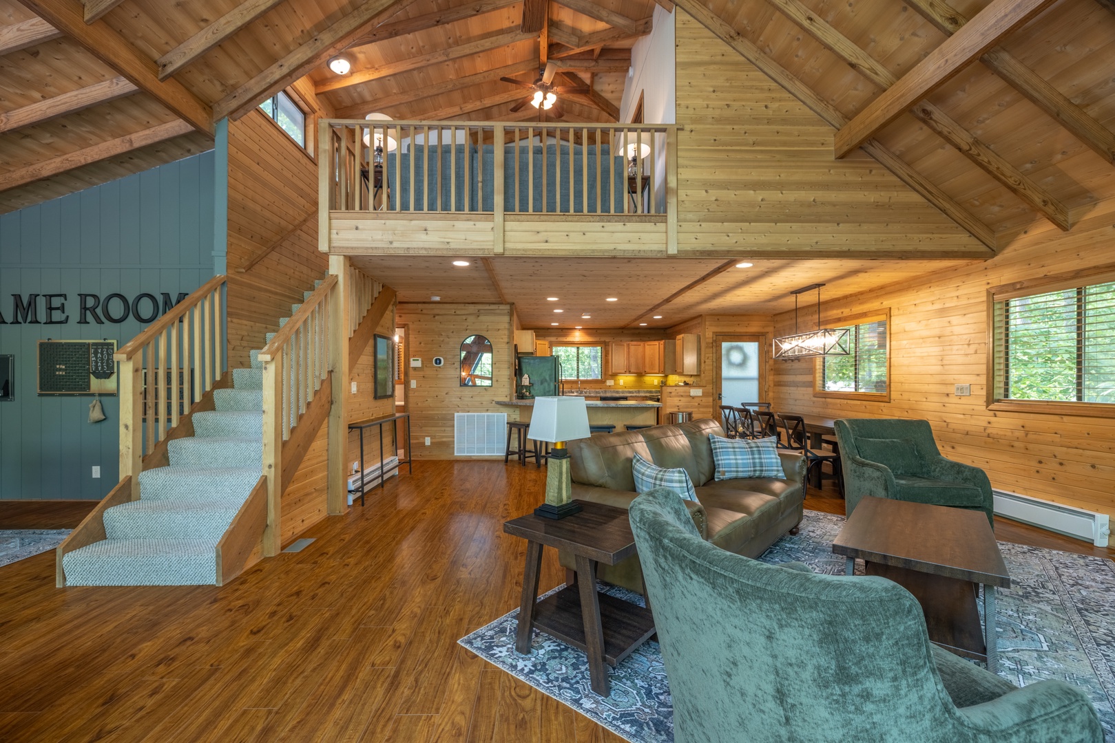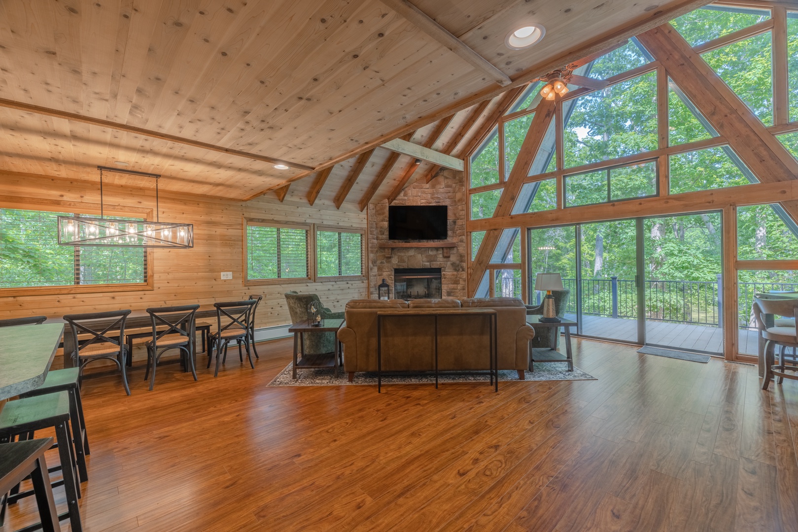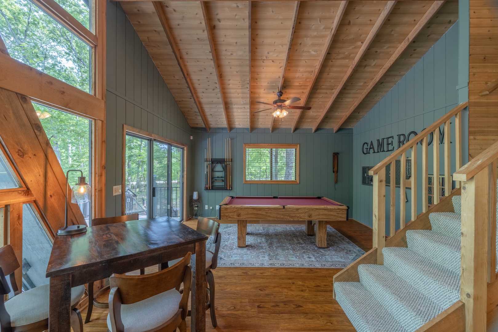 The spacious 3 bedroom, 2 bathroom a-frame has a traditional, rustic Innsbrook vibe, with amazing views. The oversized windows in the main living area immerse the interior with natural lighting and provides 360 degree views of the outdoors. A cozy wood burning fireplace paired with comfortable furniture in the living room are perfect for lounging with your morning coffee, or taking in sunsets with a glass of wine. When it’s time for friendly competition or family game nights, the custom game room has a variety of activities and games for people of all ages to enjoy!
