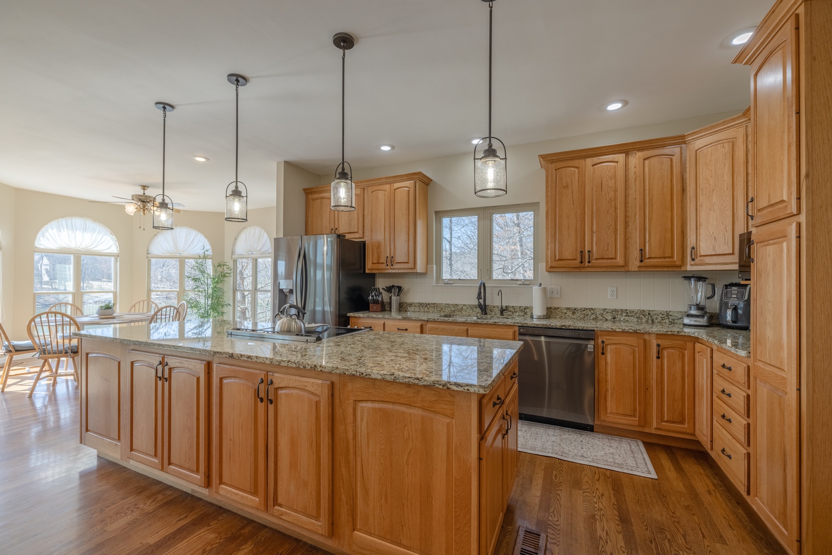 The oversized kitchen is fully equipped with everything you need to prepare meals for your group, including an air fryer, blender, toaster, coffee pot, griddle, and all essential cookware and utensils. An expansive center island offers plenty of prep space and seating, while a separate kitchen table and formal dining room provide the perfect setting for shared meals and special occasions.