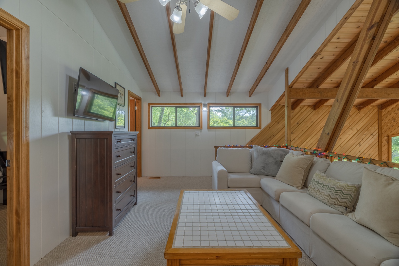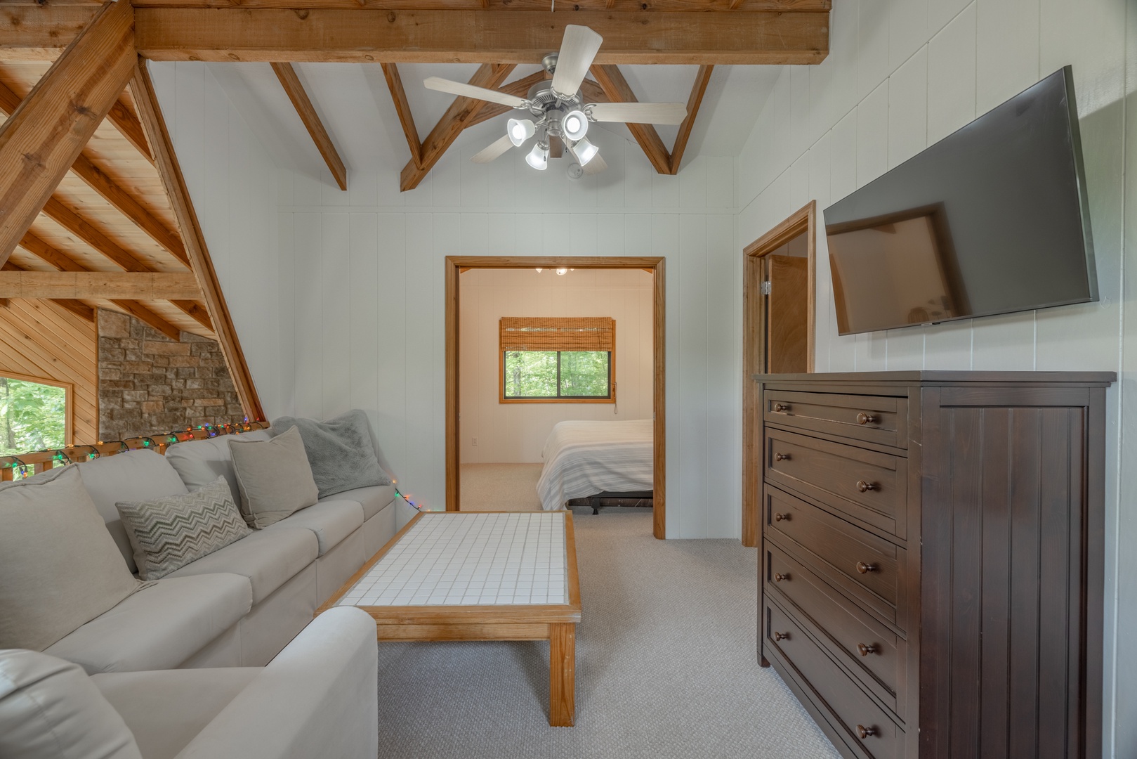 • Loft, living area includes an oversized couch, TV, and easy access to full bathroom.