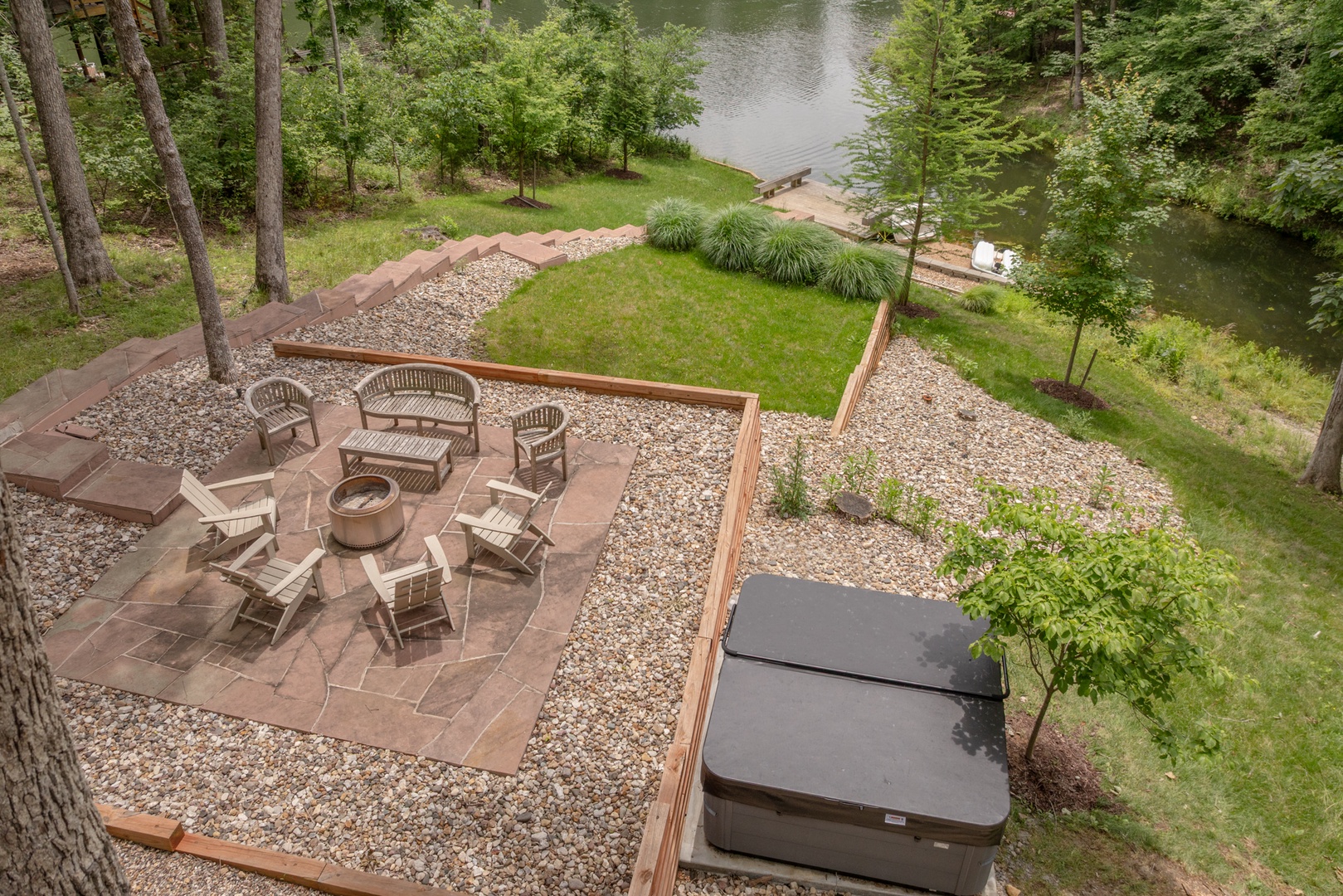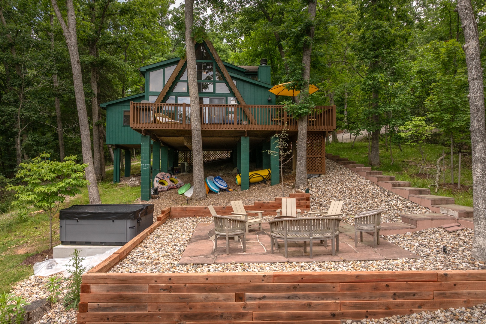 The heart of the home is the open-concept main level, featuring a fully stocked kitchen ready for effortless meal prep, a roomy living area with a stone fireplace and flat screen TV, a dedicated dining space, and easy access to the expansive deck. Outside, enjoy relaxing or entertaining on the deck with ample seating and a grill, gather around the outdoor fire pit with seating for the whole family, or head down to your private dock and beach to soak up the sun. Lounge chairs, water toys, and a private hot tub round out the ultimate lakefront experience.