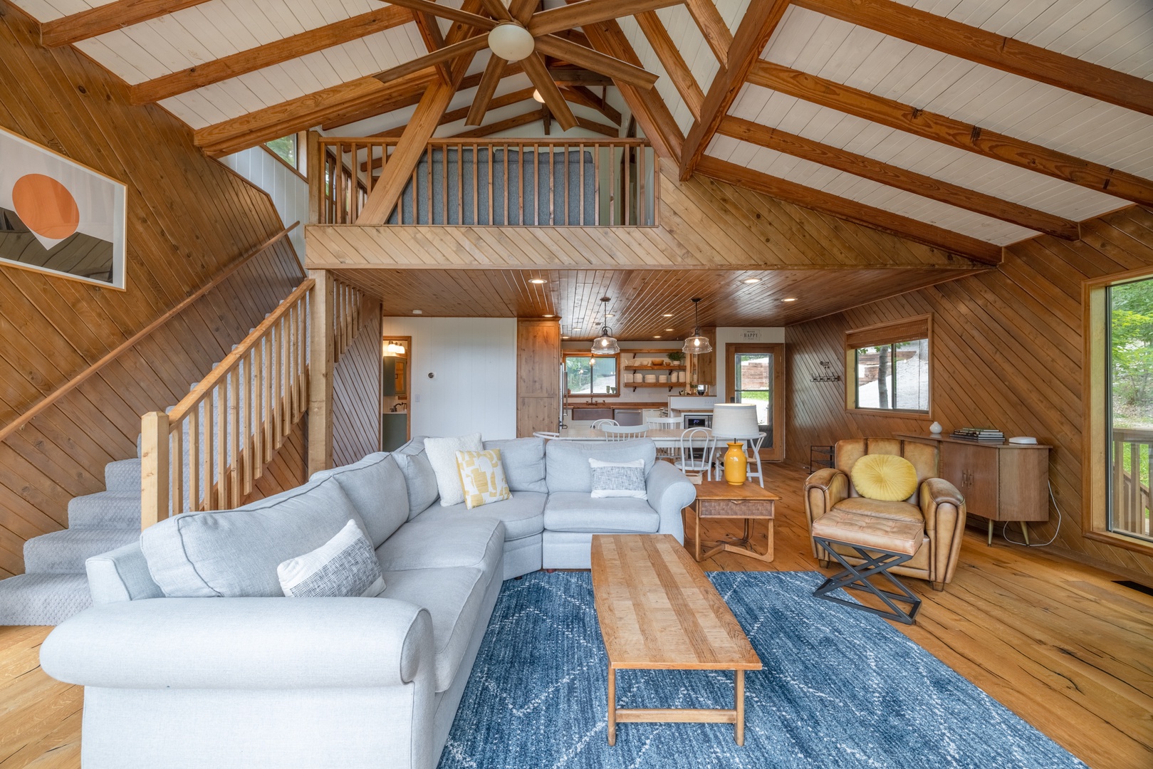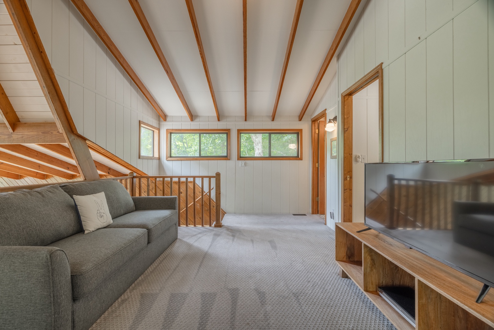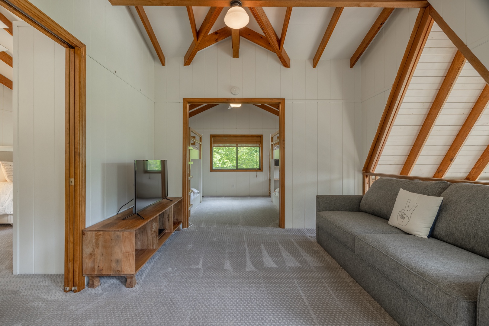 • Loft, living area includes a queen sleeper sofa, TV, and easy access to full bathroom.