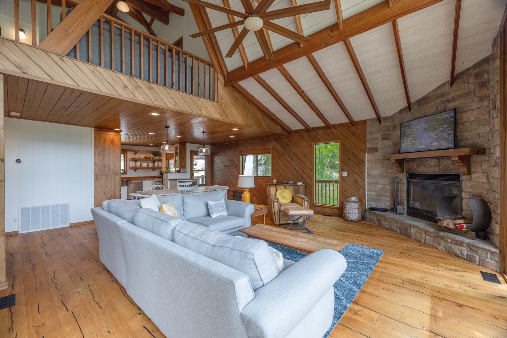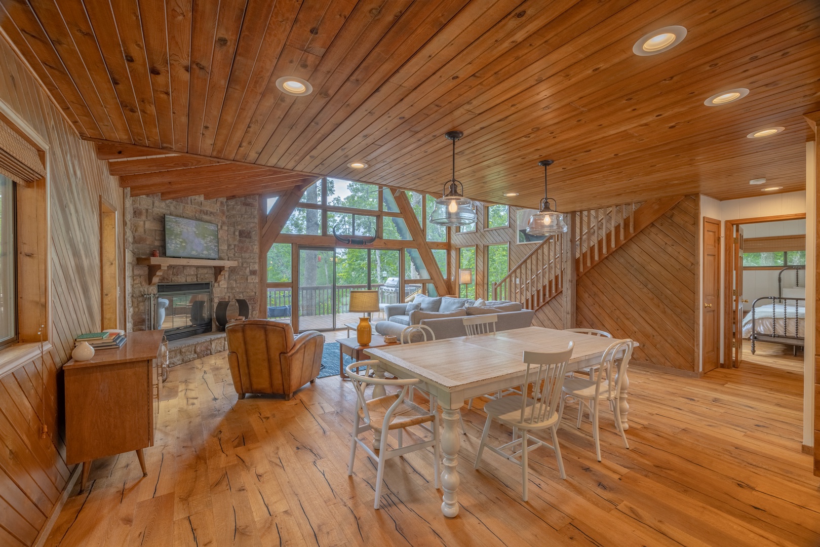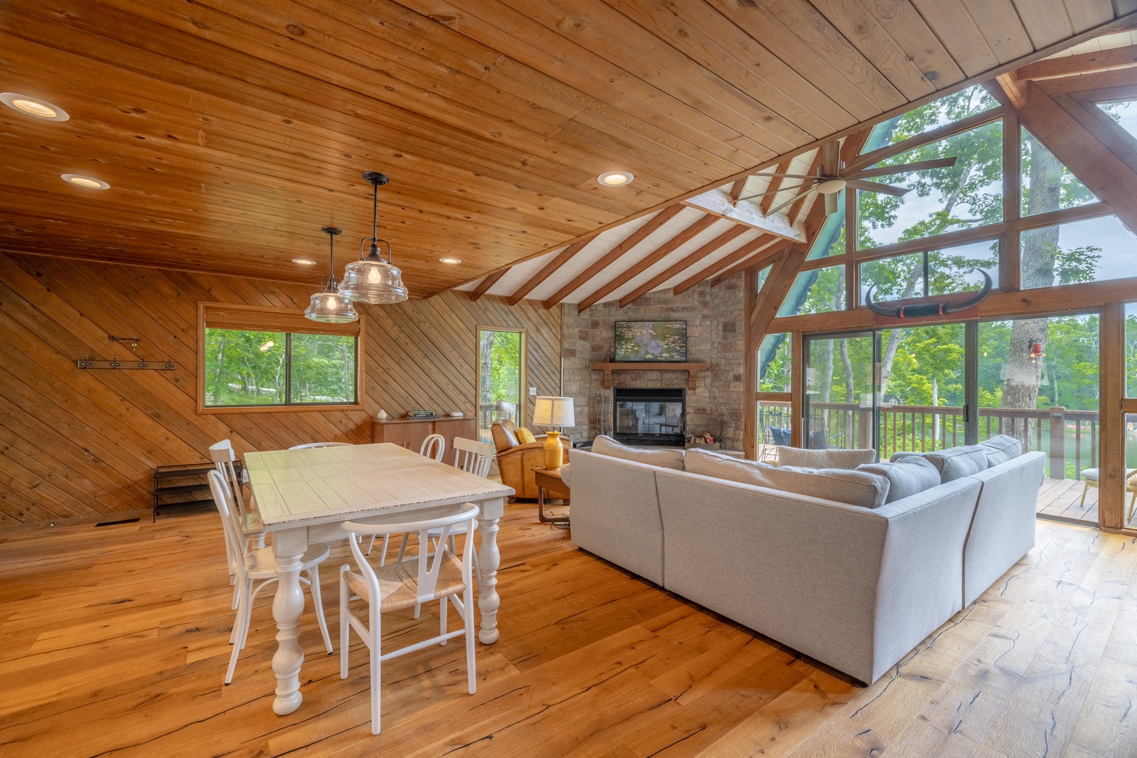 • Roomy living area with flat screen TV, dining area, access to the deck, and a stone wall fireplace for crisp fall and winter evenings.