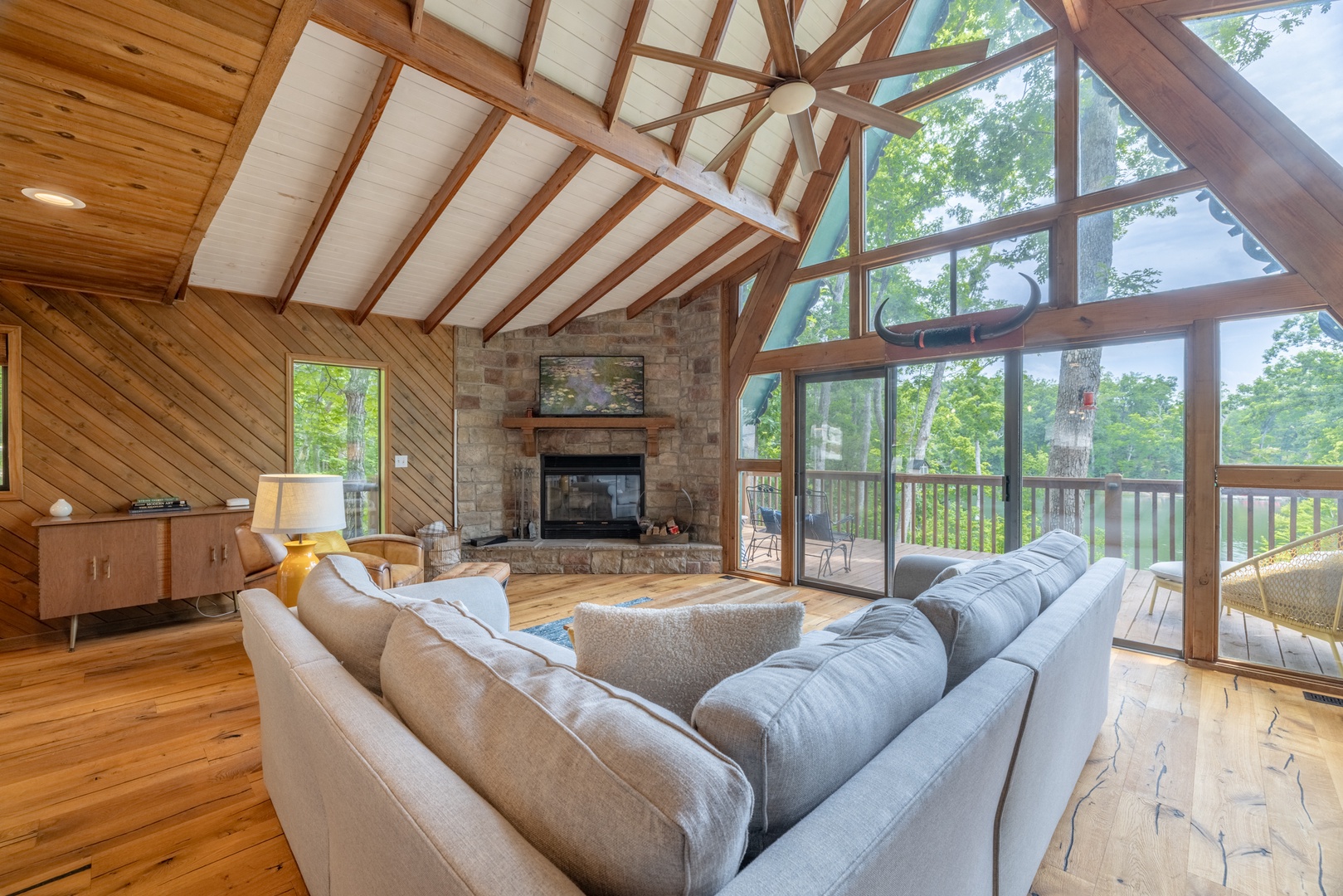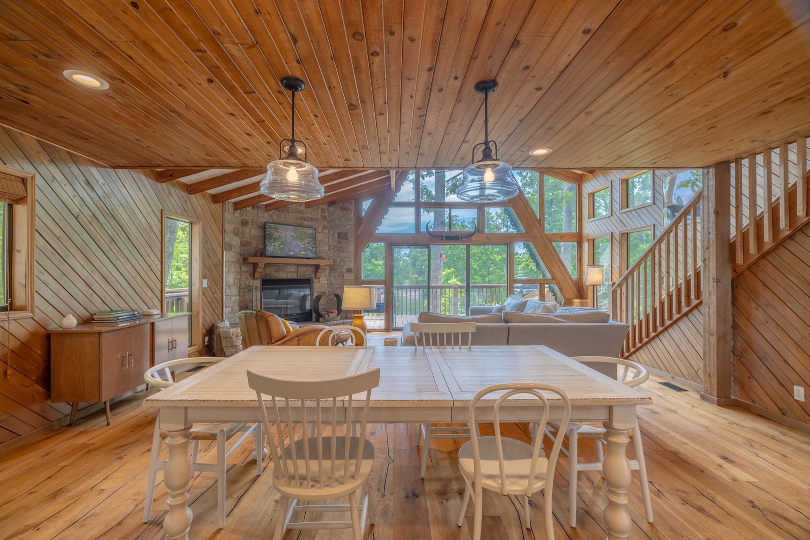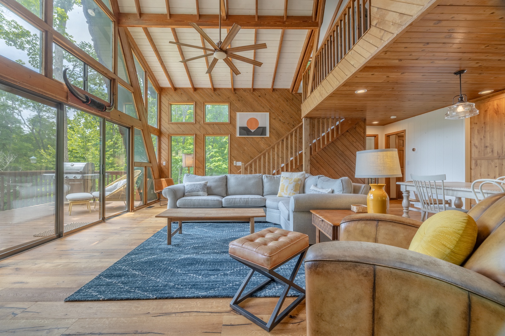 • Roomy living area with flat screen TV, dining area, access to the deck, and a stone wall fireplace for crisp fall and winter evenings.
