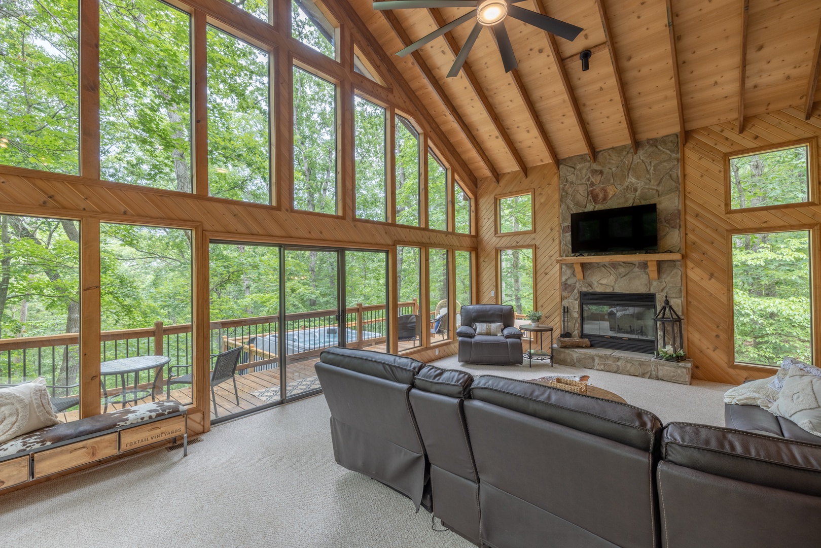 • Roomy living area with a stone wall fireplace, oversized sectional, TV, and sliding glass doors to the back deck