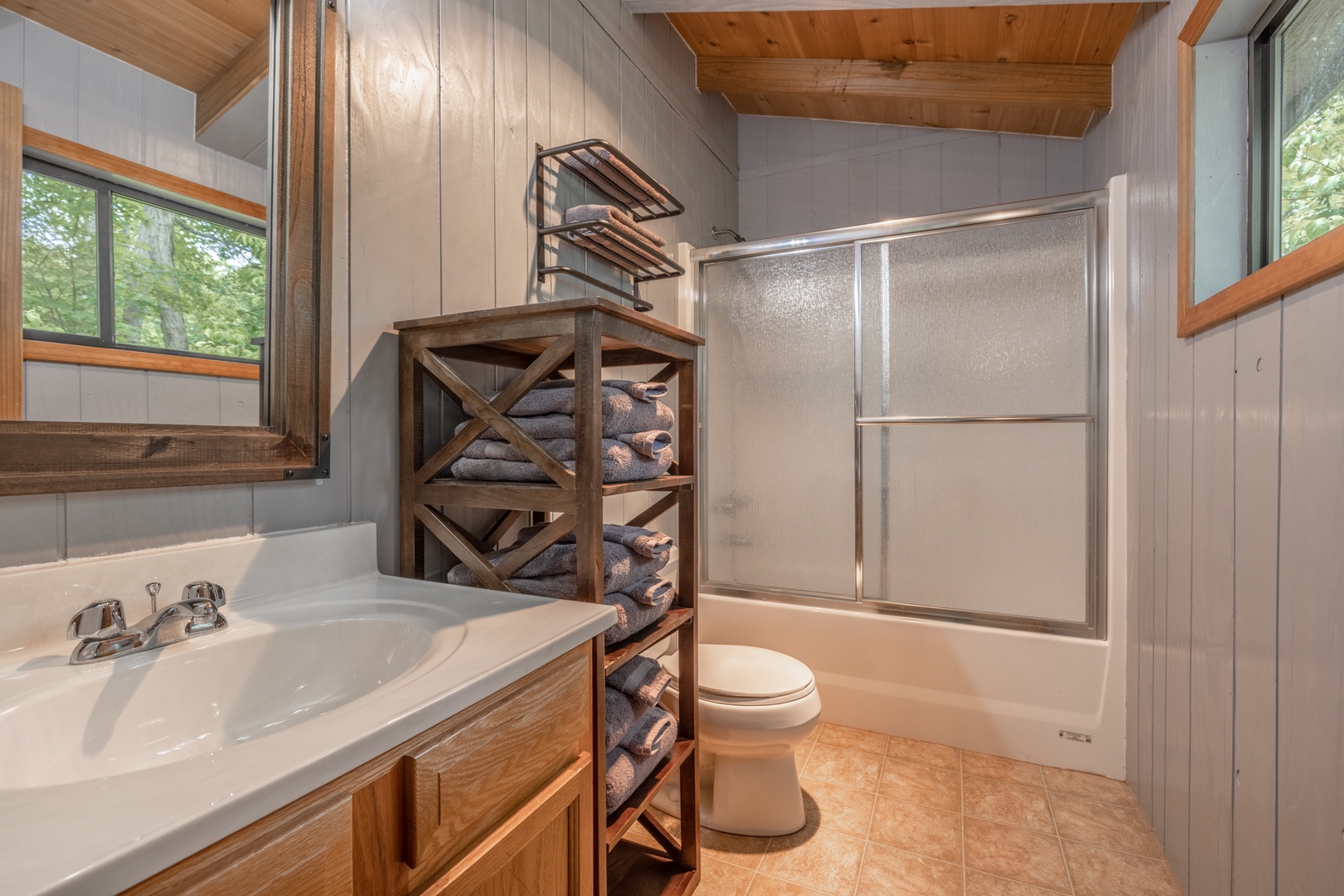 Large, open, and airy, this 3 bedroom, 2 bathroom a-frame is located on the western side of Innsbrook, near Alpine Lake, and able to accommodate 10 guests comfortably. Professionally designed with gorgeous, rustic detailing and wood finishes, modern decor, and open, airy living spaces, this chalet’s eclectic, high-end styling has something for everyone. Enjoy cooking your favorite meals in the fully equipped kitchen, bird-watching from the private deck, or taking an afternoon nap in the cozy loft.