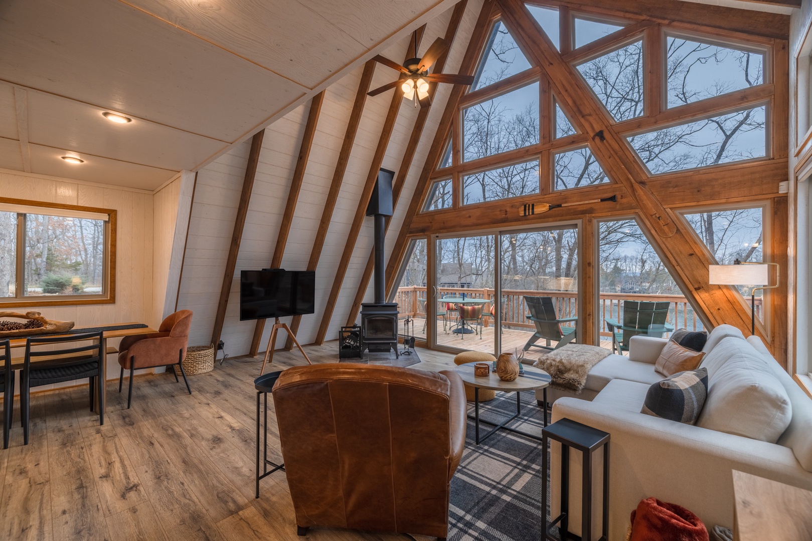 • Roomy living area with vaulted ceilings and a wood burning fireplace, cozy furniture, smart TV, and a wall of floor to ceiling windows
