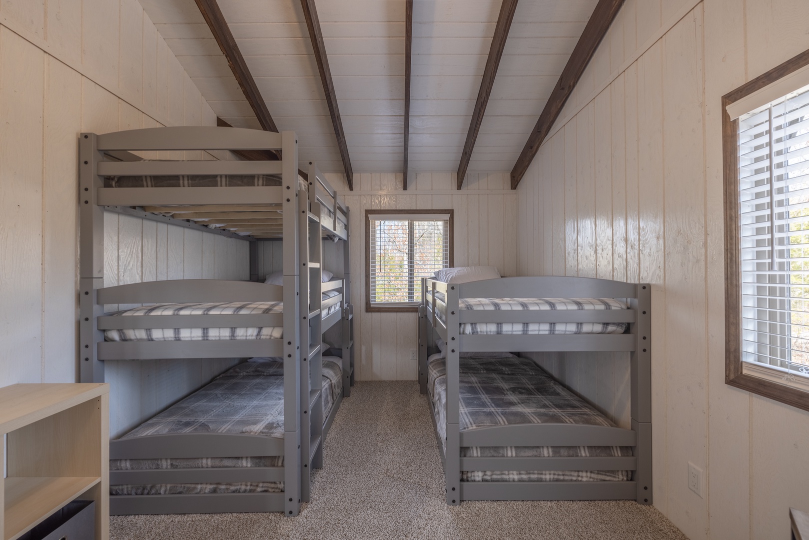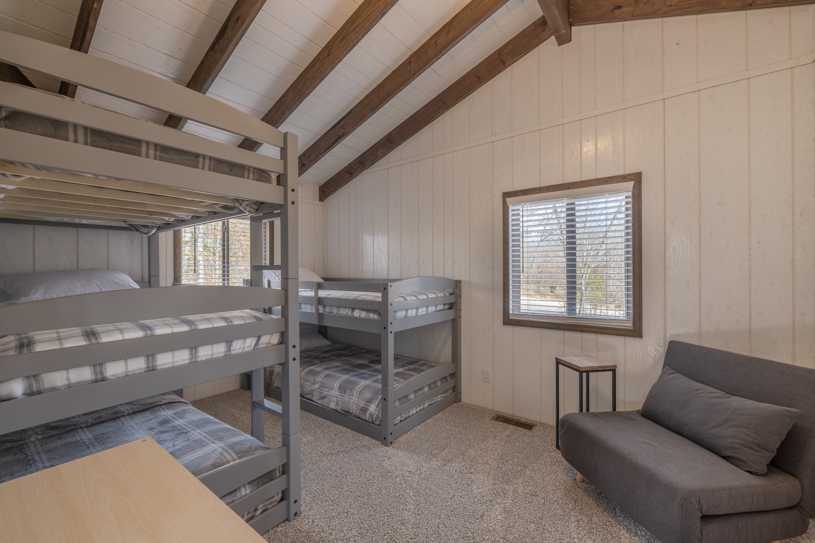 • Bedroom 2 (upstairs) – 6 twin beds (2 sets of bunk beds, 1 pullout sleeper chair), and easy access to the upstairs full bathroom