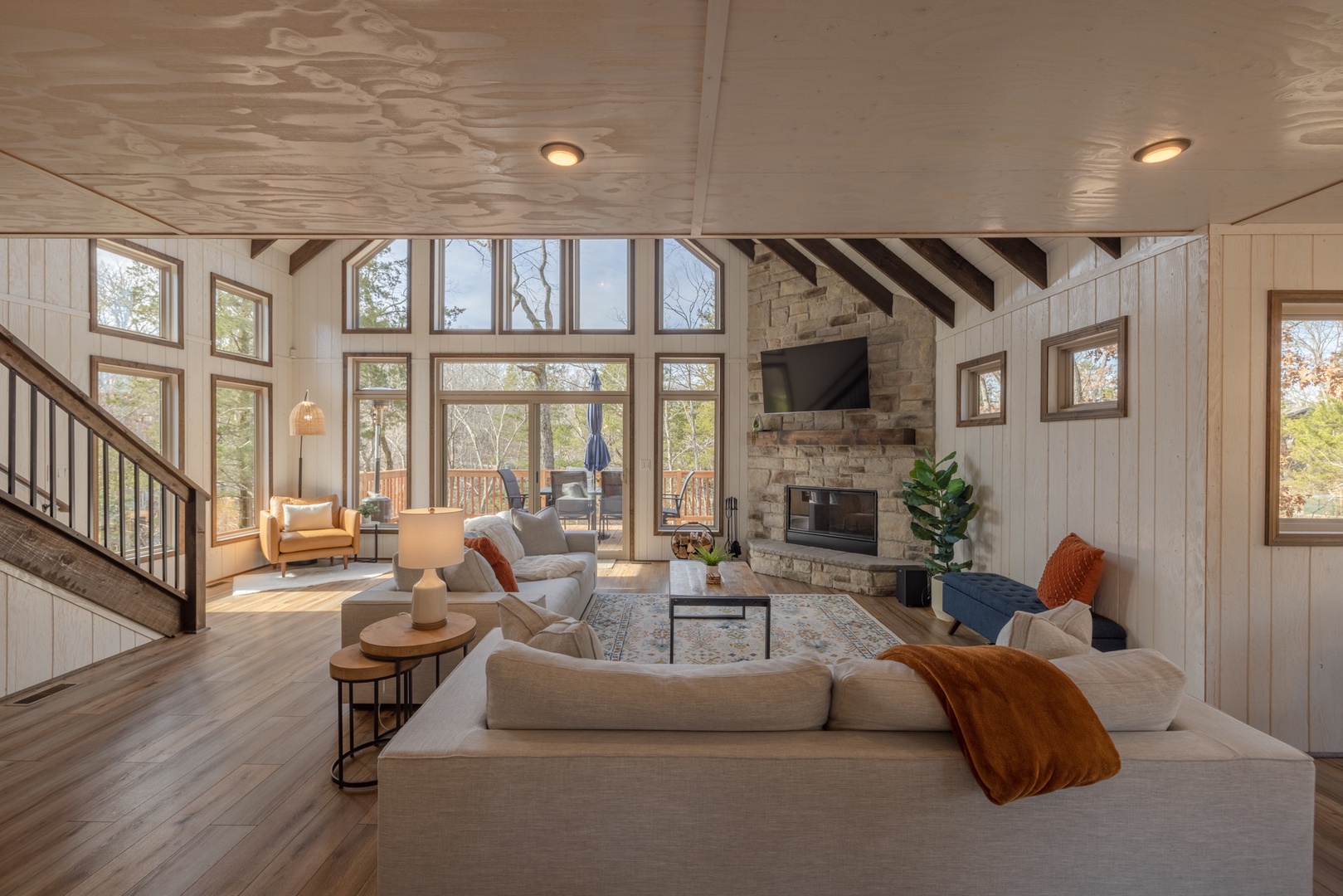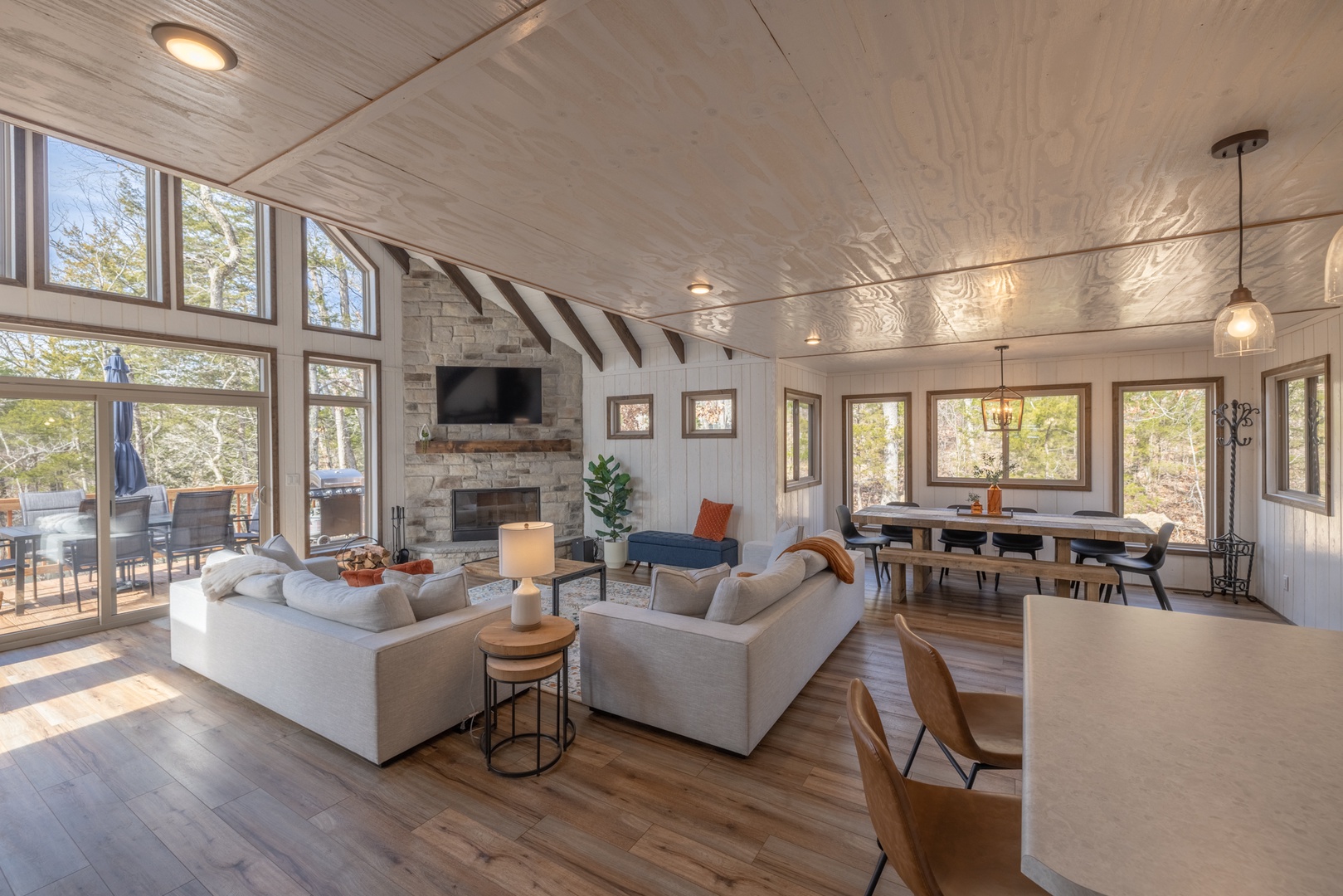 • Roomy living area with a wood-burning fireplace, plush furniture, TV, and sliding glass doors to the back deck