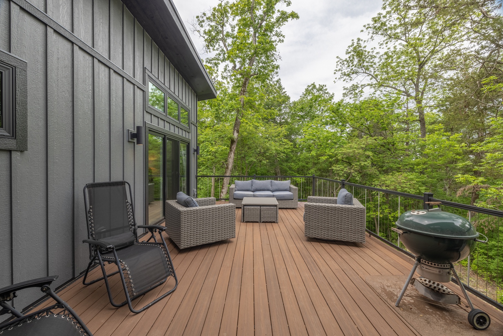 Enjoy nature views from the spacious deck with ample patio seating and a charcoal grill
