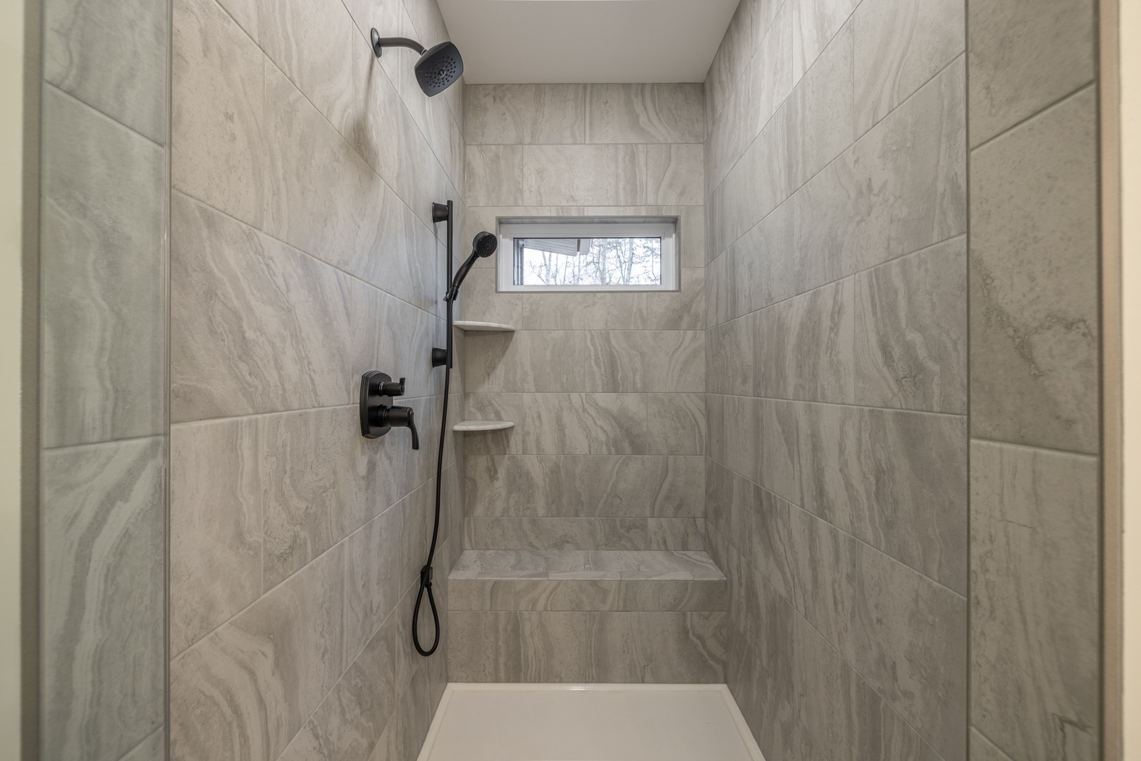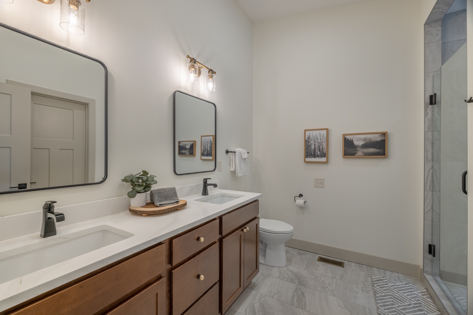 Stunning primary bathroom with ceramic tile flooring and double vanity sinks