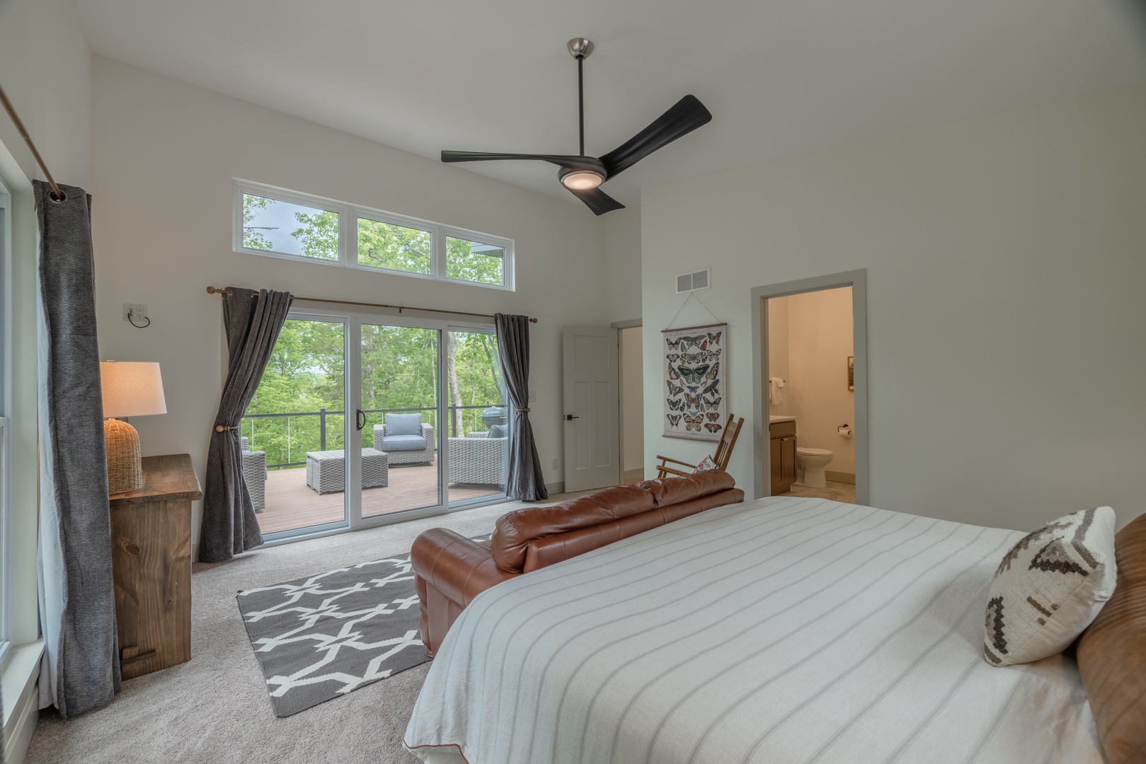 Bedroom 1 - 1 king sized bed, private bathroom, and sliding glass doors to the deck