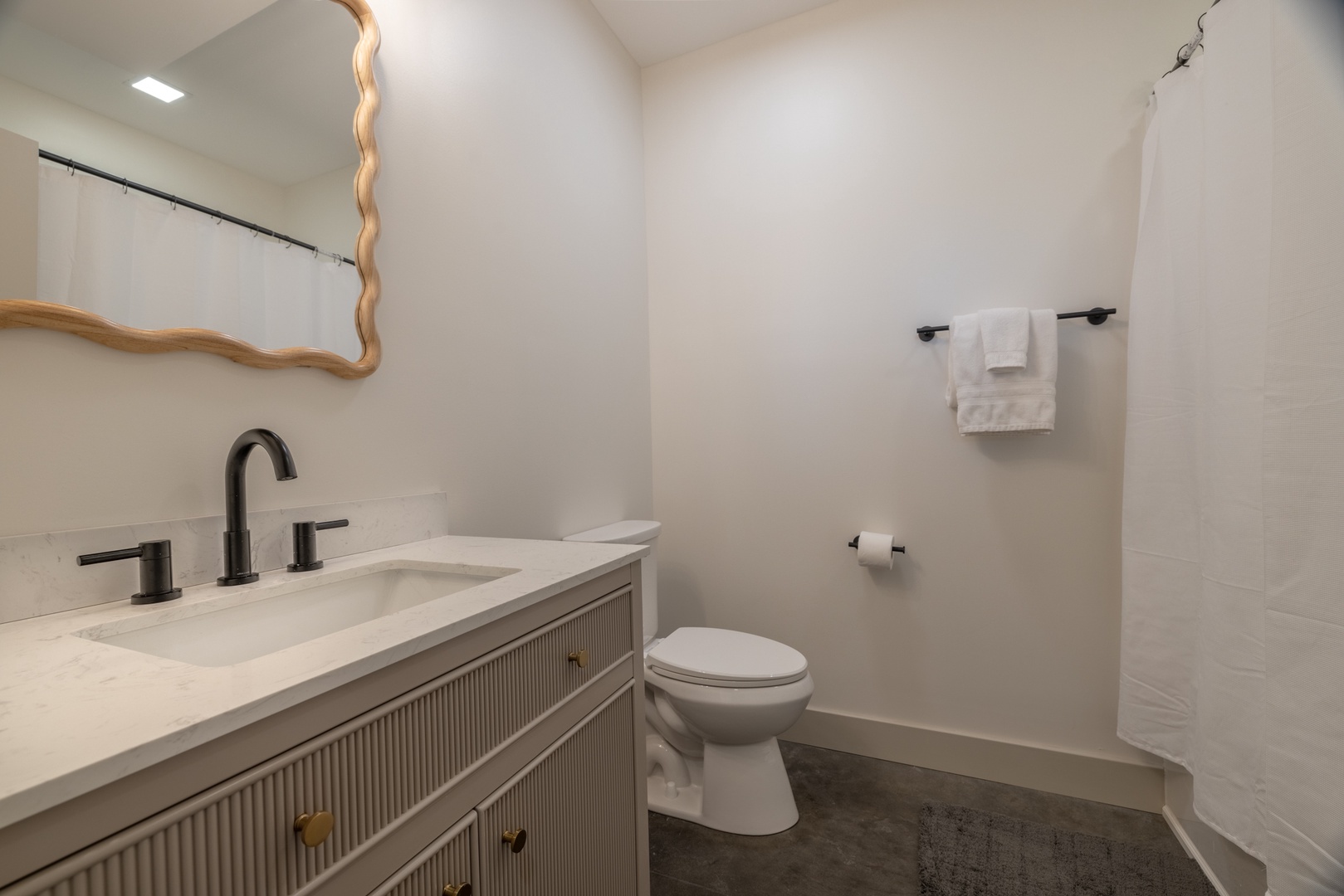 • Primary bedroom - 1 king bed, private bathroom, sliding glass doors to the deck