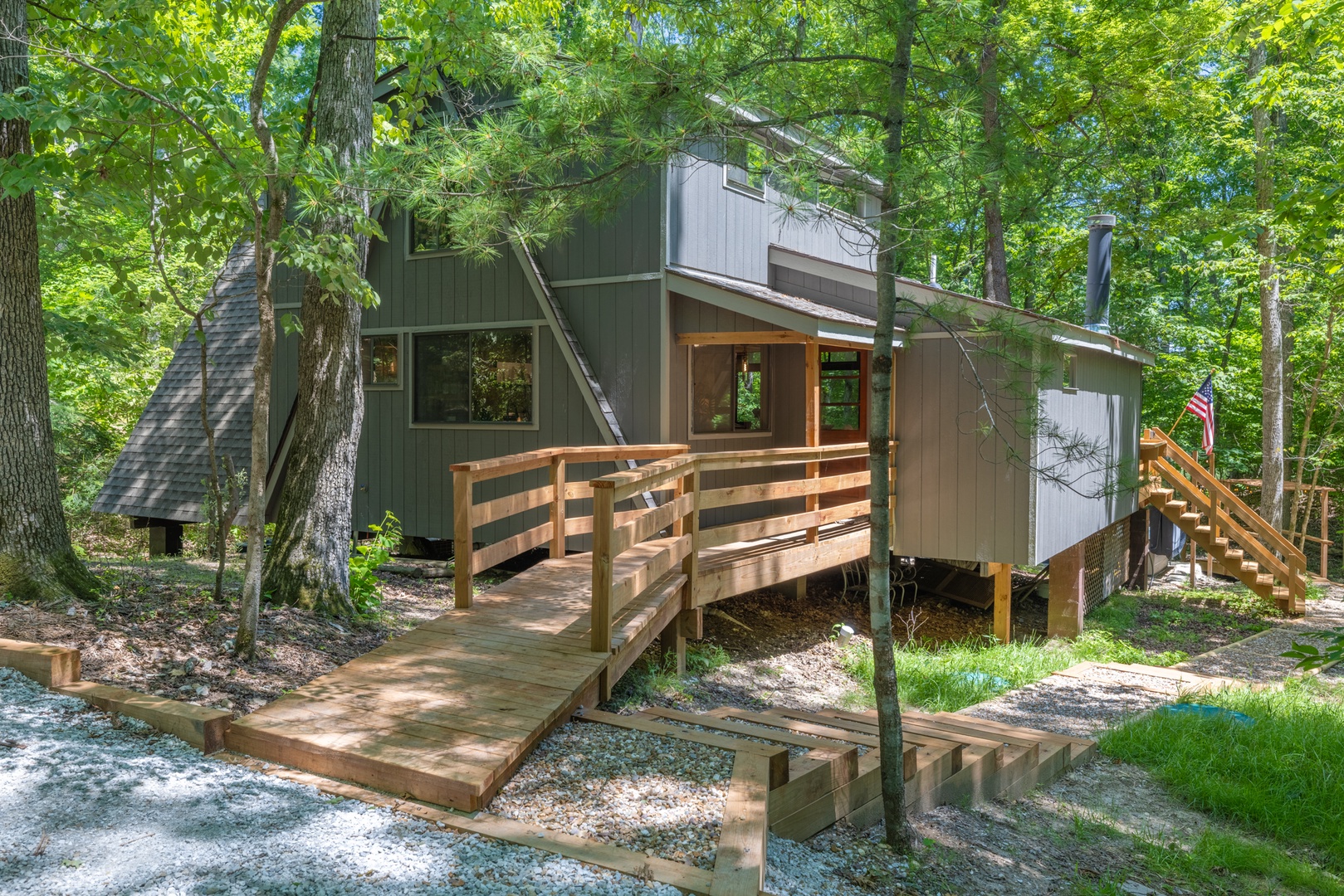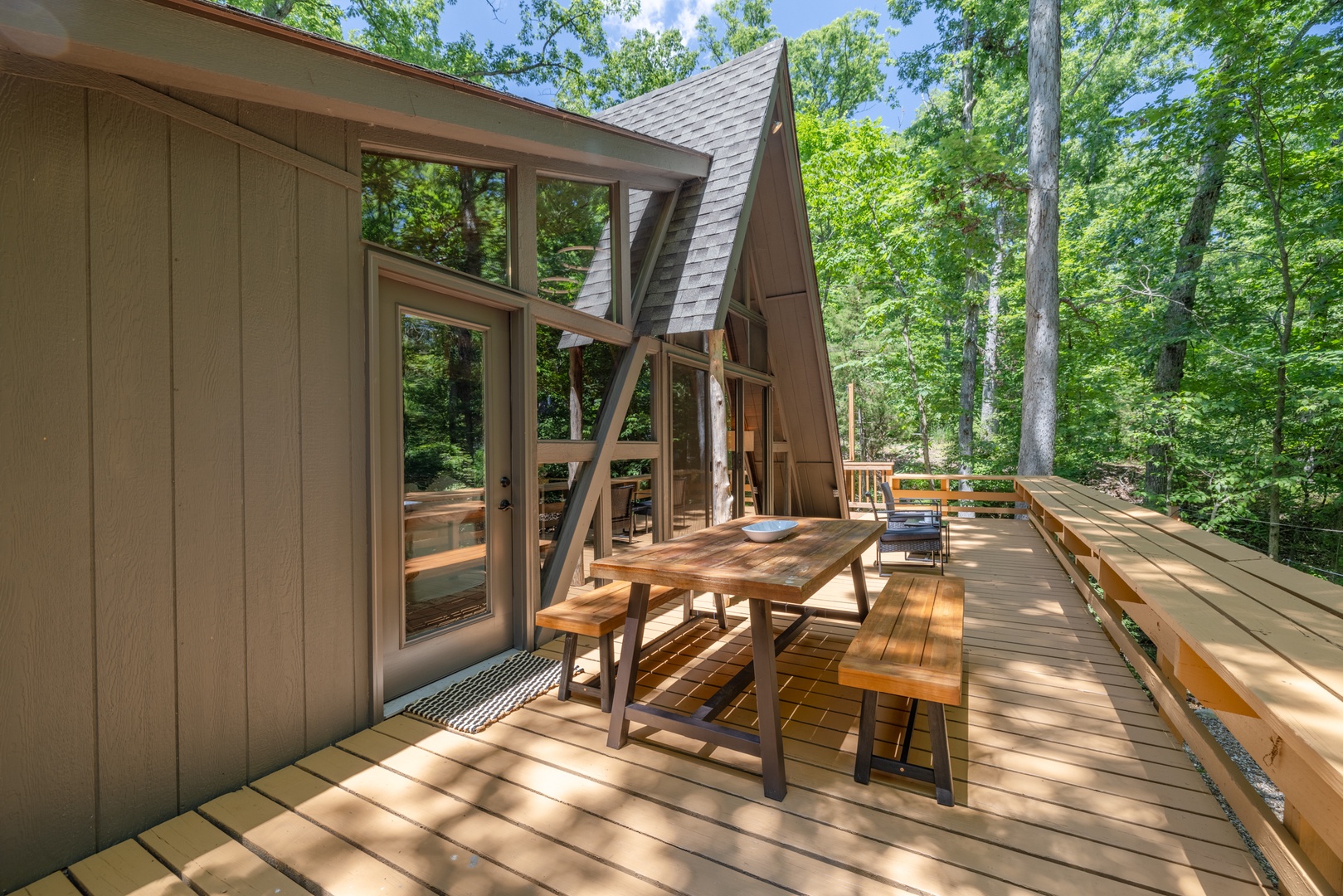 • Bedroom 1 - on the main level with a king bed, private full bathroom, and sliding glass doors to the deck