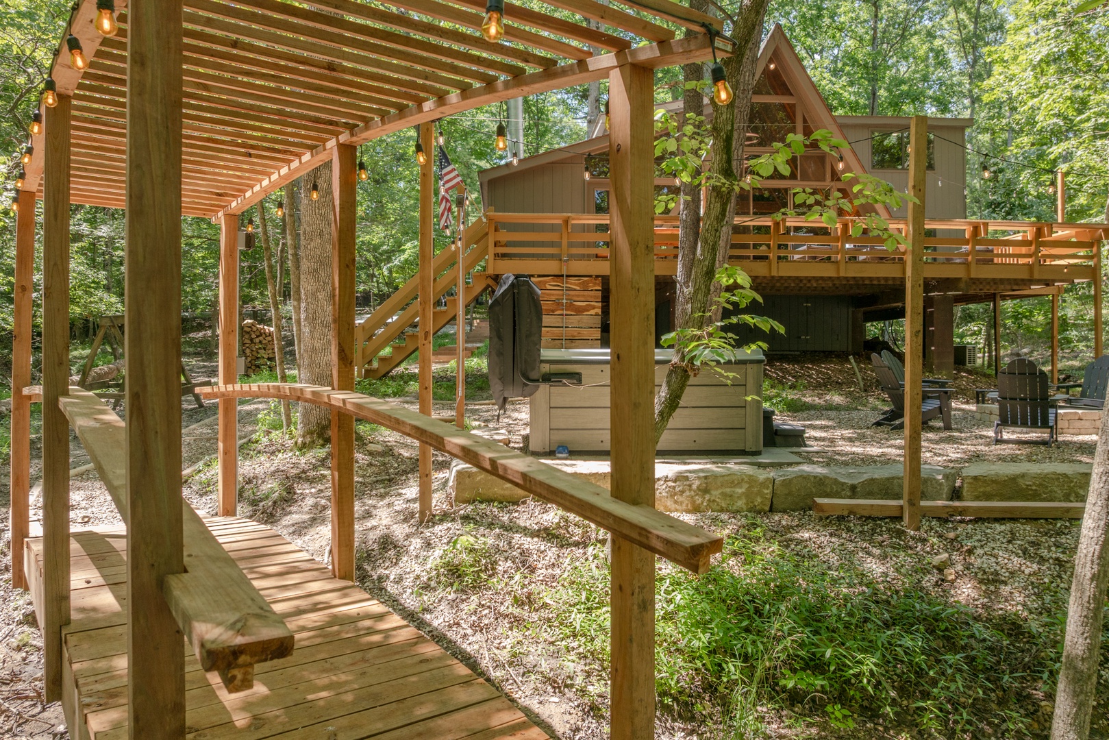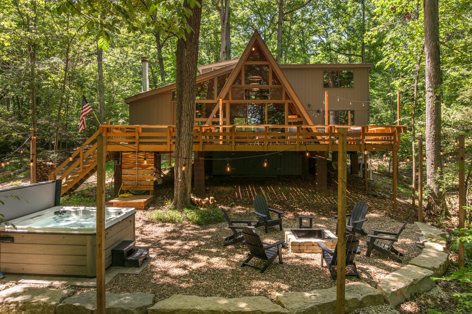 Outside, the expansive deck is a showstopper—complete with plush outdoor seating, a gas grill, and breathtaking lake views. Unwind in the private hot tub, rinse off in the outdoor shower, or gather around the fire pit as the stars begin to shine. Your private dock awaits just steps away, along with water toys for endless lakefront fun.