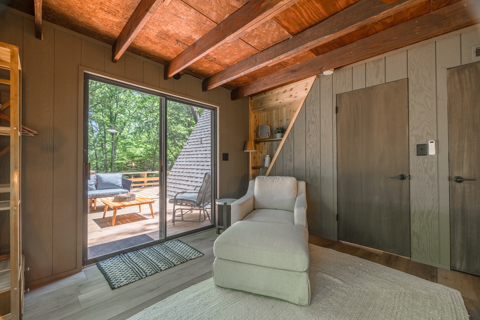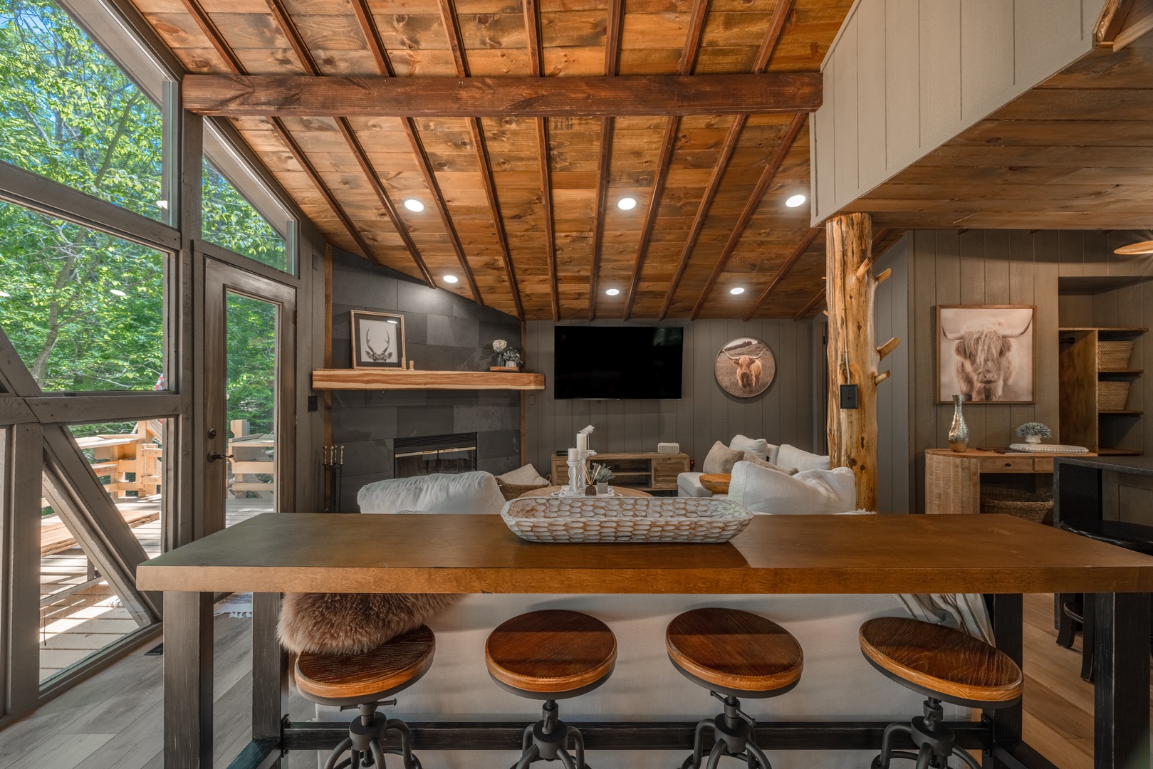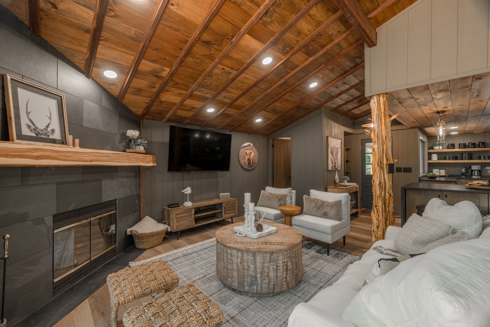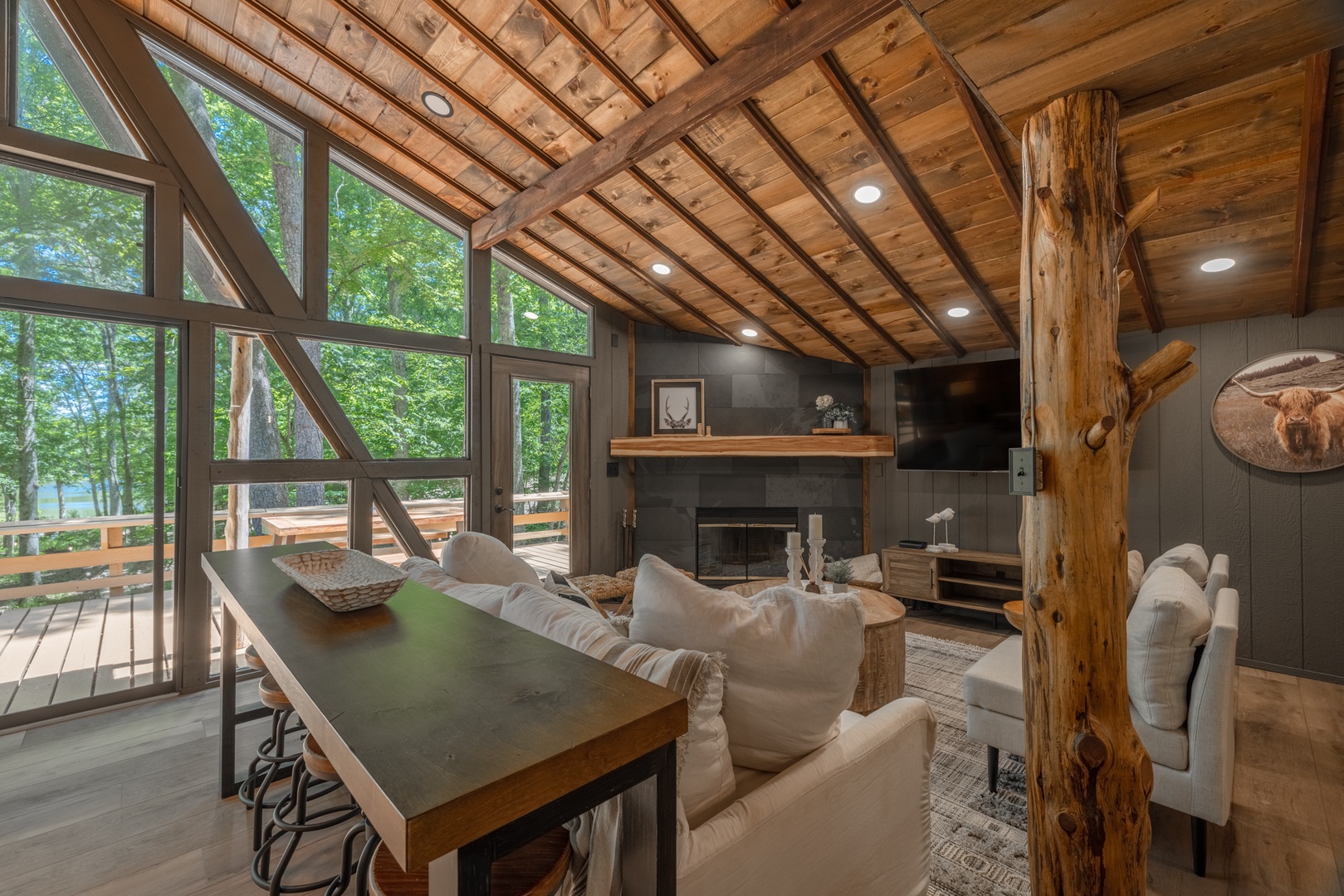 • Roomy living area with a beautiful fireplace, oversized furniture, and sliding glass doors to the back deck