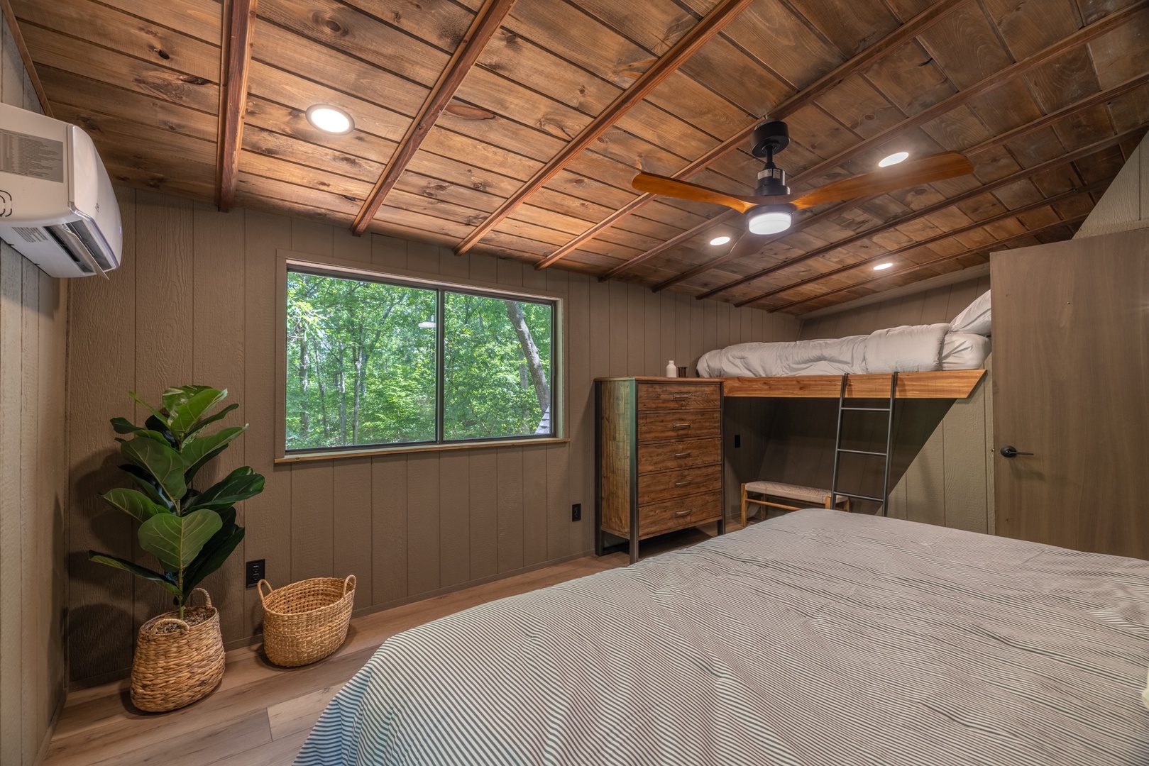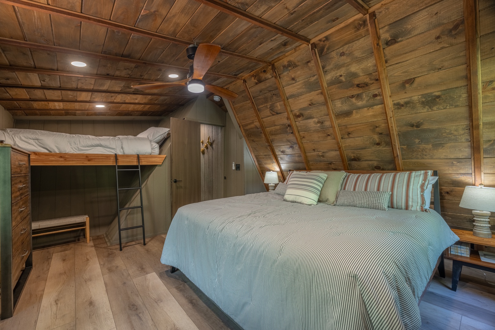 Retreat to the main-level primary suite, where a king-sized bed, private full bath with heated floors, and sliding glass doors to the deck create a true sanctuary. Upstairs, two additional bedrooms—one featuring both a queen and a king bed, and the other designed with two sets of bunk beds (2 twins, 2 doubles)—offer comfort and space for guests of all ages. The loft area is the perfect bonus space with a cozy sectional, Smart TV, and desk setup ideal for remote work or quiet relaxation.