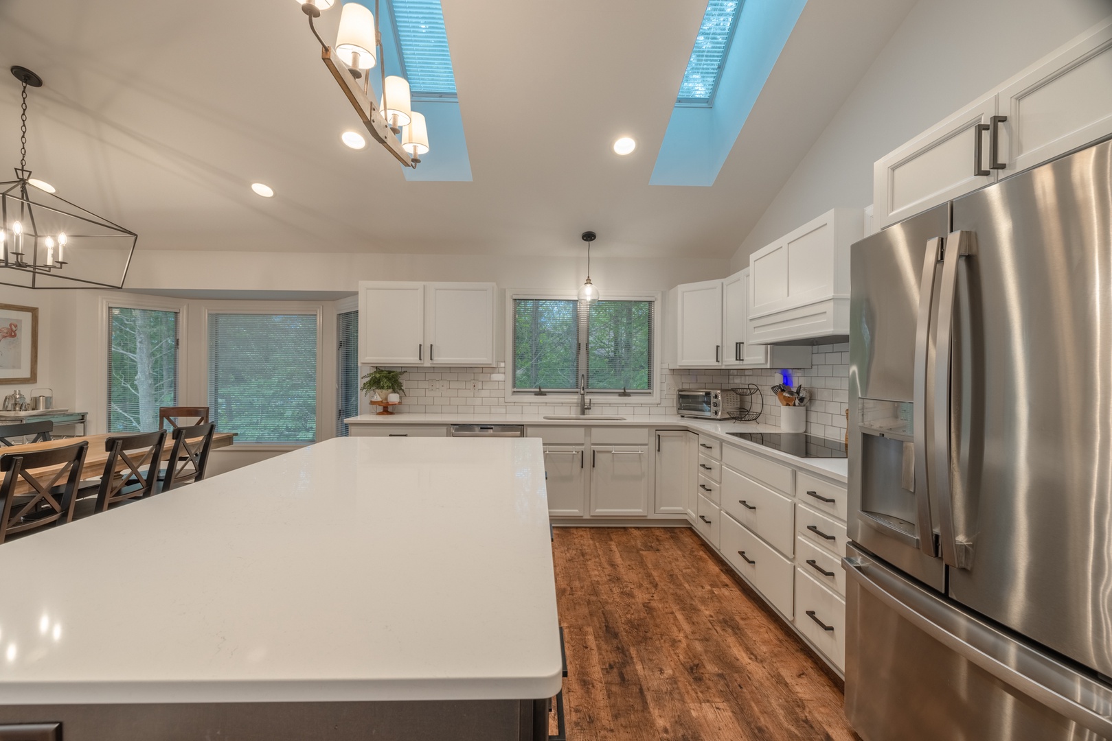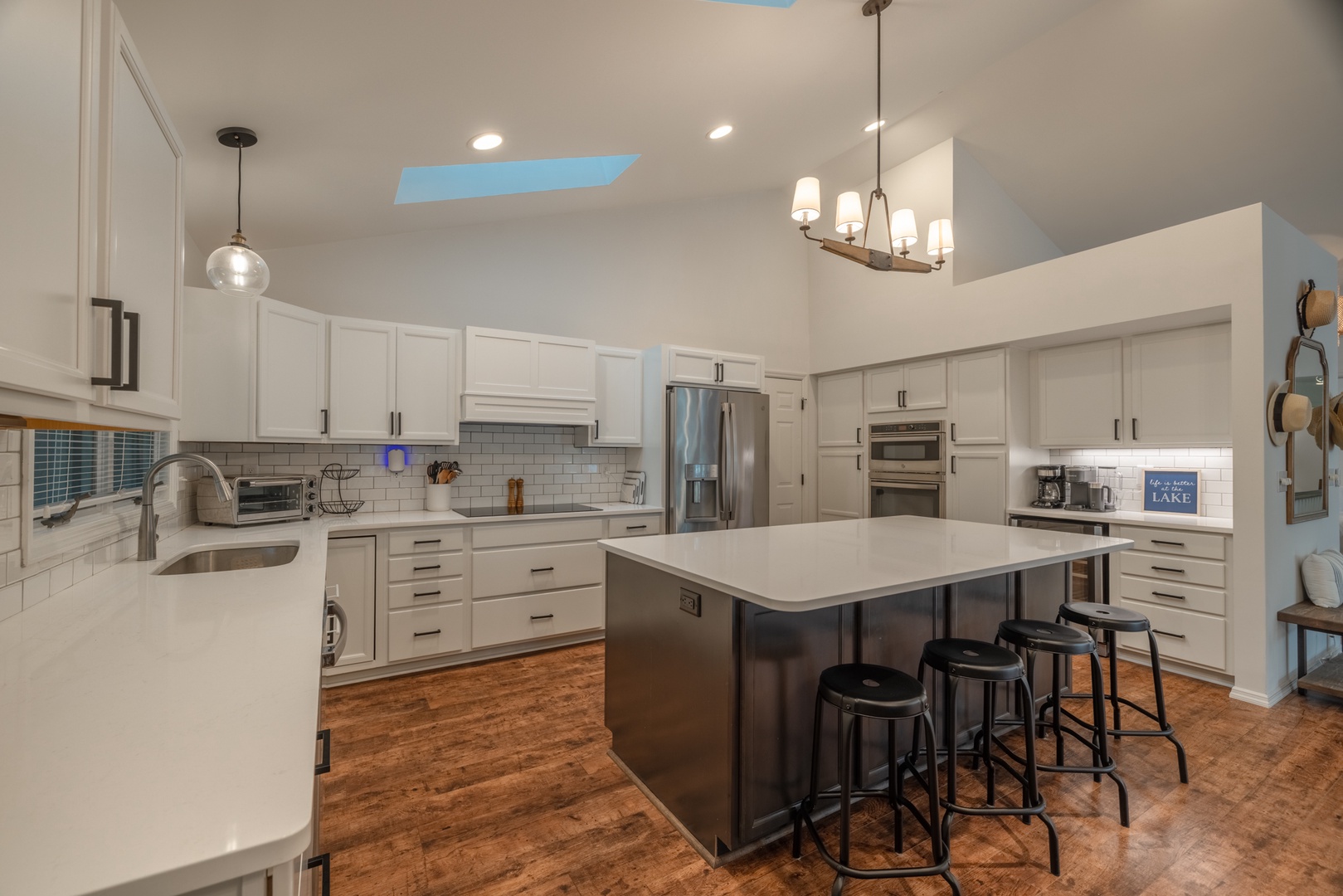 • Kitchen – fully equipped with all of your cooking essentials, beautiful center island with barstool seating, stainless steel appliances, and custom cabinetry