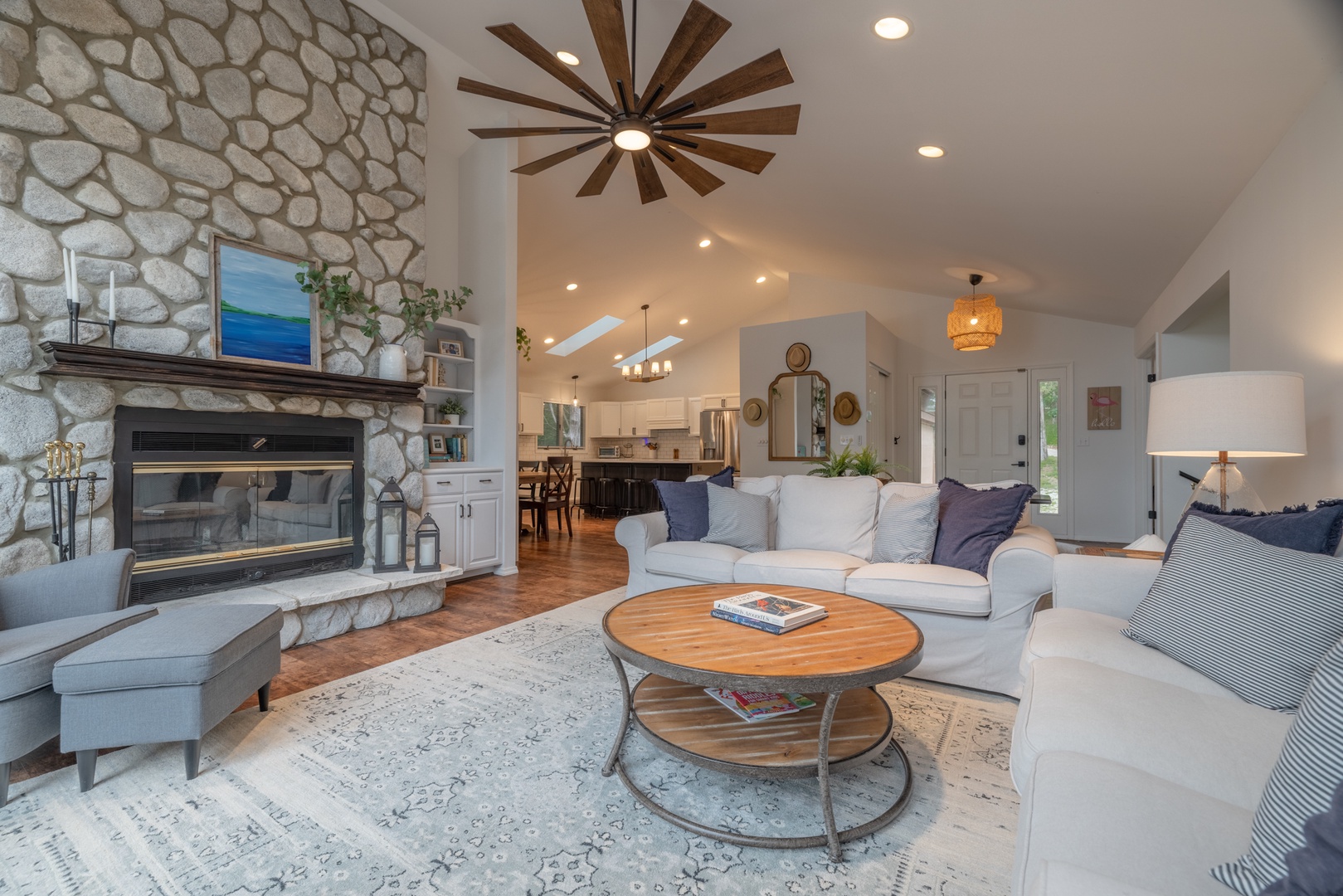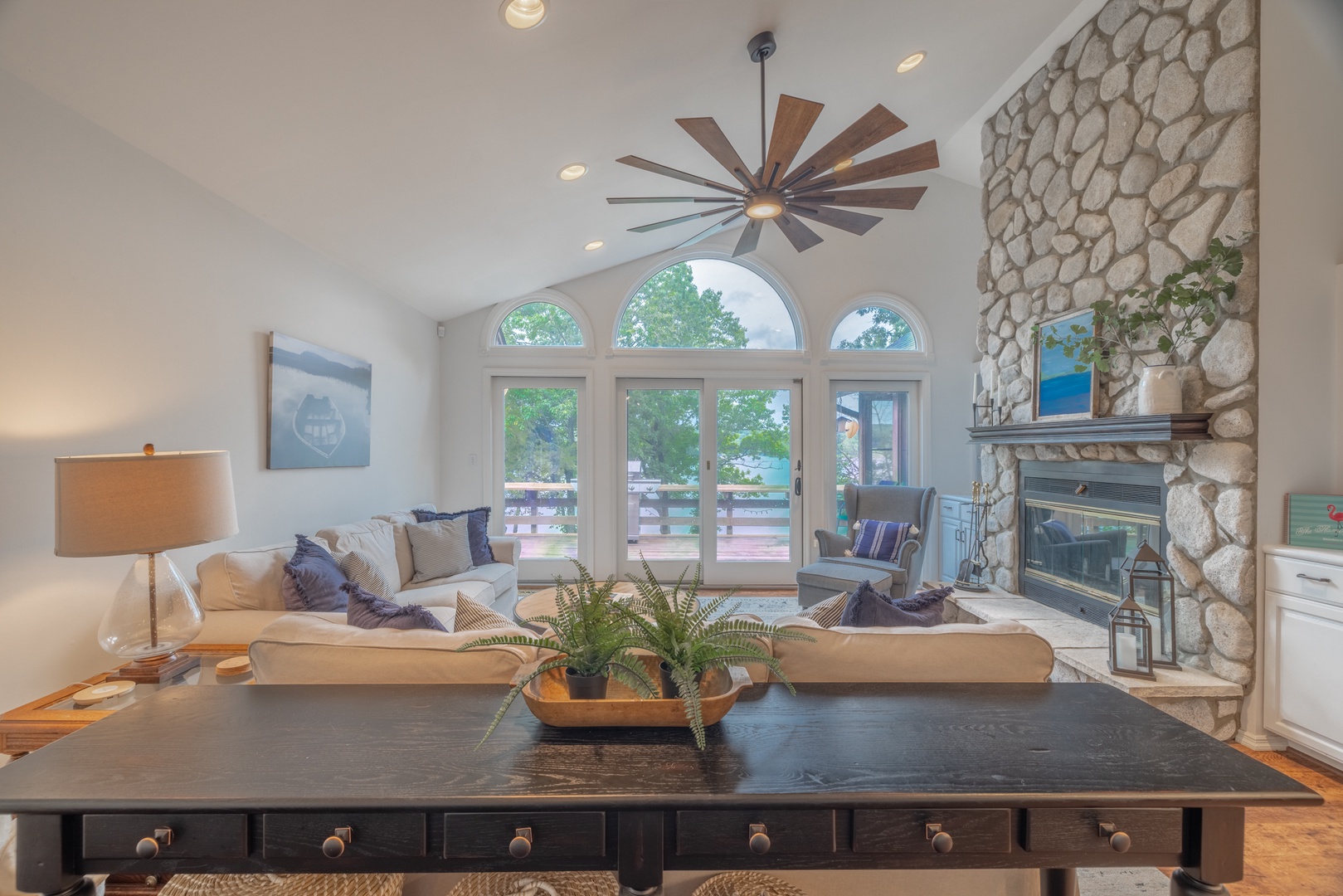 Inside, you'll find a breathtaking main living area featuring a full wall of oversized windows that frame picturesque views of Lake Aspen. Luxury furnishings and a floor-to-ceiling stone fireplace create a warm, inviting atmosphere, while the open-concept layout seamlessly connects the living space to a fully equipped gourmet kitchen and elegant dining area. The kitchen includes stainless steel appliances, custom cabinetry, and a center island with barstool seating — perfect for gathering and entertaining.