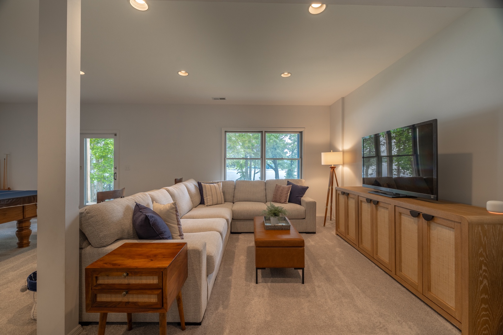 The home features five thoughtfully designed bedrooms: three with king beds, one with bunk beds and a queen, and another with a mix of twin and double beds — offering flexible accommodations for groups of all sizes. The finished basement serves as a second living area and includes cozy furniture, a TV, a ping-pong table, and a pool table, plus two additional bedrooms and a full bath. Walkout access from the basement leads you straight to the lake.
