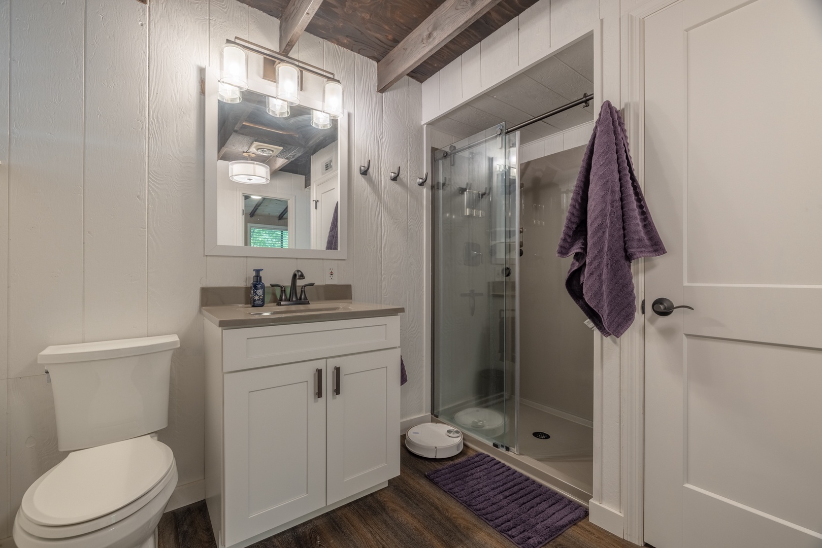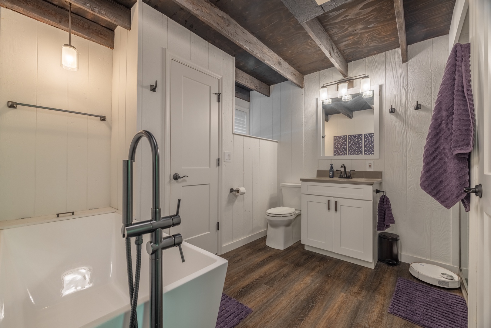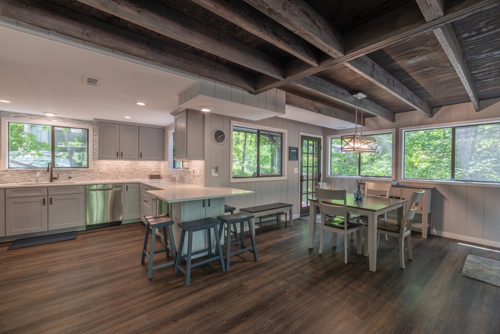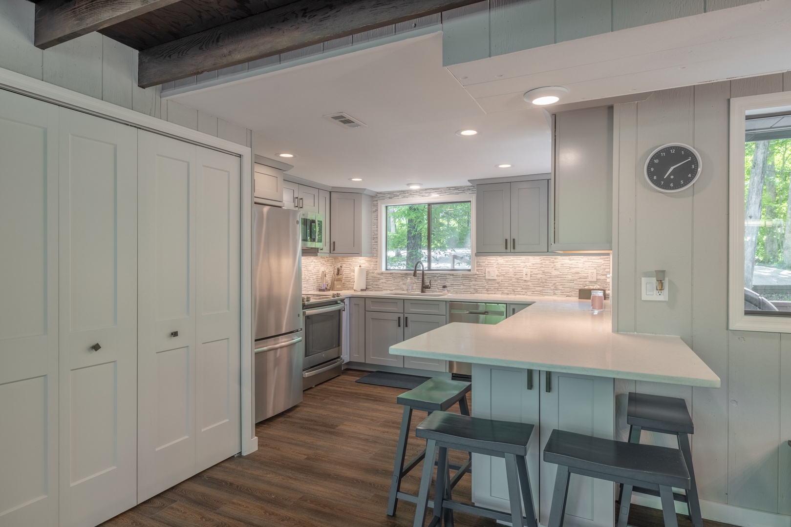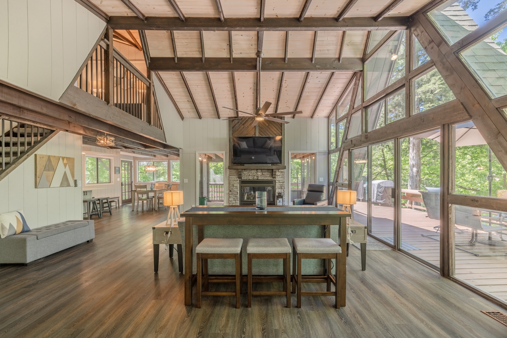 The heart of the chalet is the roomy living area, boasting oversized furniture, a charming stone wall gas fireplace, and sliding glass doors that open to an expansive back deck. The fully equipped kitchen makes cooking a breeze, and the dining area provides ample space to gather for meals or game nights. Thoughtful modern décor and fixtures throughout add a polished yet cozy feel.