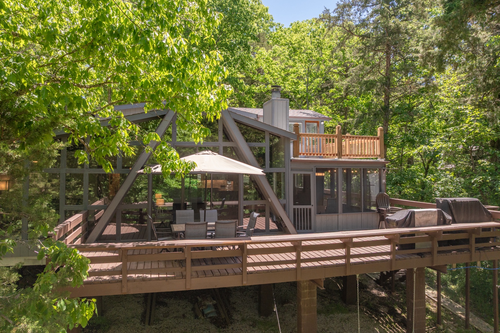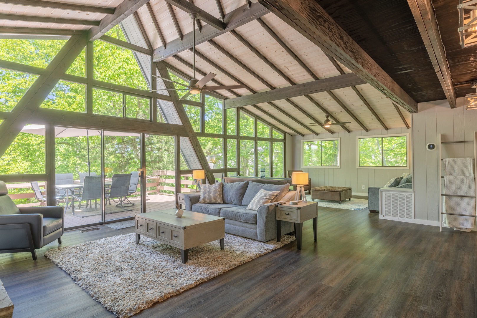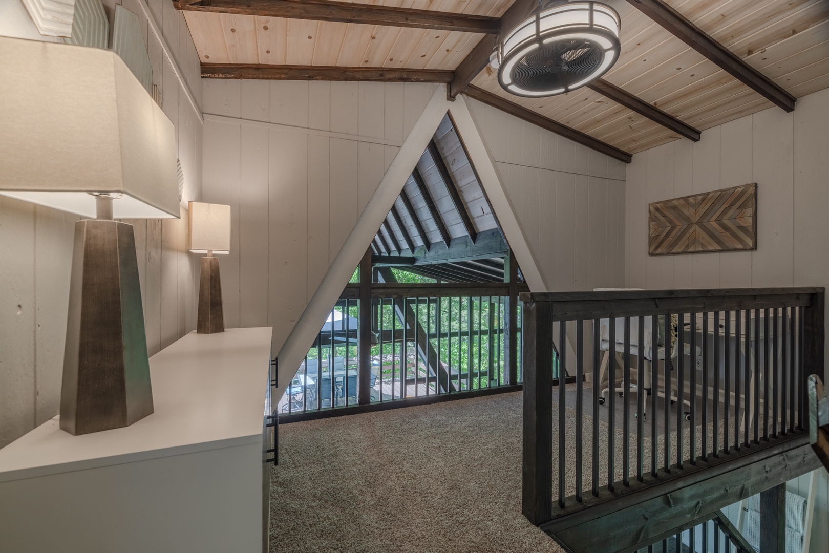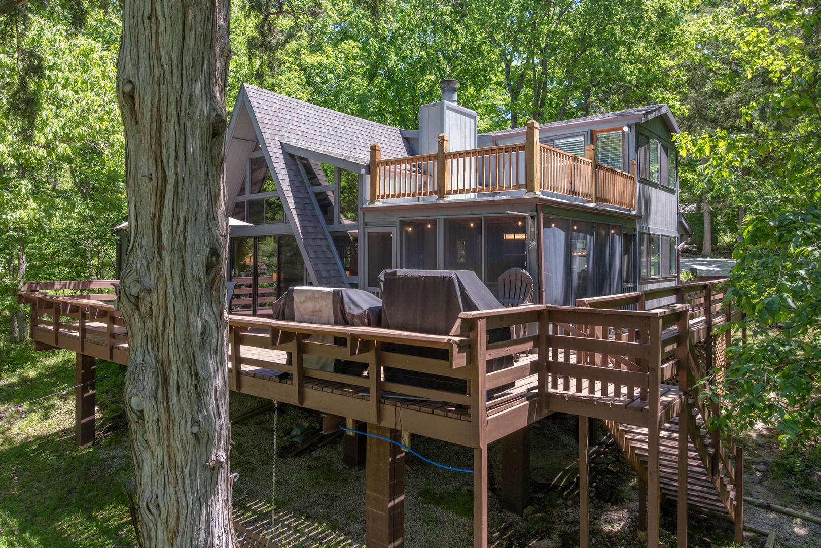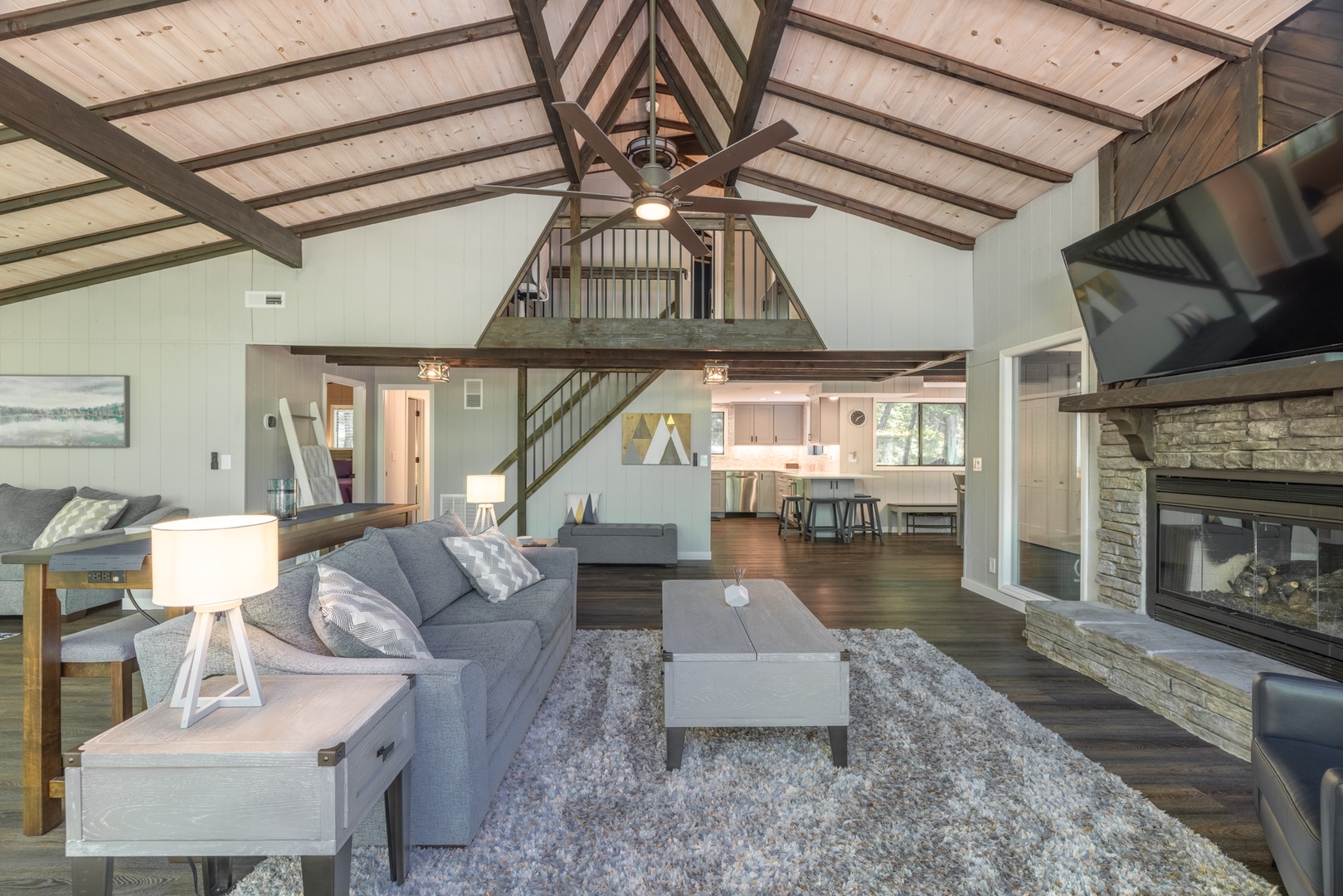 Step outside to enjoy the screened-in porch, a loft balcony overlooking the property, and a sprawling deck with outdoor furniture and a gas grill—perfect for morning coffee or sunset dinners. Down below, unwind on the porch swing or gather around the outdoor fire pit under the stars. For lake lovers, a private dock and lakeside seating await, along with water toys to enjoy endless fun on the water. Plus, you're just a 5-minute walk to the popular Lionshead Beach.