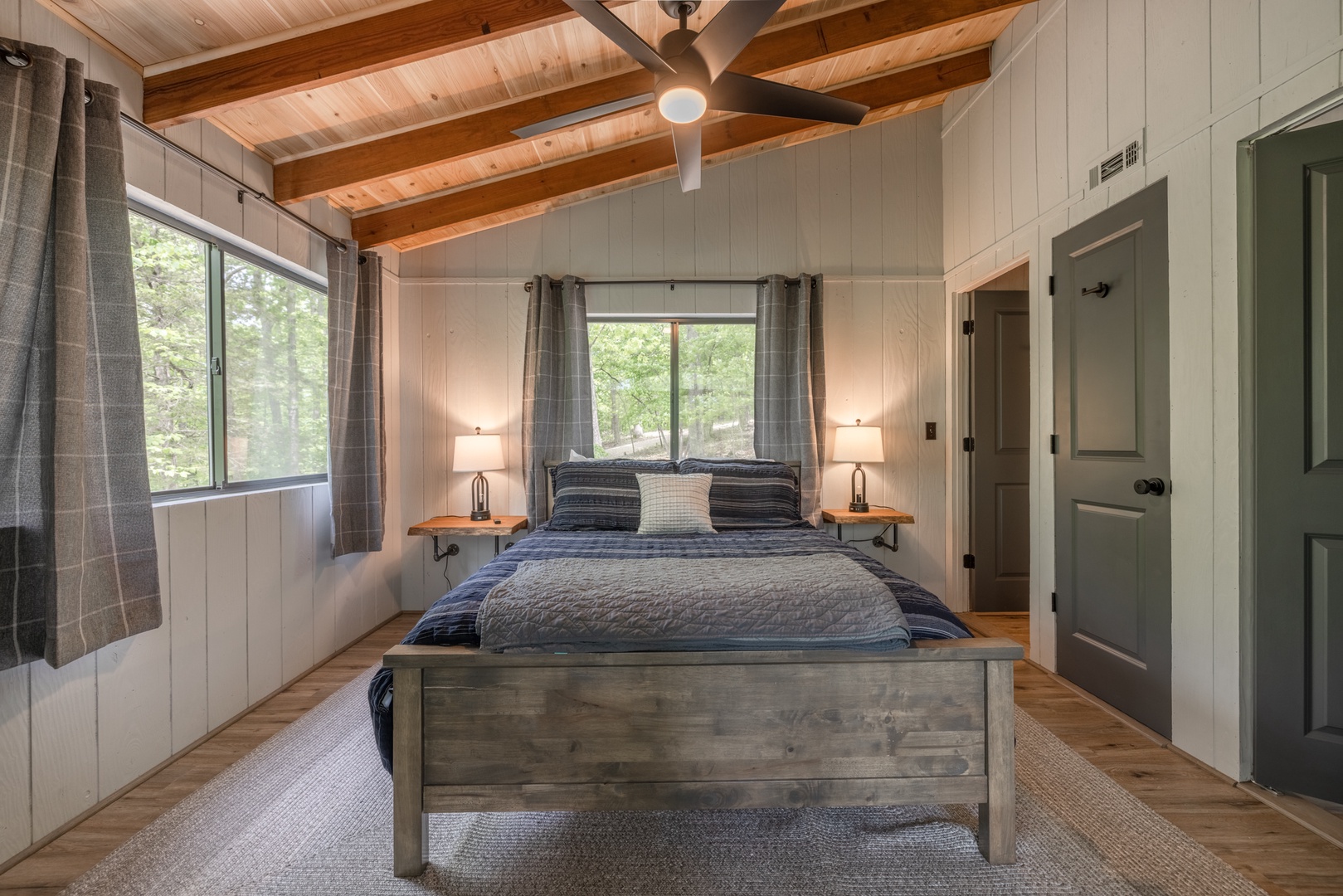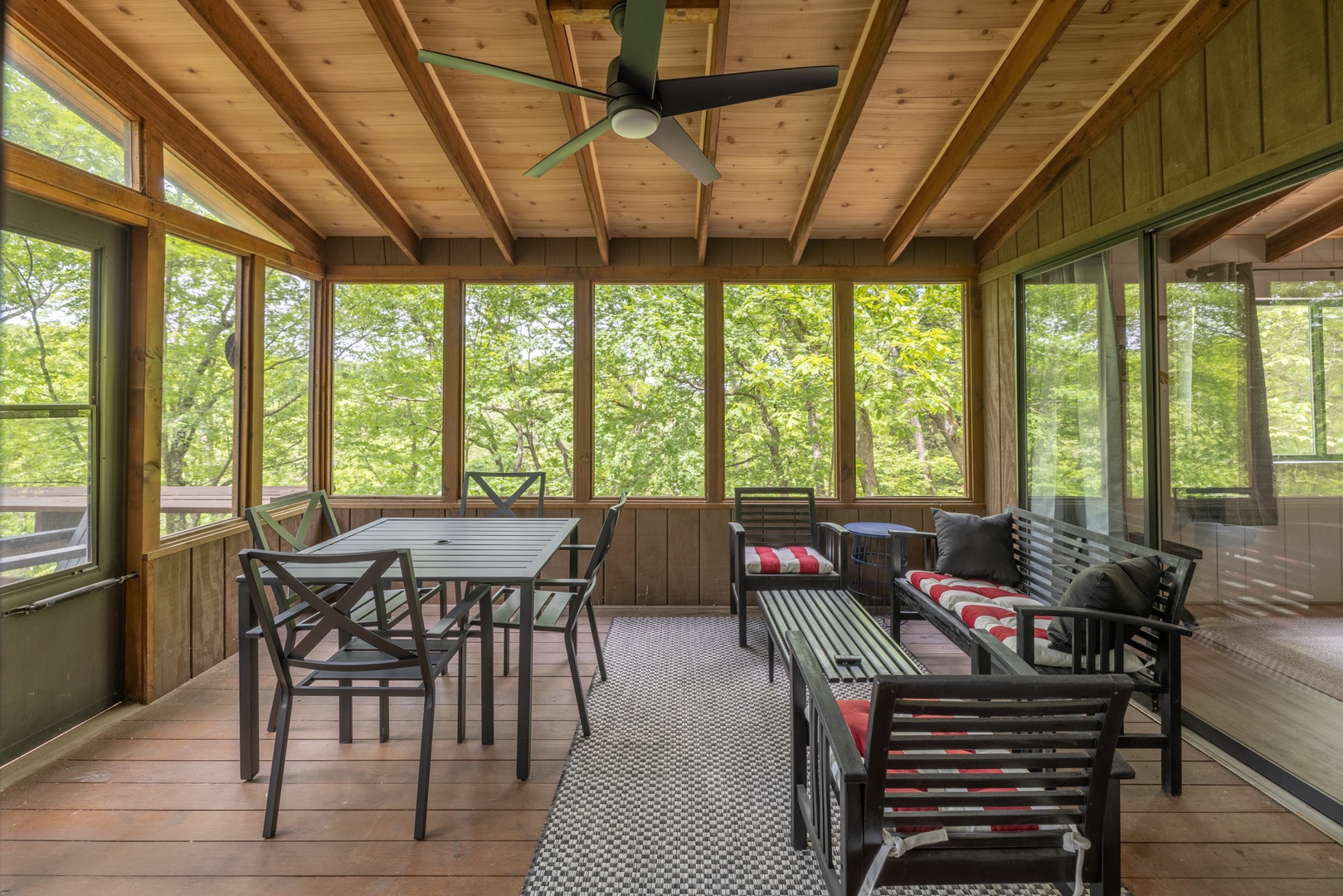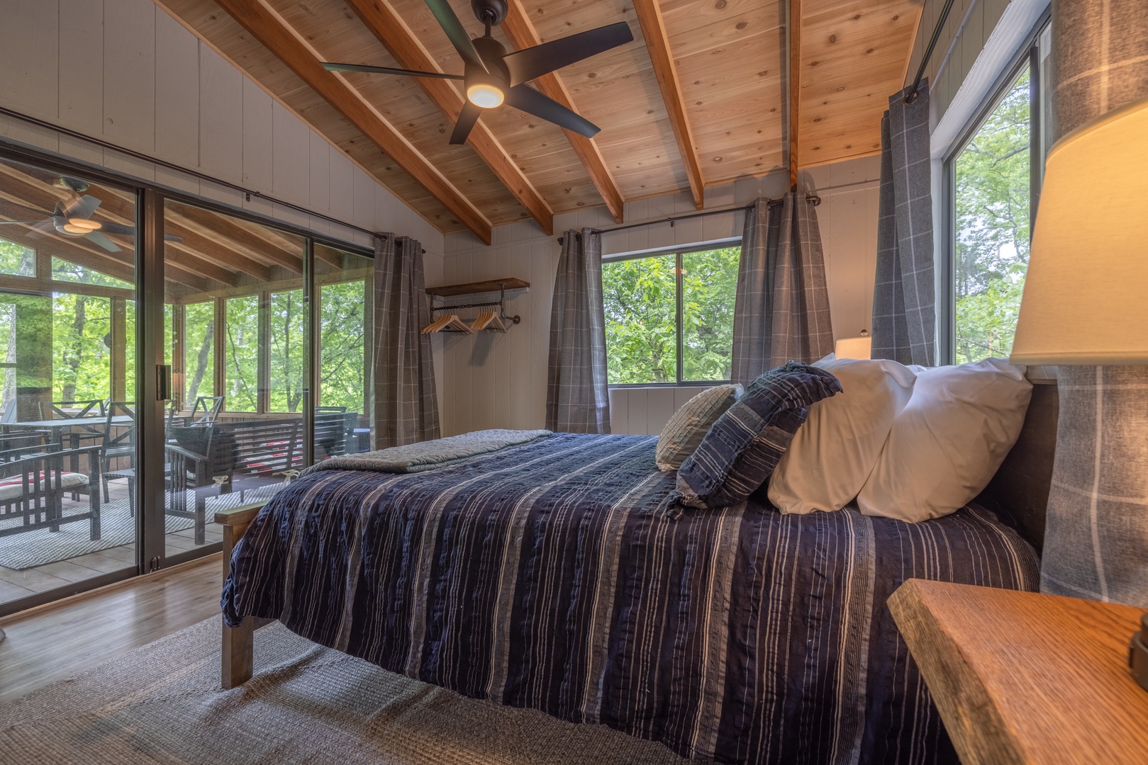 • Private primary bedroom on the main level with one queen-sized bed, sliding glass doors to the screened-in porch, and easy access to the full bath