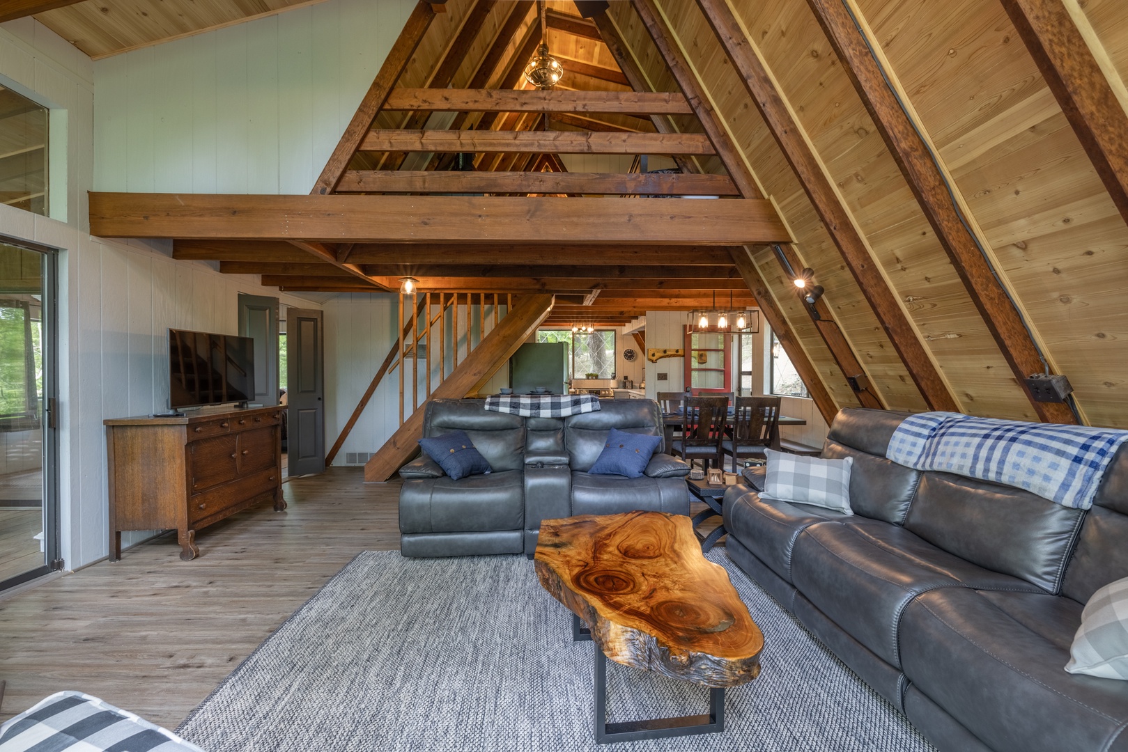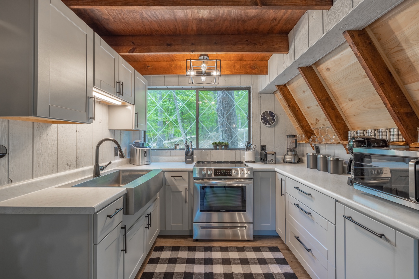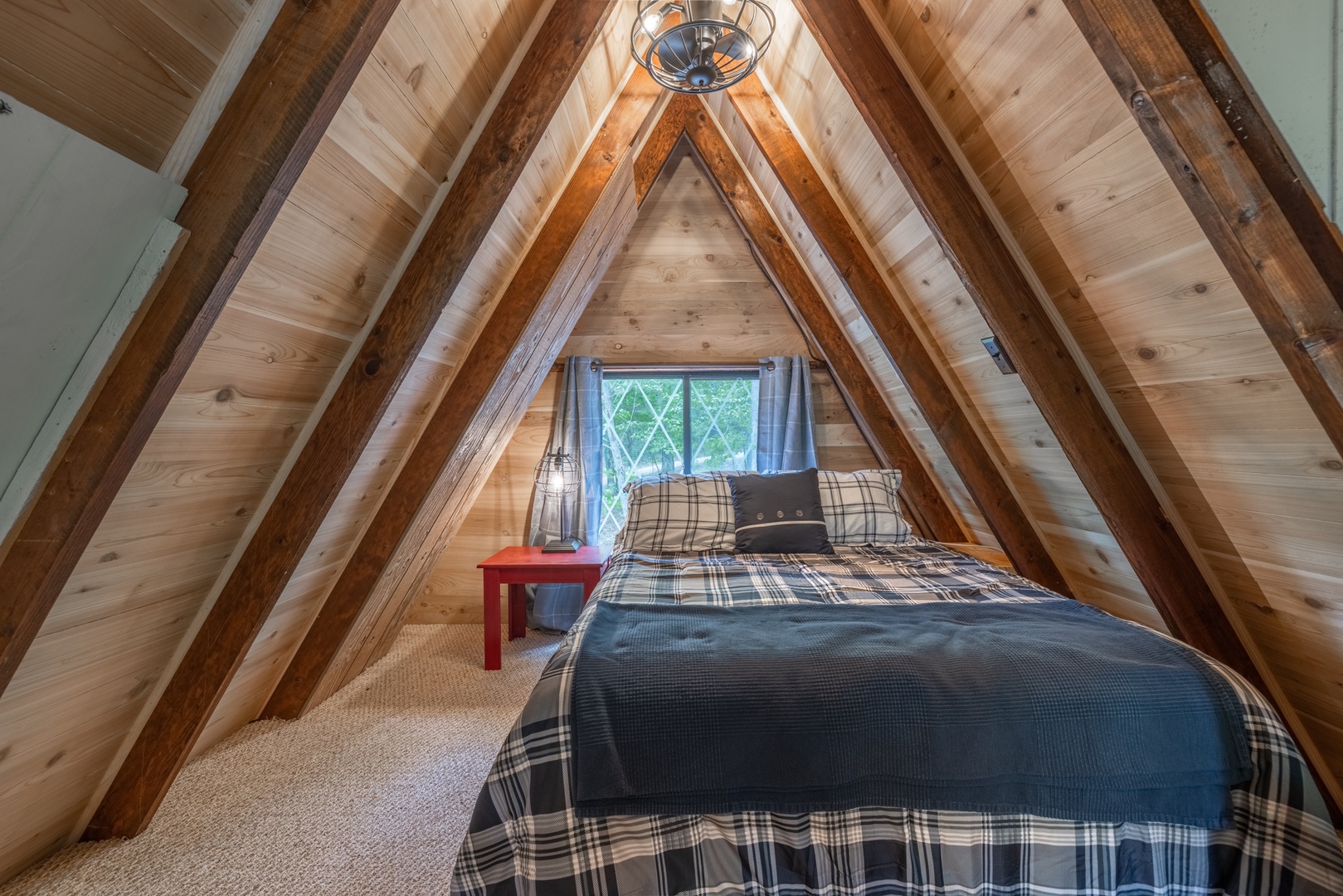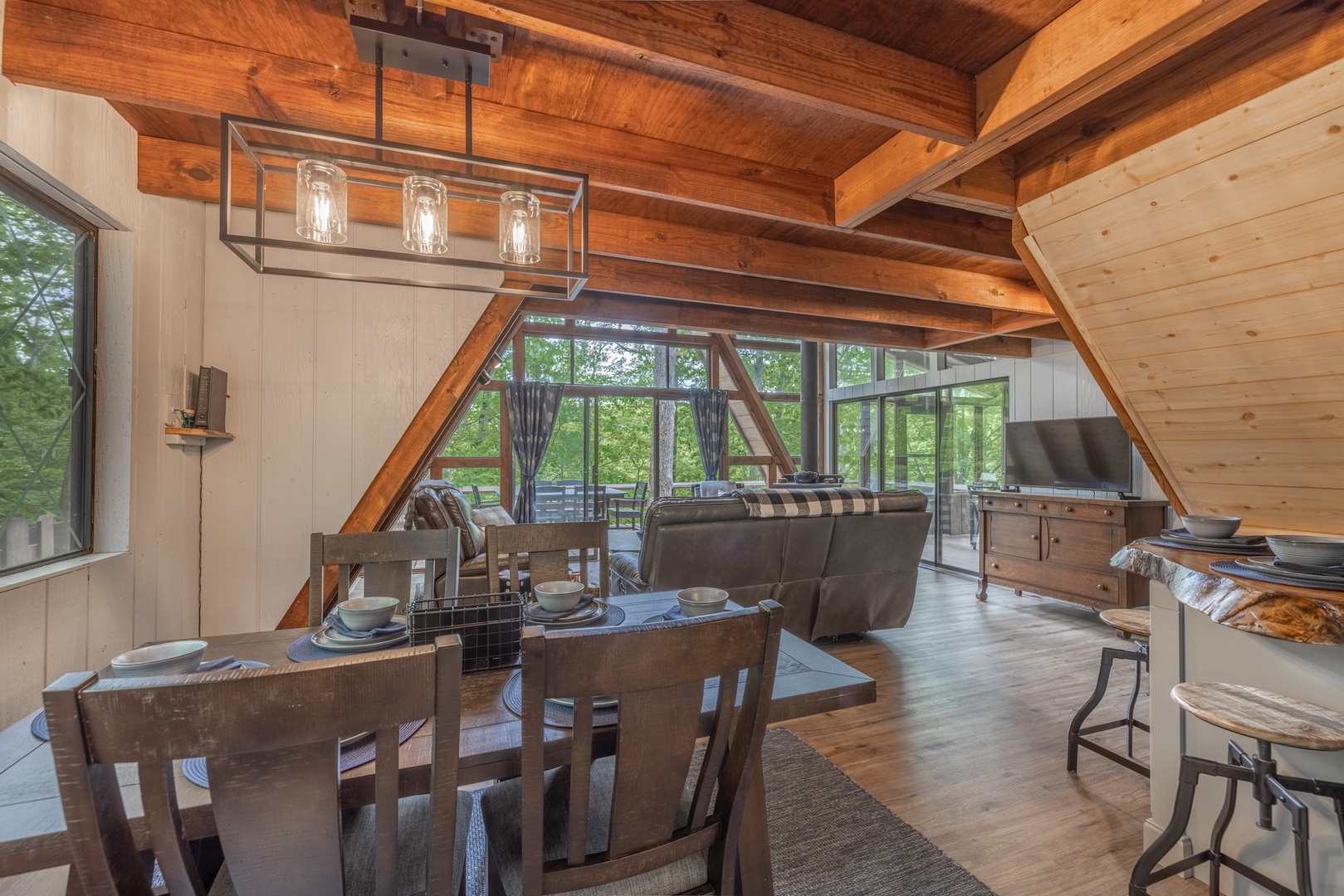 This chalet comfortably accommodates up to 8 guests with one bedroom, bathroom, and an upstairs loft with additional sleeping space. Enjoy time in the spacious living room with vaulted ceilings and a wood burning fire place, or open the sliding glass doors to the screened in porch for panoramic views of the surrounding wooded wonderland. The recently updated kitchen sparkles with custom cabinetry, all new stainless steel appliances, and is fully equipped with everything you need for all of your meal preparations!