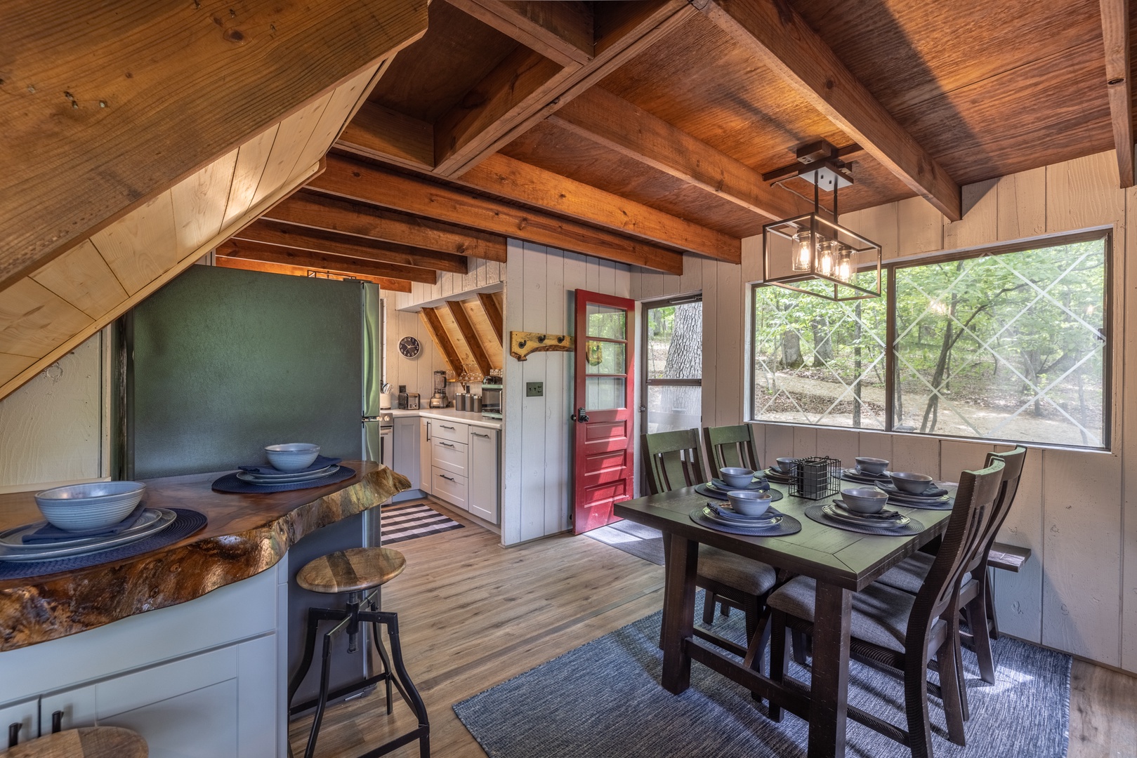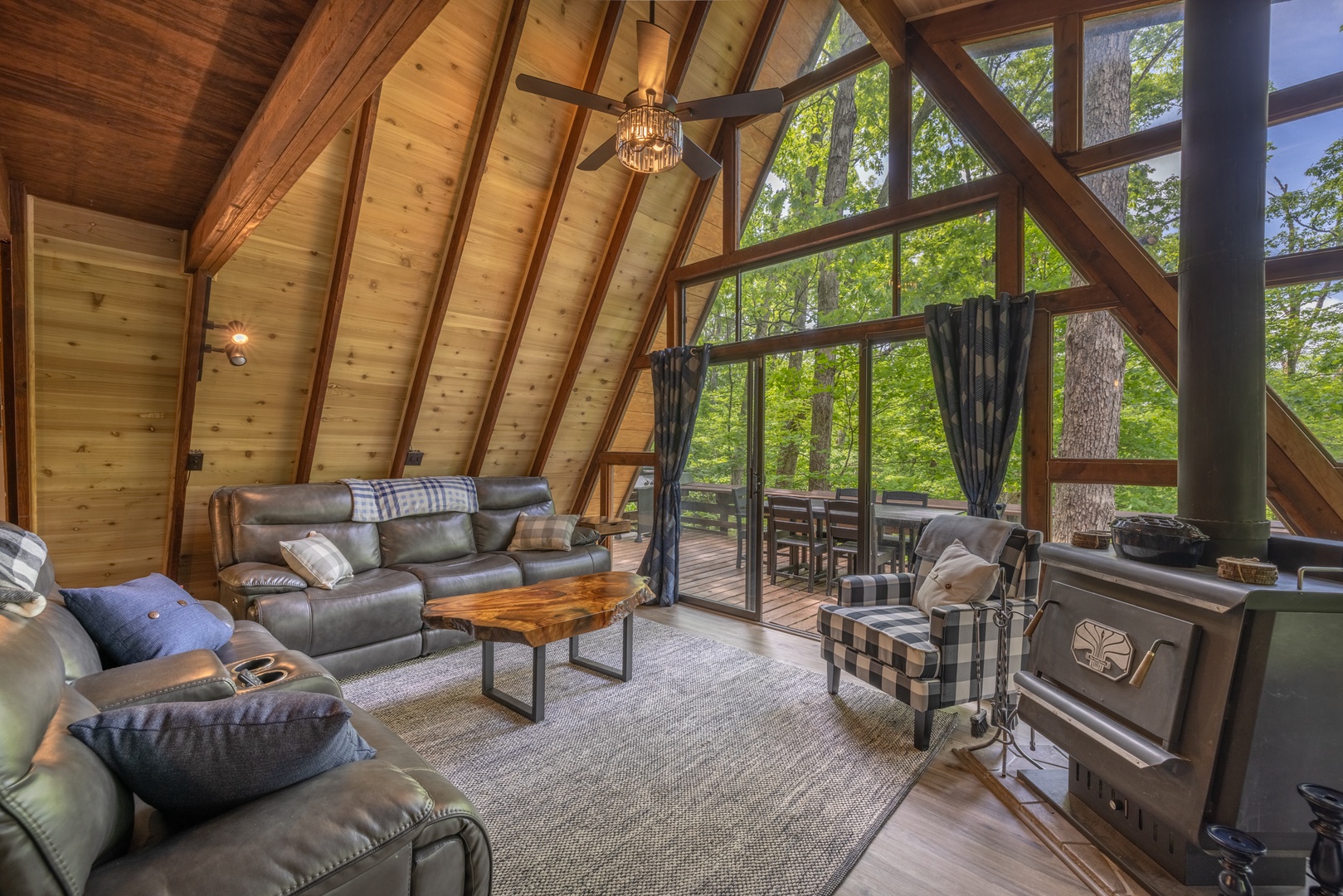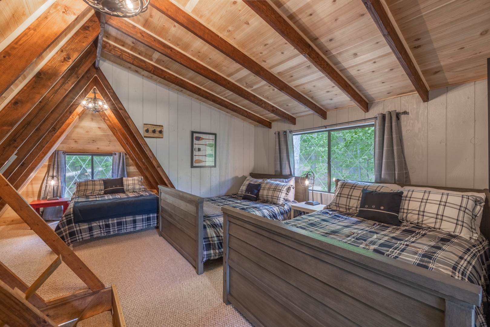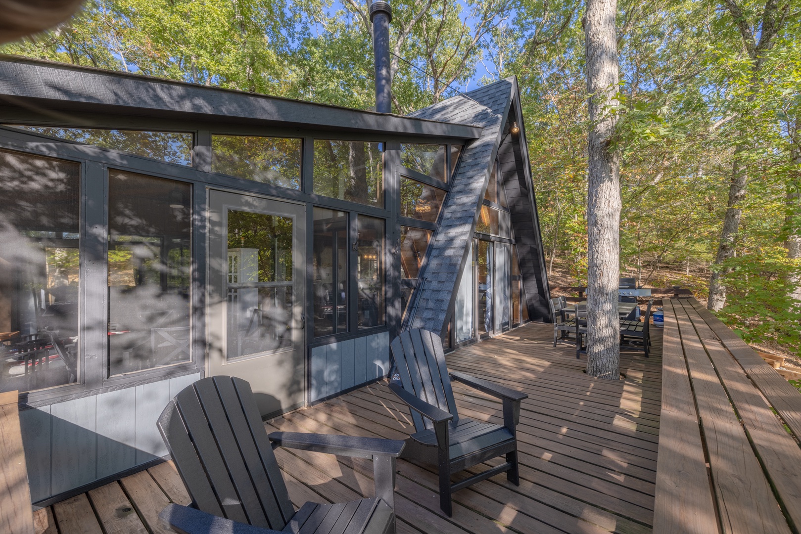 This chalet comfortably accommodates up to 8 guests with one bedroom, bathroom, and an upstairs loft with additional sleeping space. Enjoy time in the spacious living room with vaulted ceilings and a wood burning fire place, or open the sliding glass doors to the screened in porch for panoramic views of the surrounding wooded wonderland. The recently updated kitchen sparkles with custom cabinetry, all new stainless steel appliances, and is fully equipped with everything you need for all of your meal preparations!