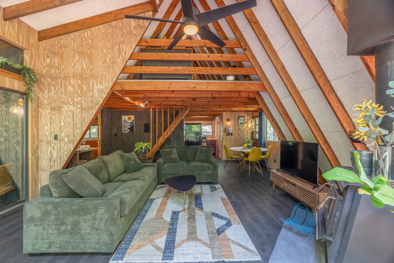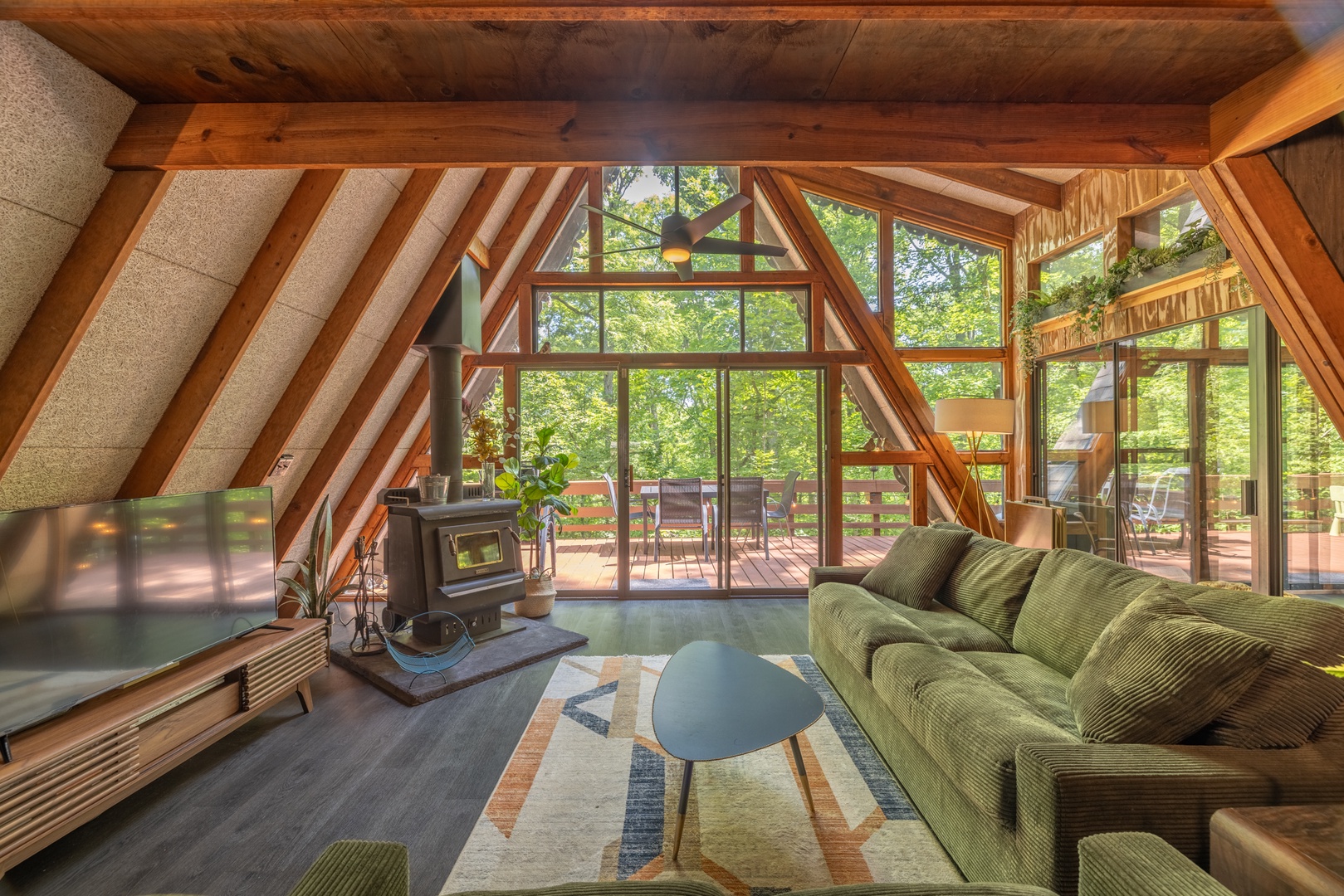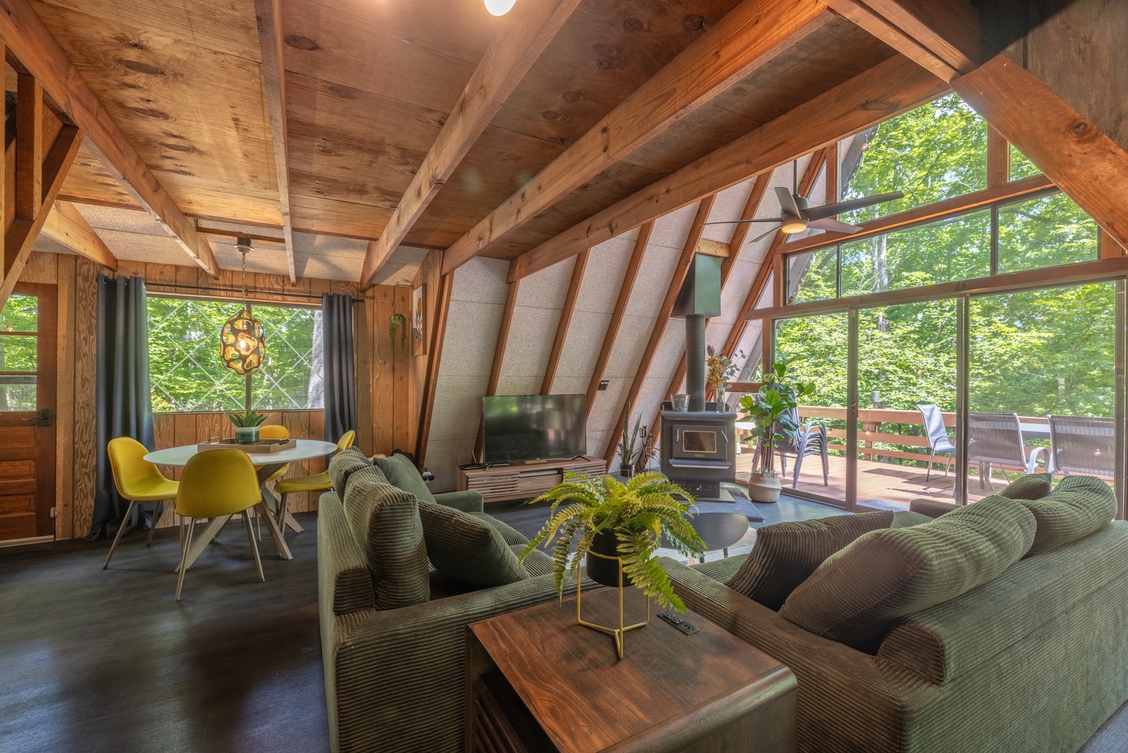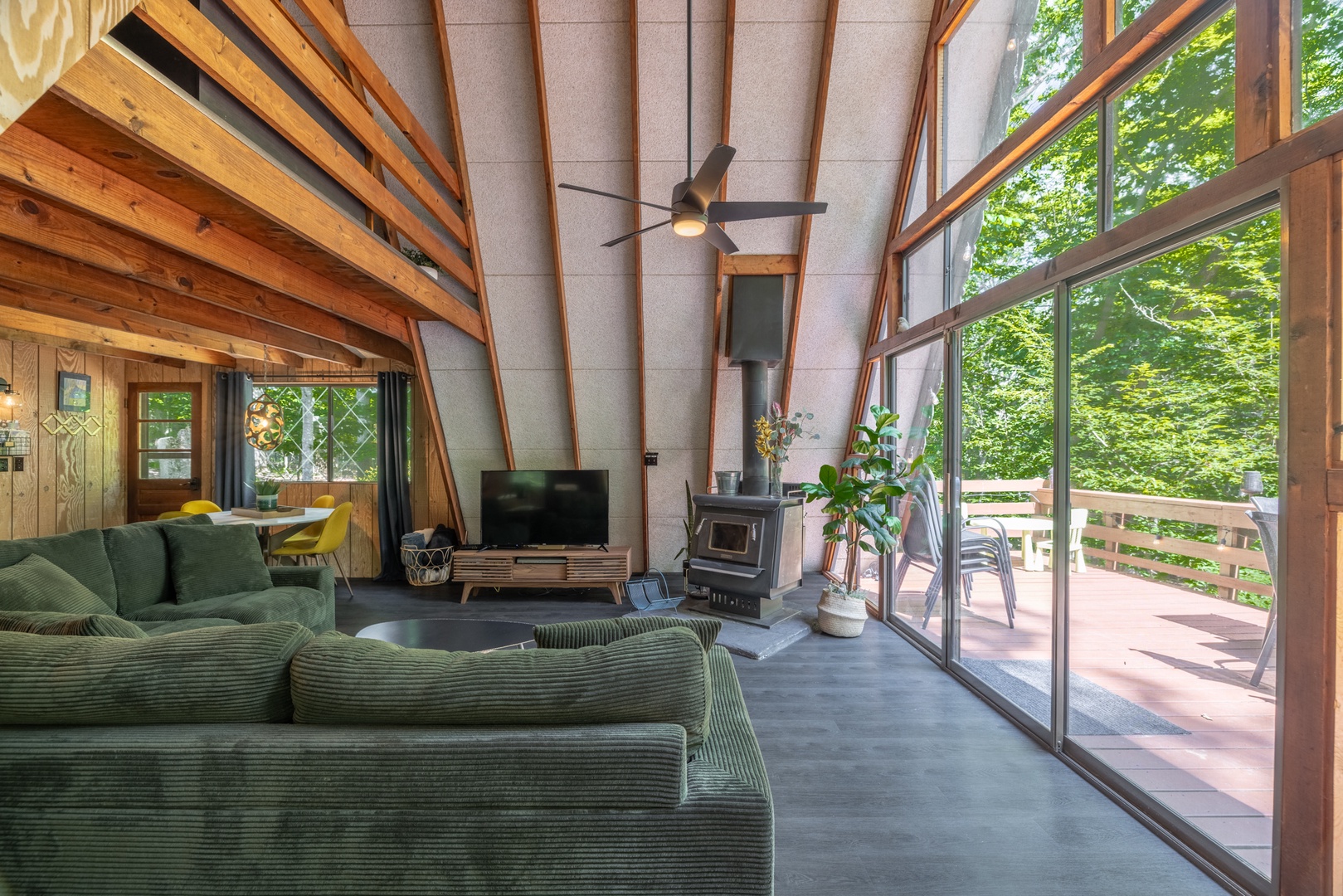 • Roomy living area with wood-burning fireplace, oversized furniture, and sliding glass doors to the back deck