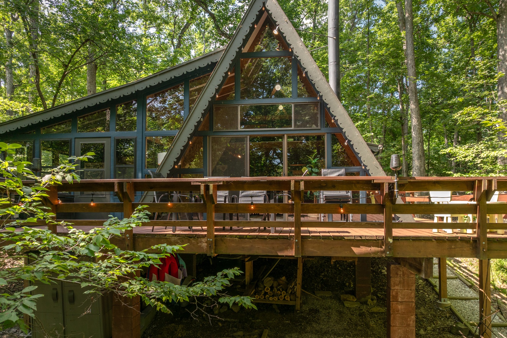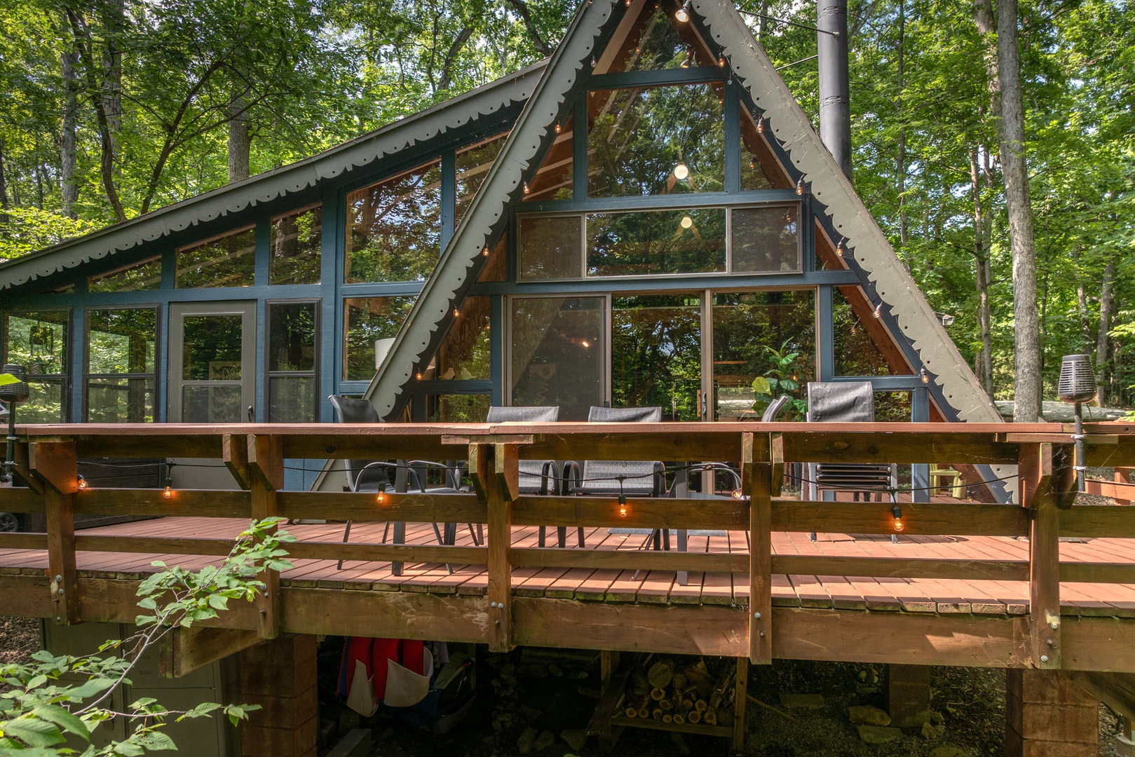 Newly updated with charming, vintage decor, this tree-house inspired chalet is a prized Innsbrook vacation rental find. A wall of floor-to-ceiling windows bring in soft natural lighting, while a three-season room provides additional living space with a spectacular view of the outdoors. The open floor plan outfitted with vaulted, wood-beamed ceilings allows for a cozy, yet spacious interior, complete with an oversized wood-burning fireplace. An expansive deck welcomes enough space for amazing entertaining or peaceful relaxation and offers privileged access to a grilling area and outdoor fire pit! Set the stage for a laidback tranquil lifestyle. The exclusive private location offers security within a gated community and premier access to all Innsbrook amenities.